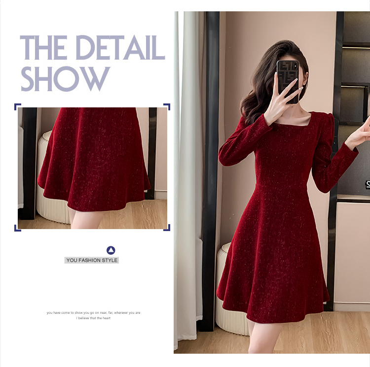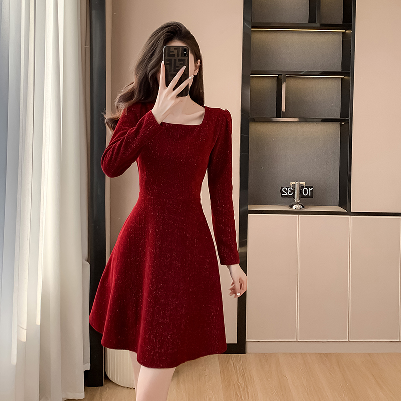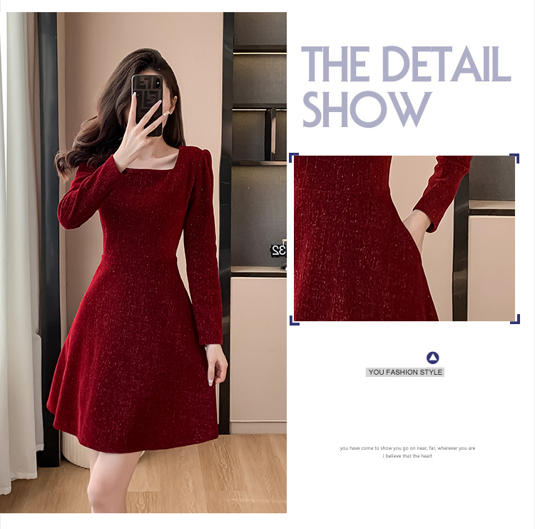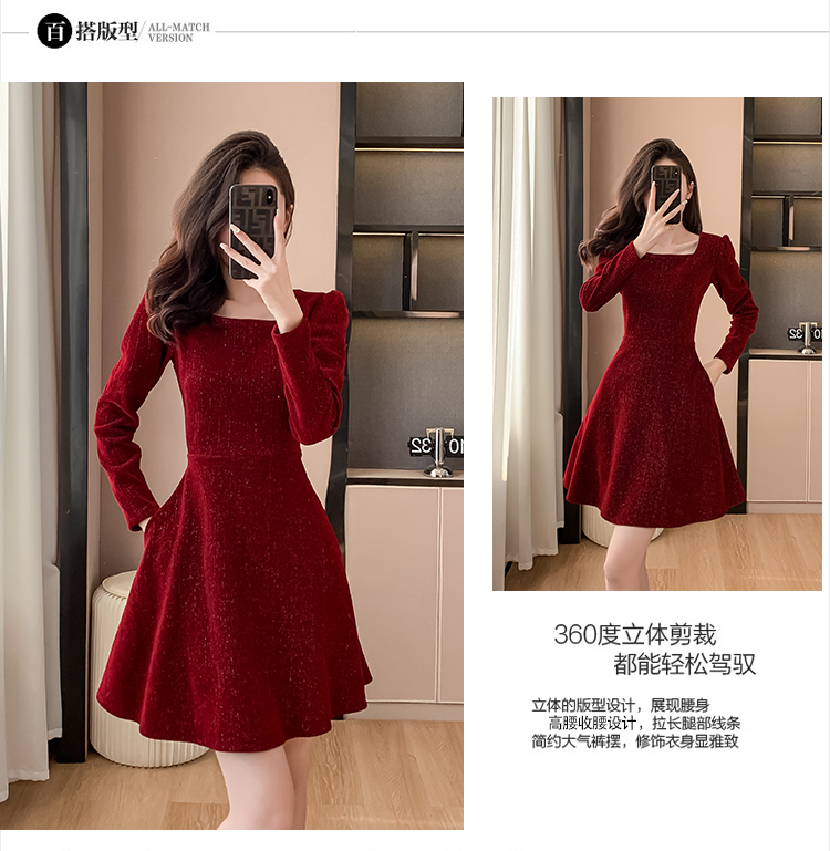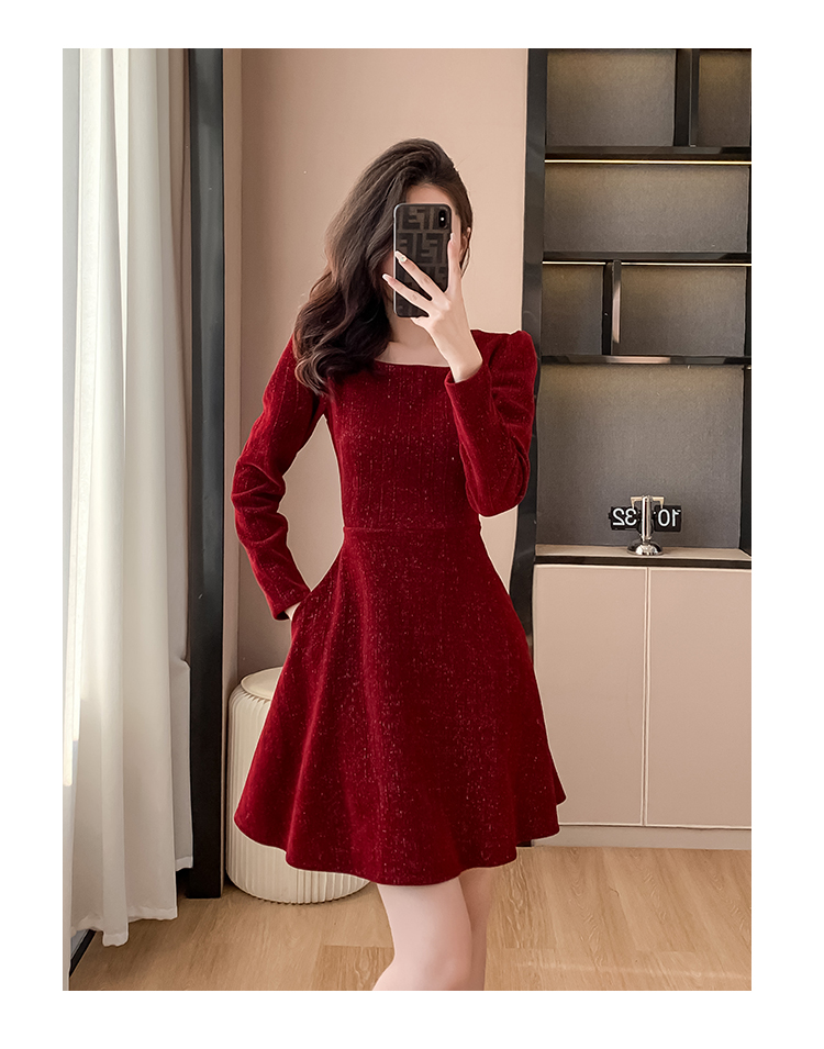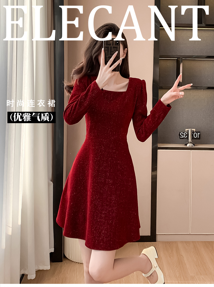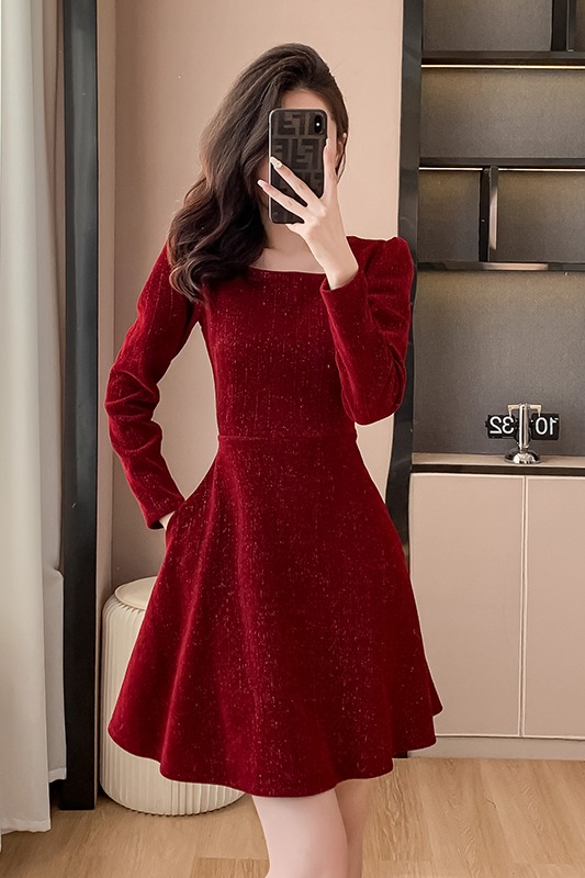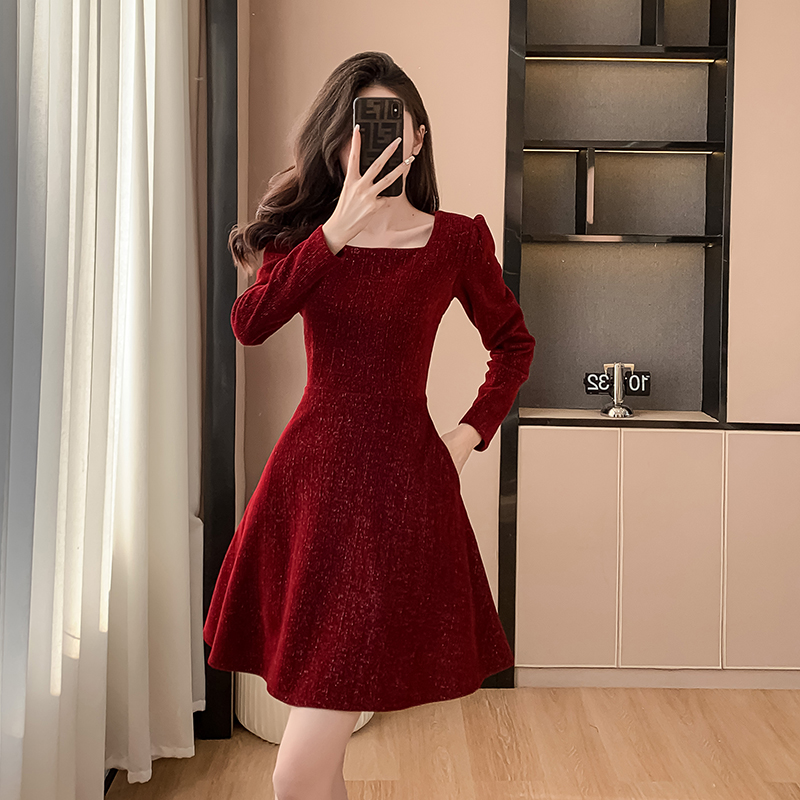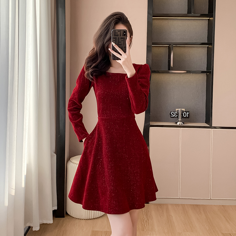 MY13915# 口袋法式时尚甜美气质长袖亮丝雪尼尔连衣裙酒红色洋气少女晚礼服女裝貨源服裝批發