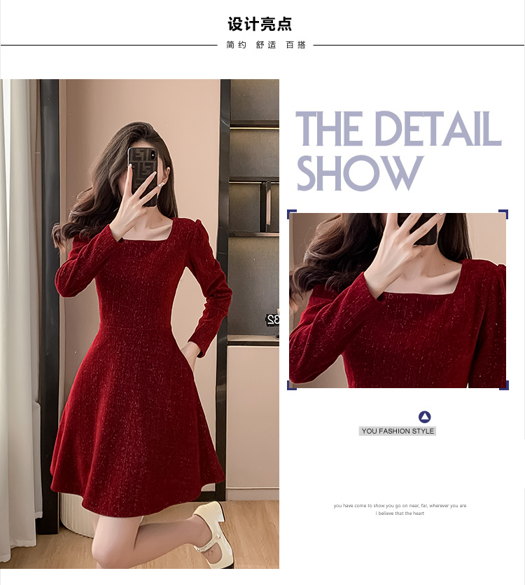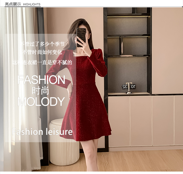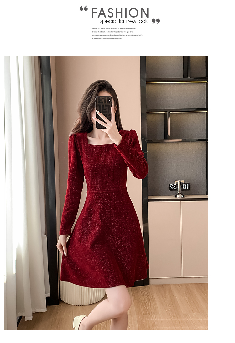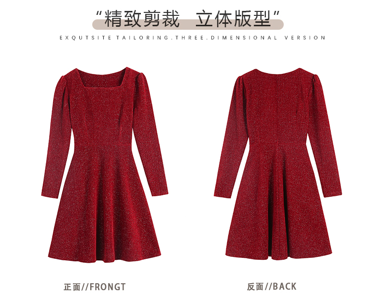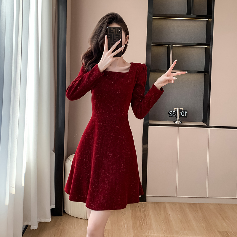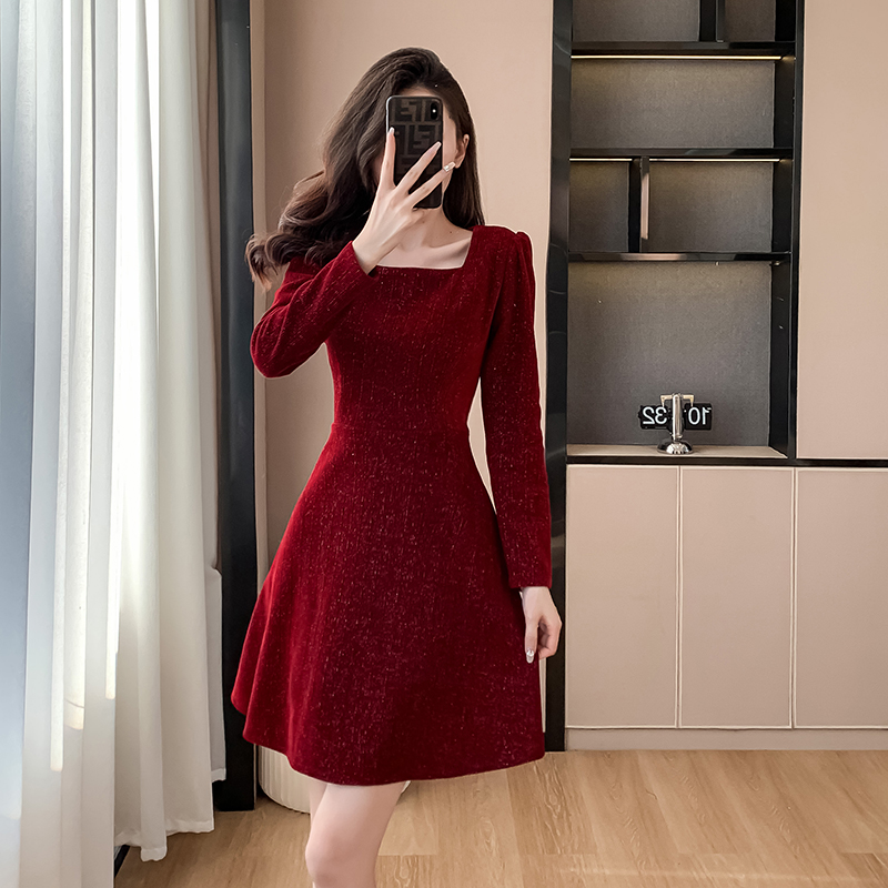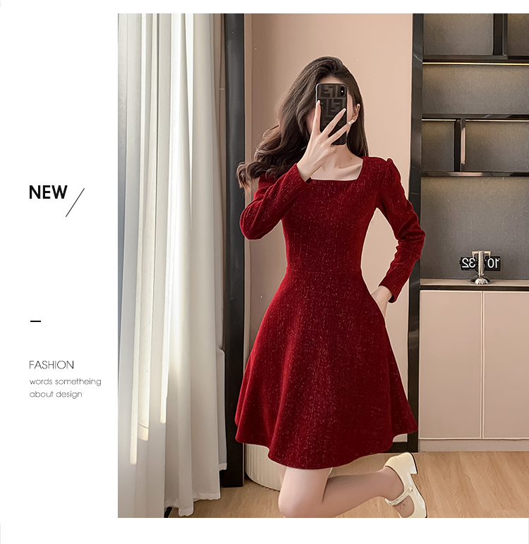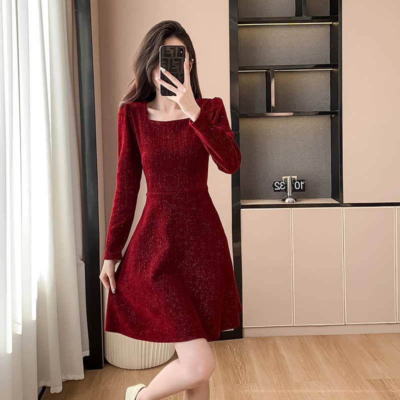 MY13915# 口袋法式时尚甜美气质长袖亮丝雪尼尔连衣裙酒红色洋气少女晚礼服女裝貨源服裝批發
