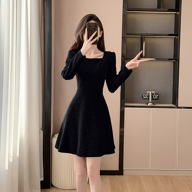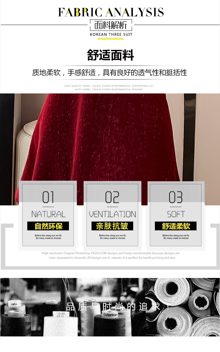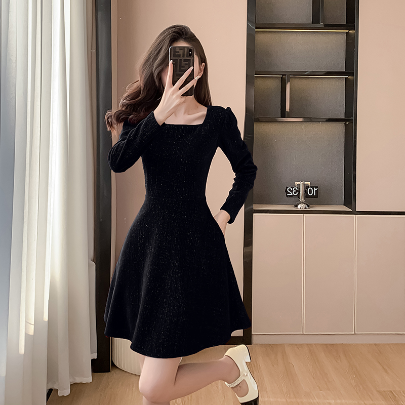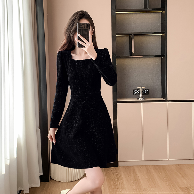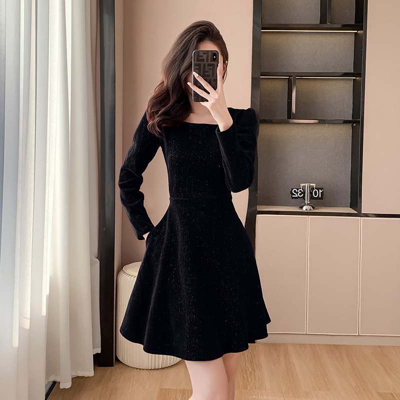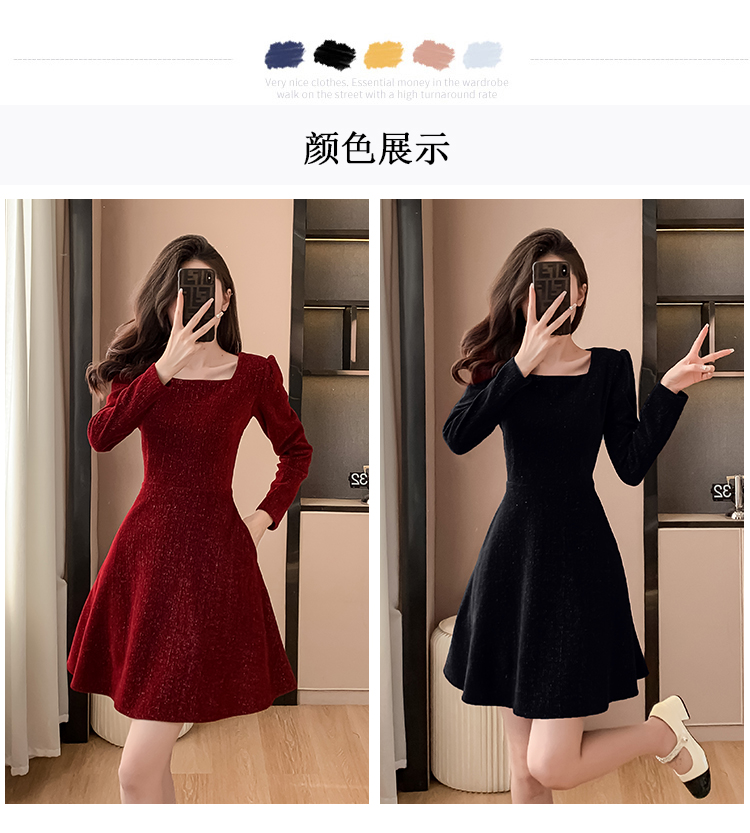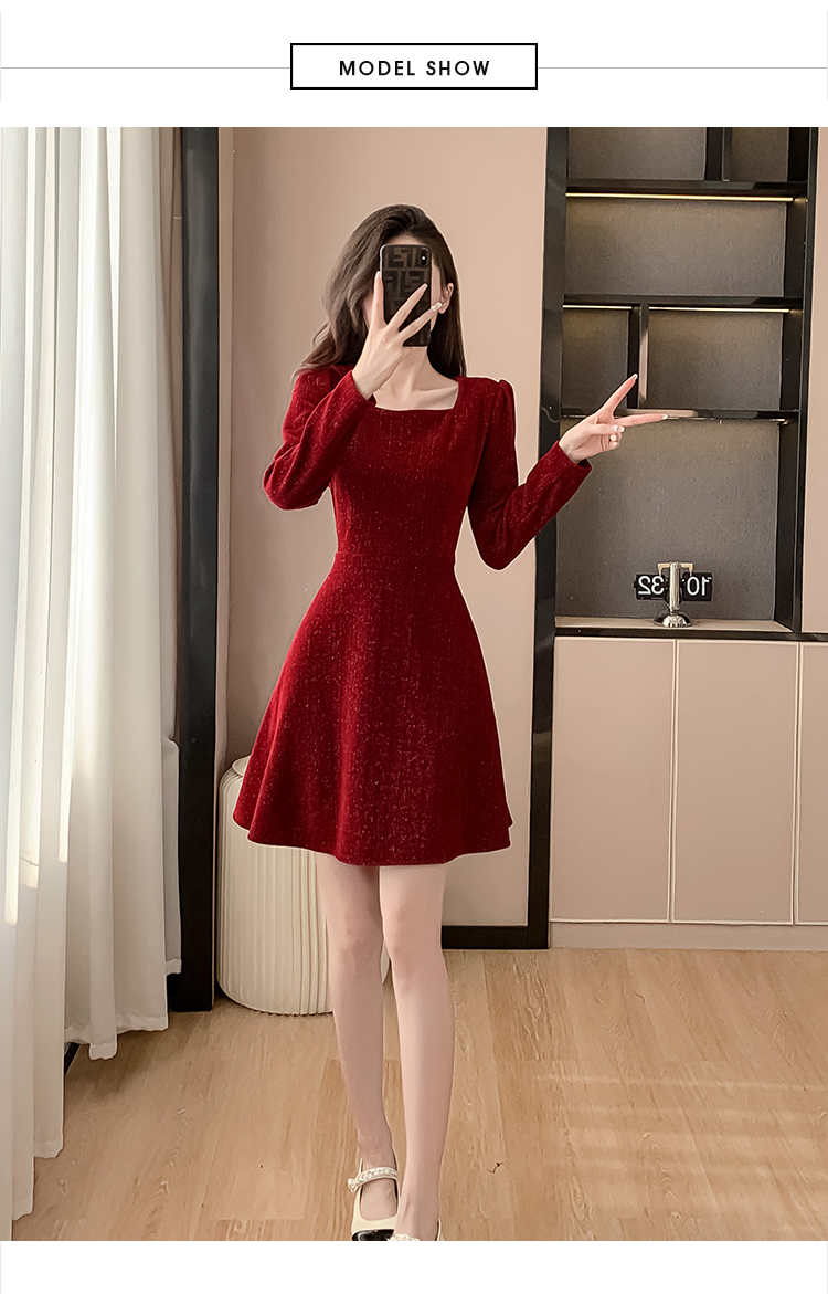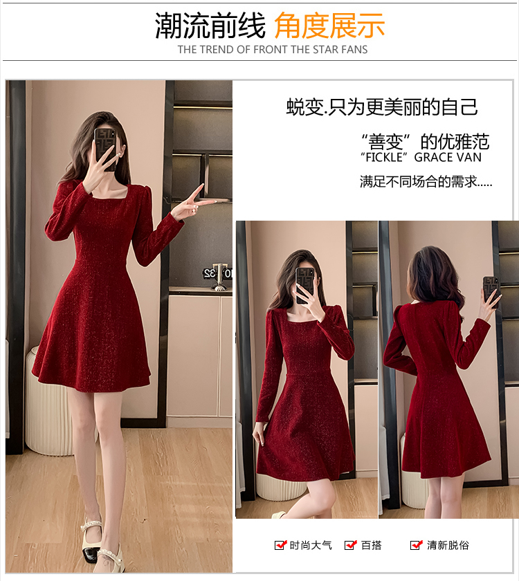 MY13915# 口袋法式时尚甜美气质长袖亮丝雪尼尔连衣裙酒红色洋气少女晚礼服女裝貨源服裝批發