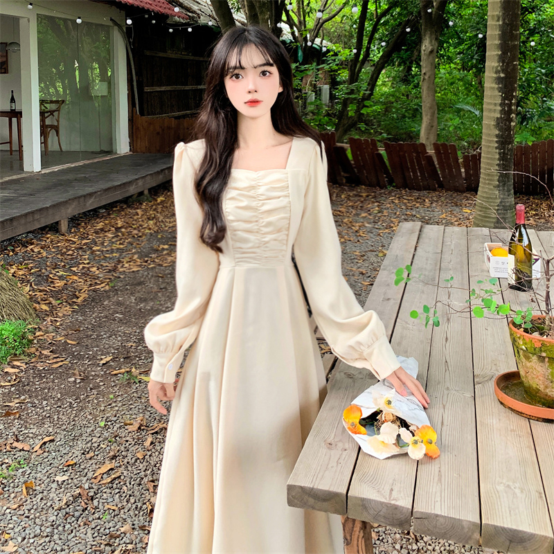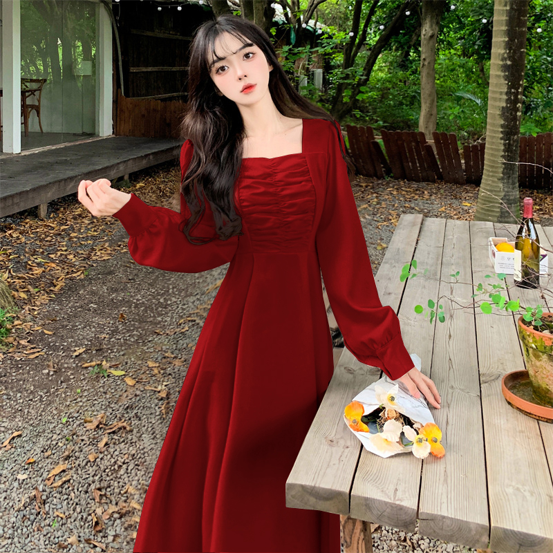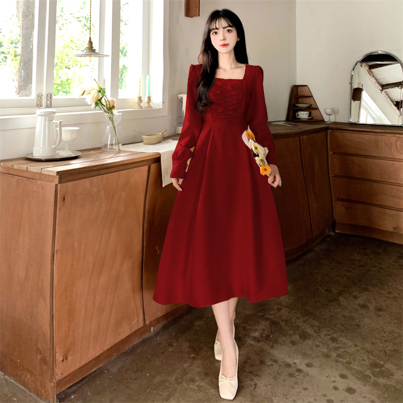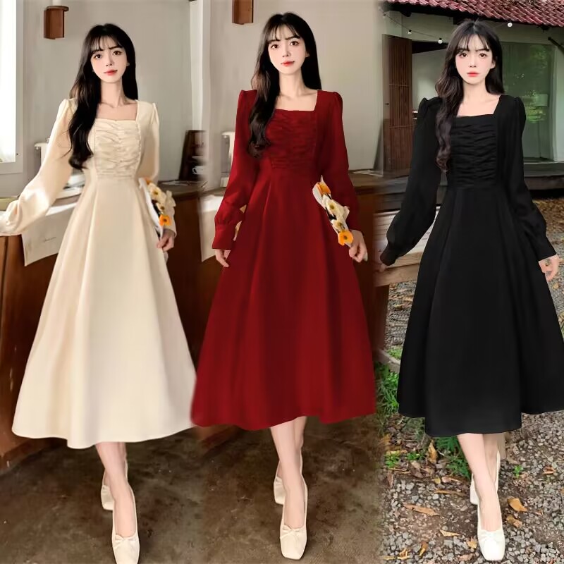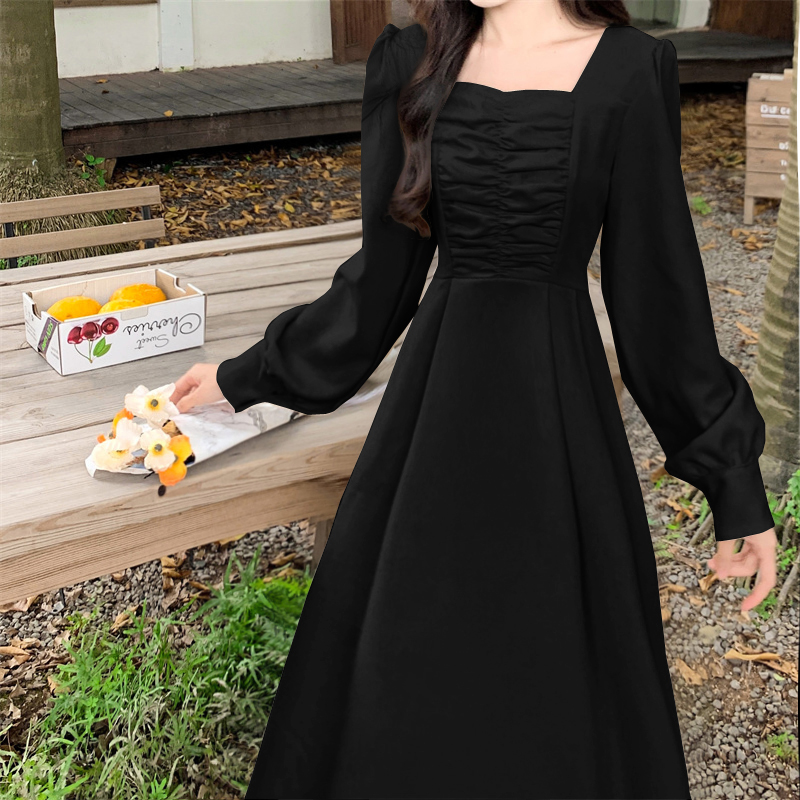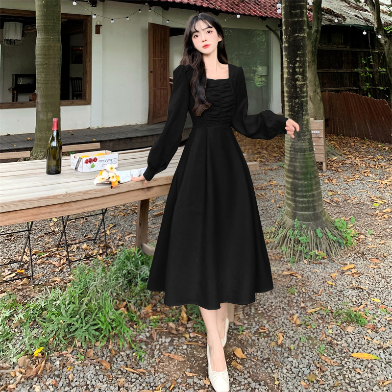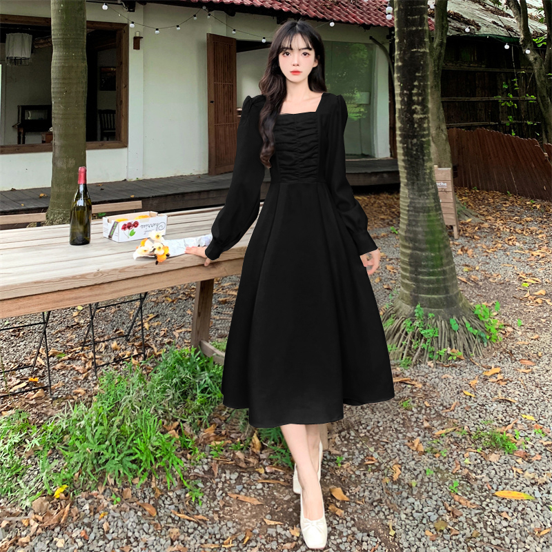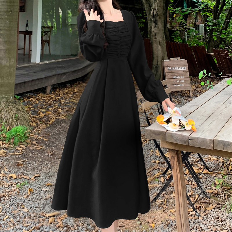MY13920# 高级感赫本黑色方领长袖连衣裙新款大码胖mm收腰显瘦垂感长裙女裝貨源服裝批發