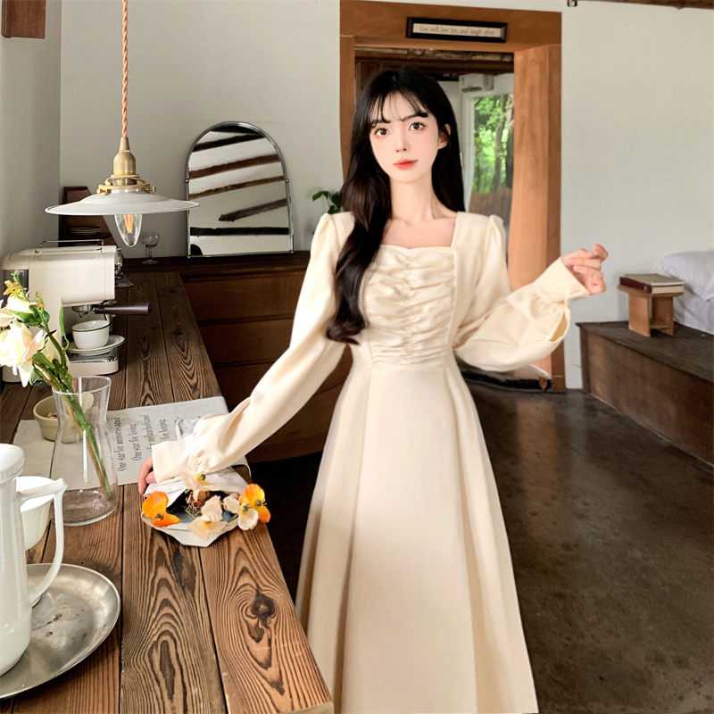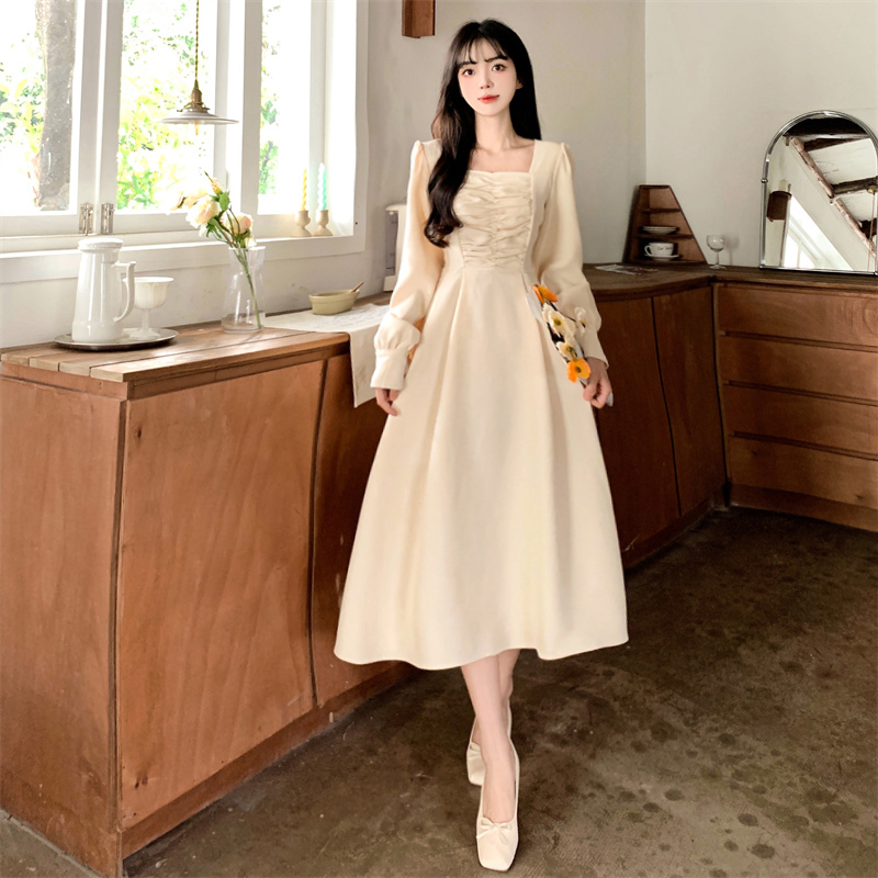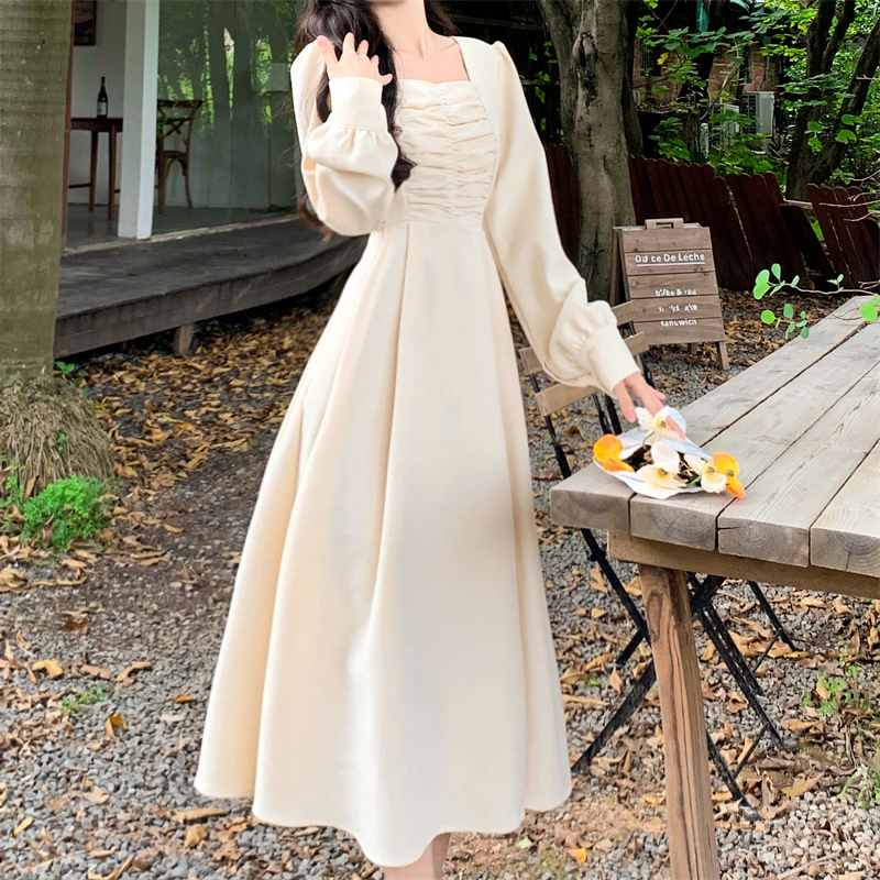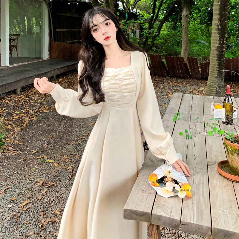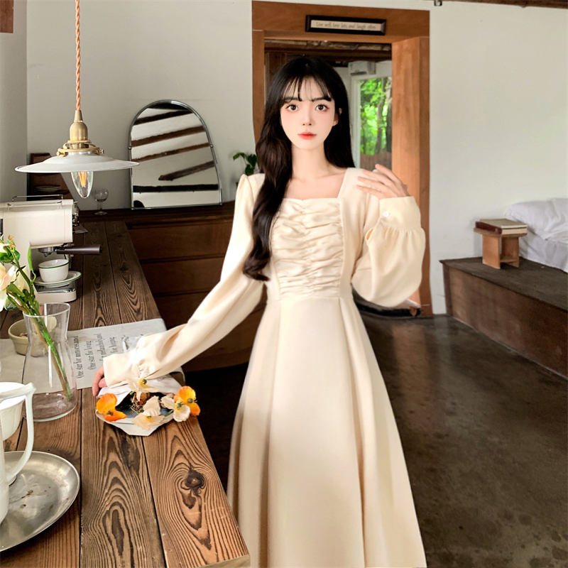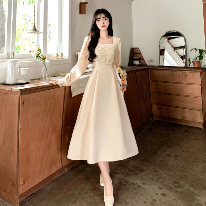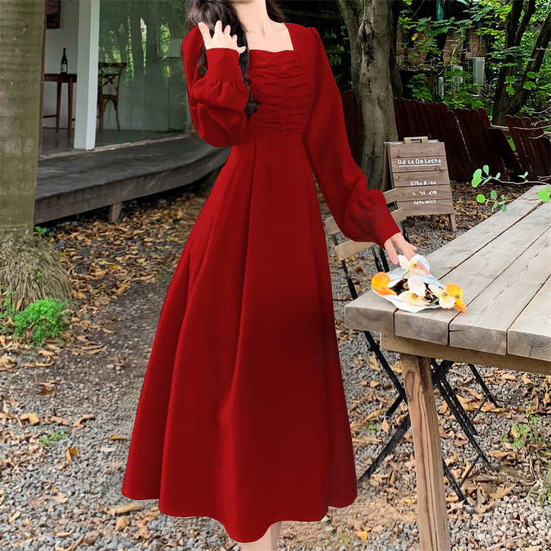 MY13920# 高级感赫本黑色方领长袖连衣裙新款大码胖mm收腰显瘦垂感长裙女裝貨源服裝批發