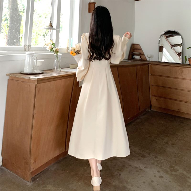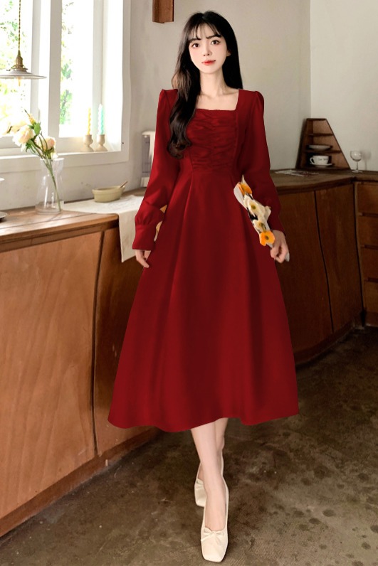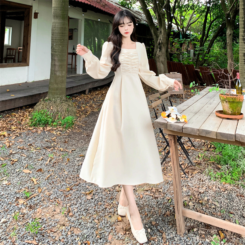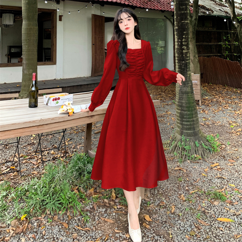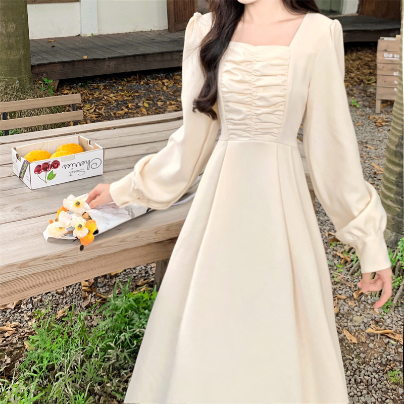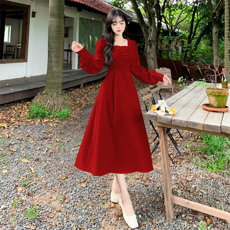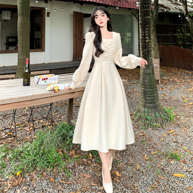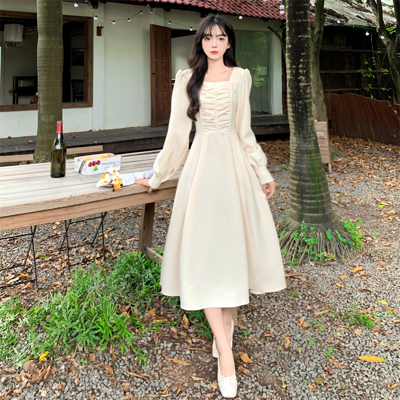MY13920# 高级感赫本黑色方领长袖连衣裙新款大码胖mm收腰显瘦垂感长裙女裝貨源服裝批發