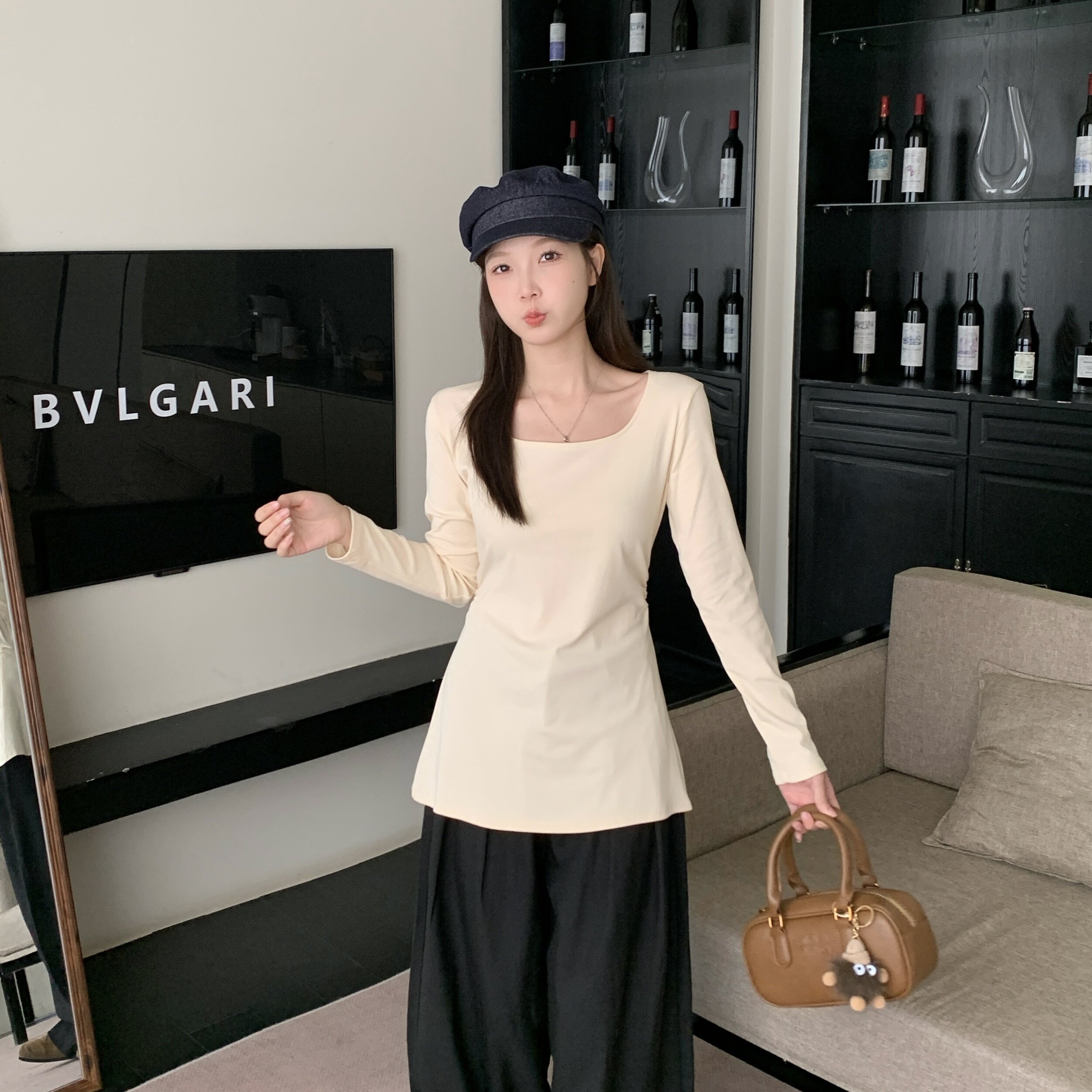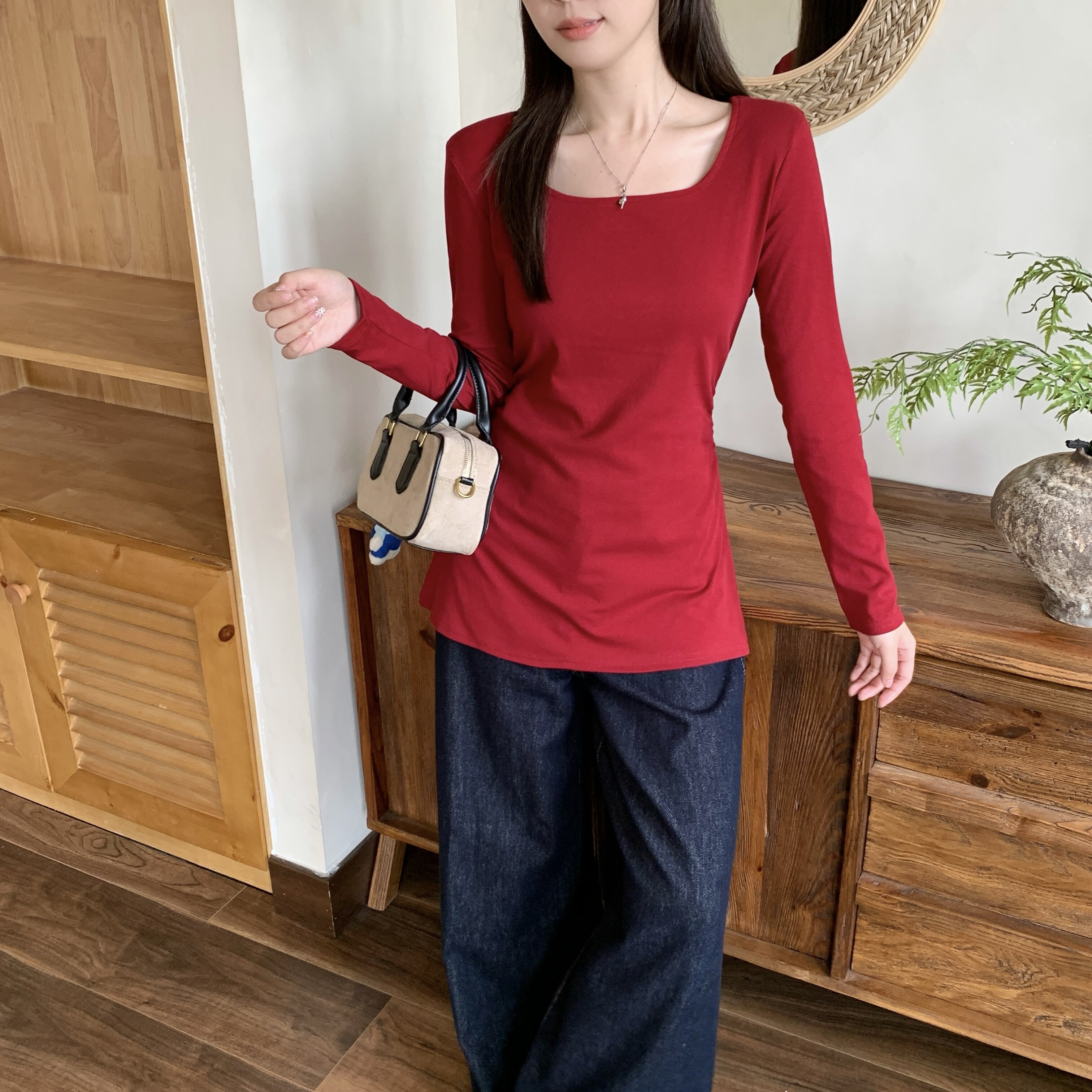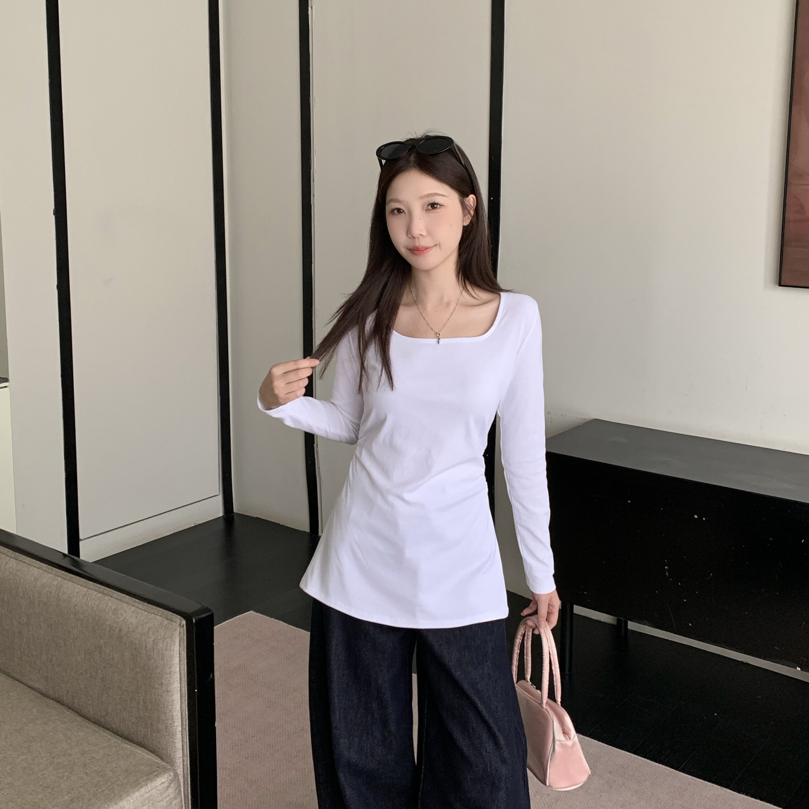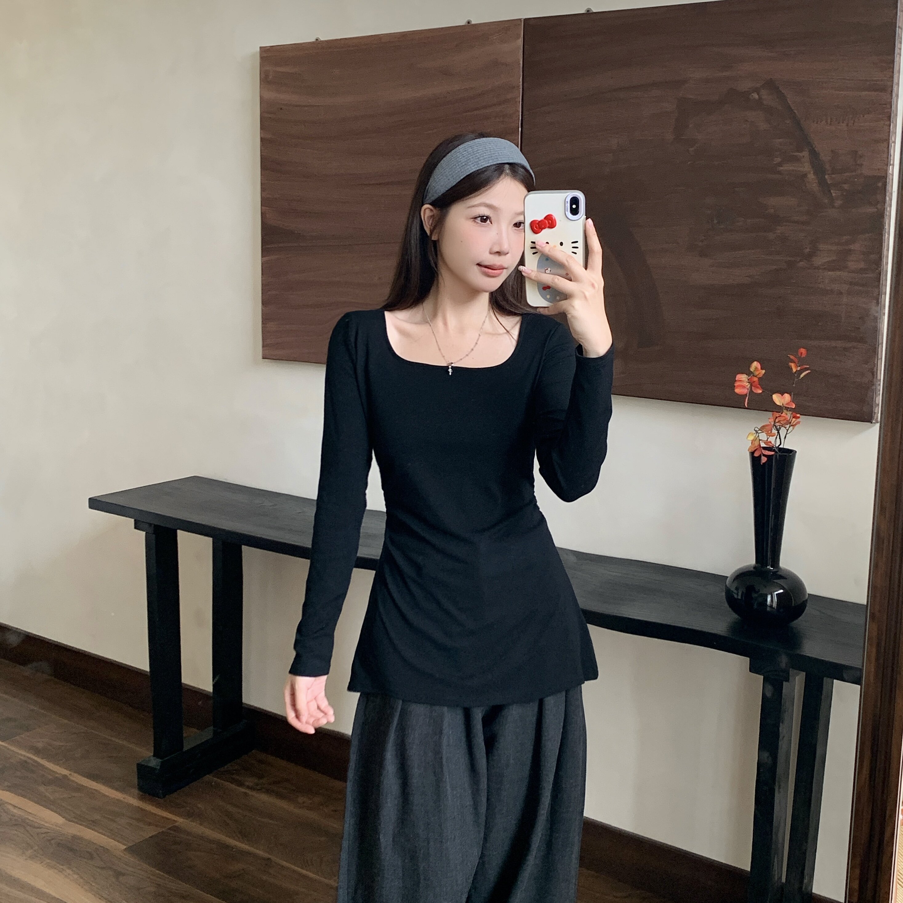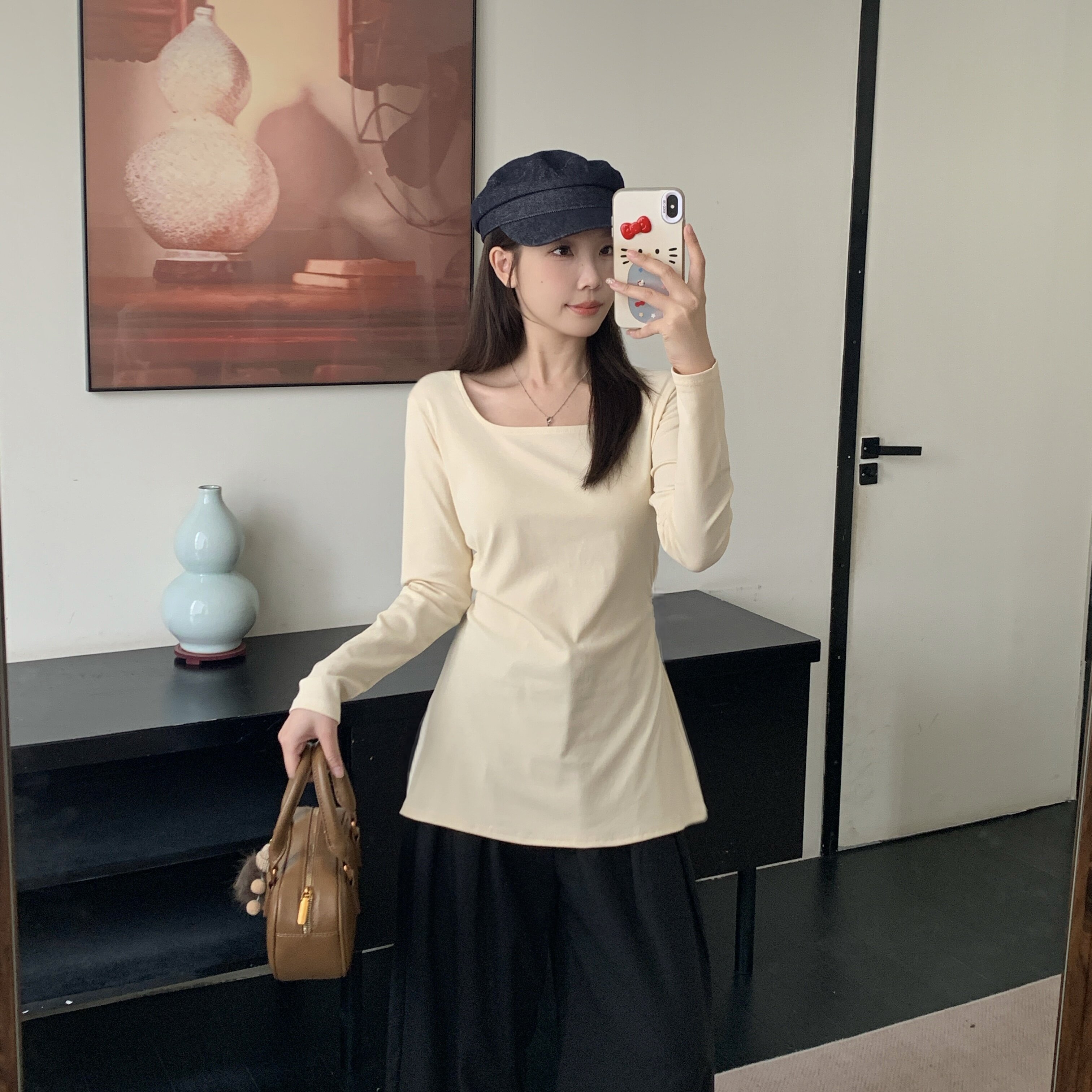 MY13938# 胖mm大码正肩方领遮肚显瘦中长款百搭长袖打底衫女裝貨源服裝批發