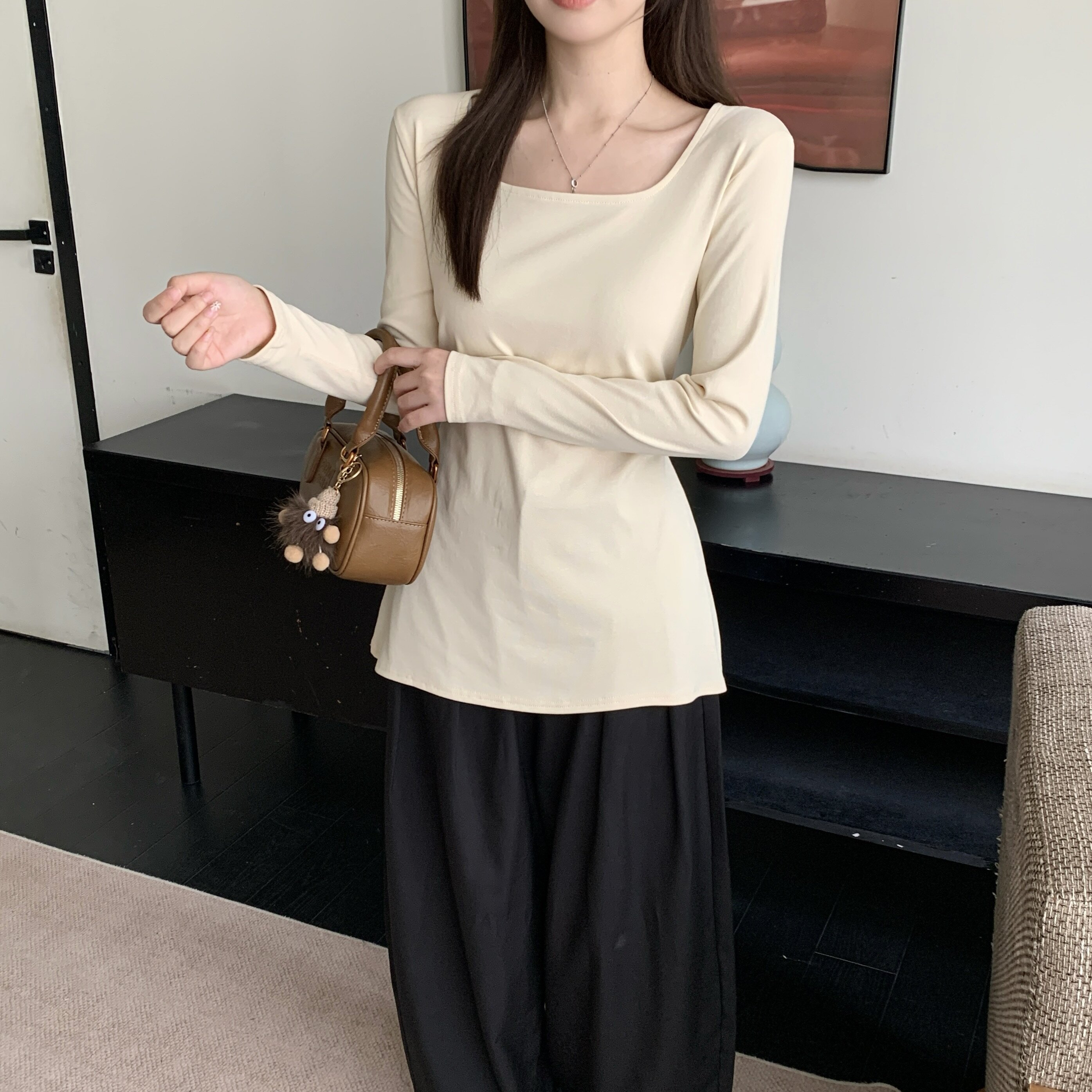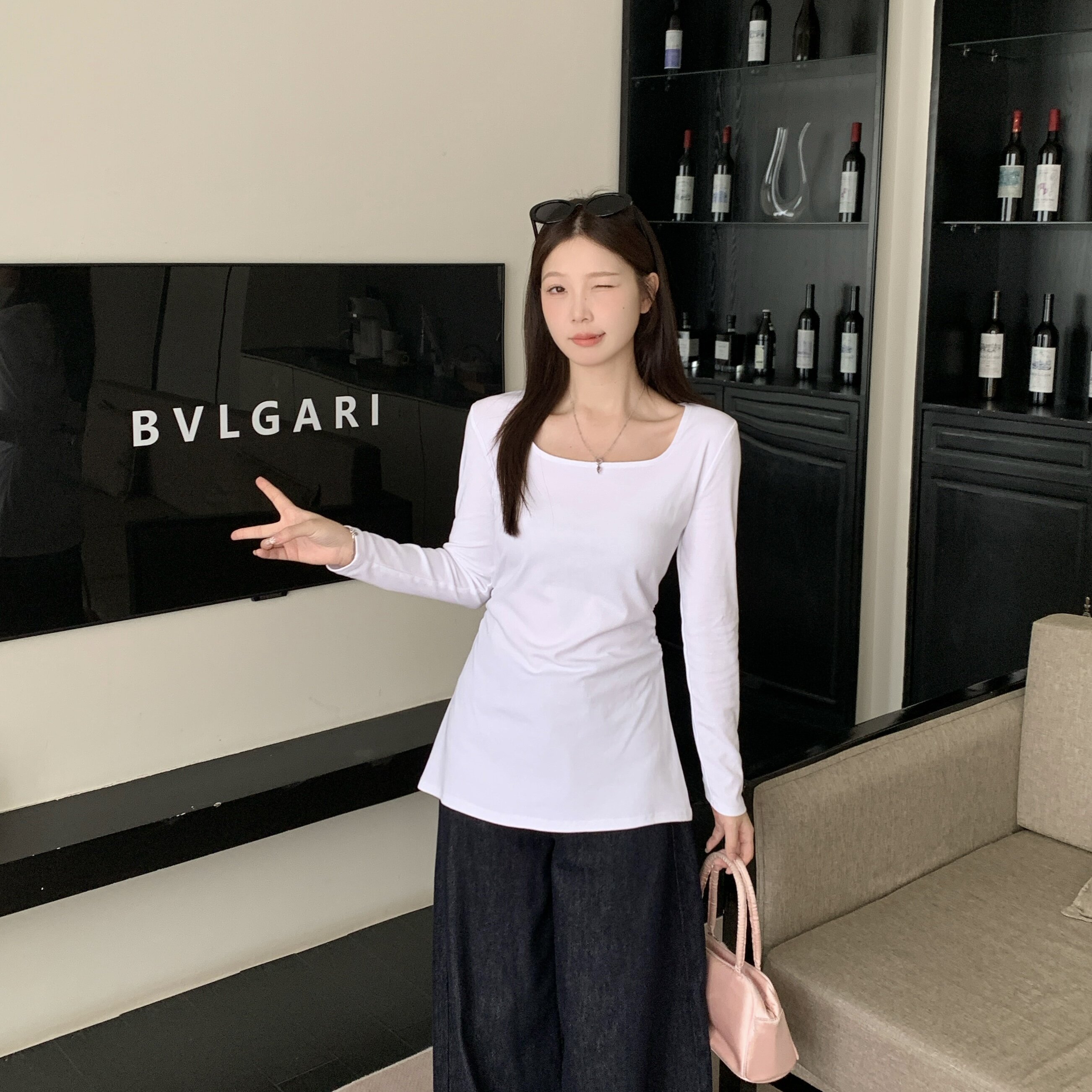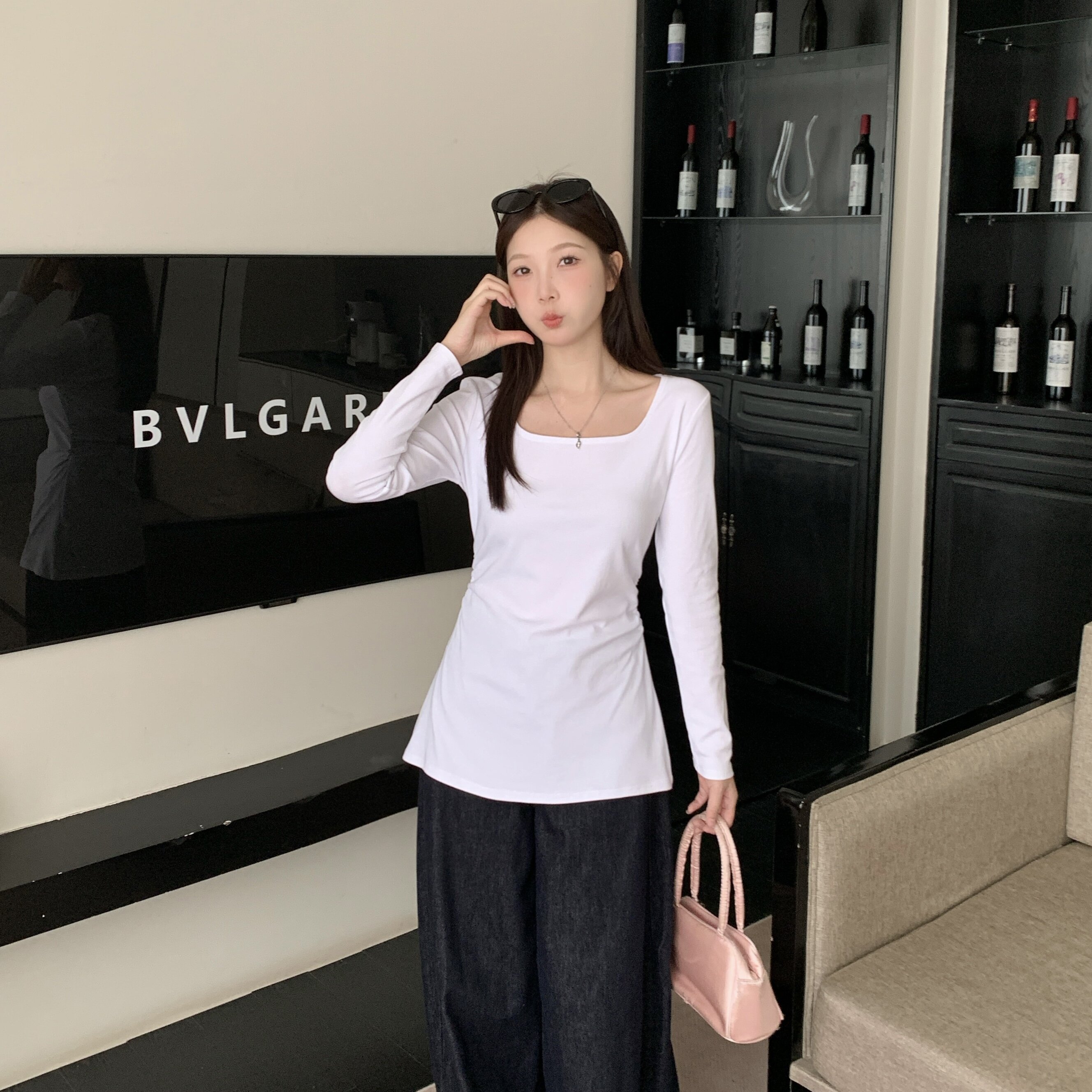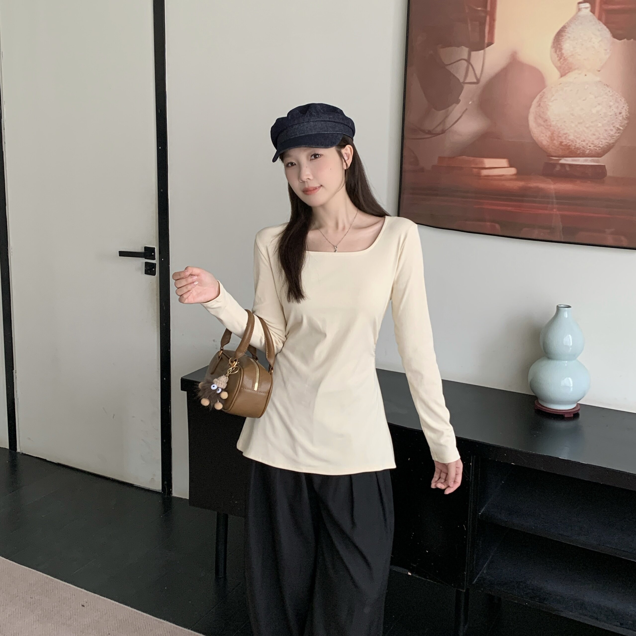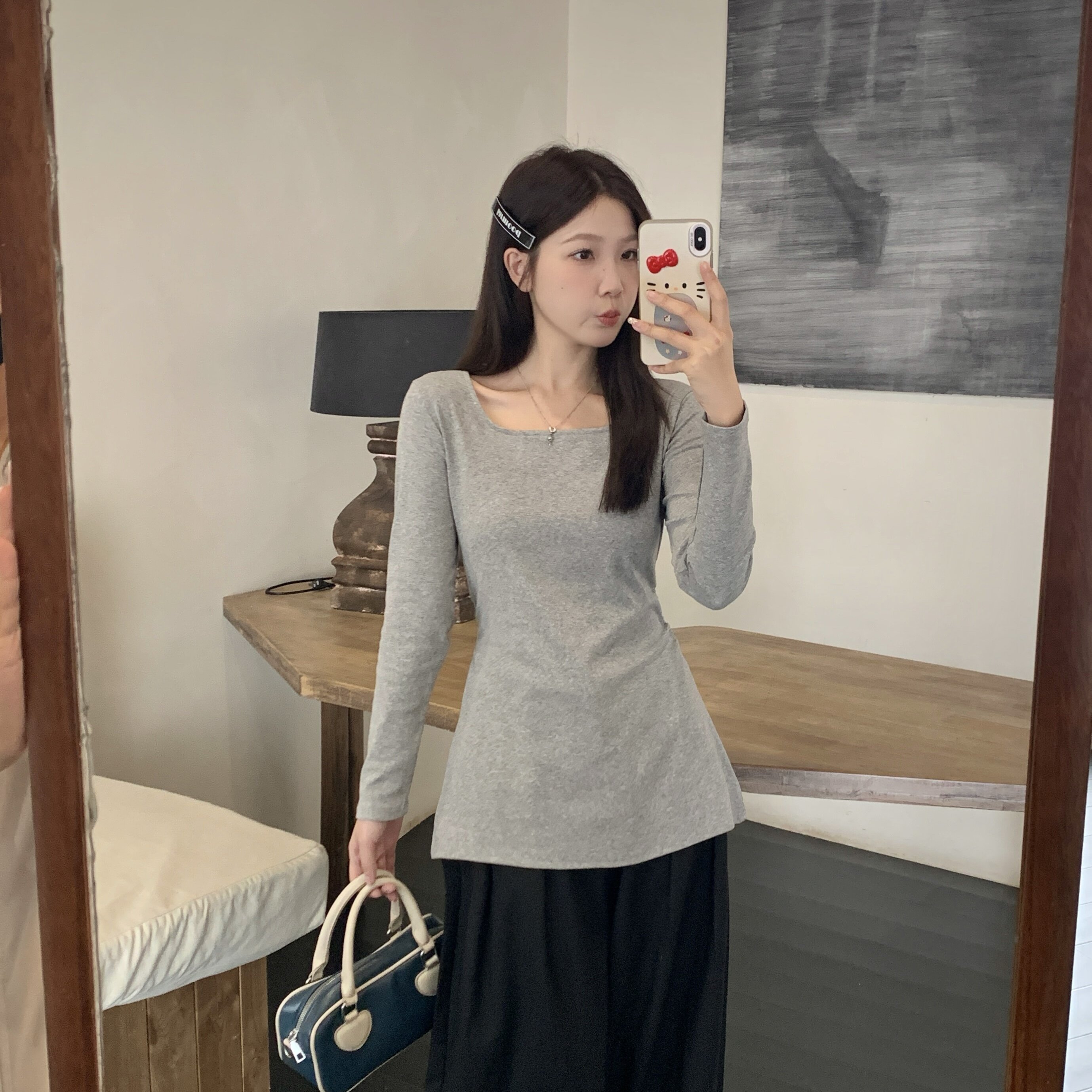 MY13938# 胖mm大码正肩方领遮肚显瘦中长款百搭长袖打底衫女裝貨源服裝批發