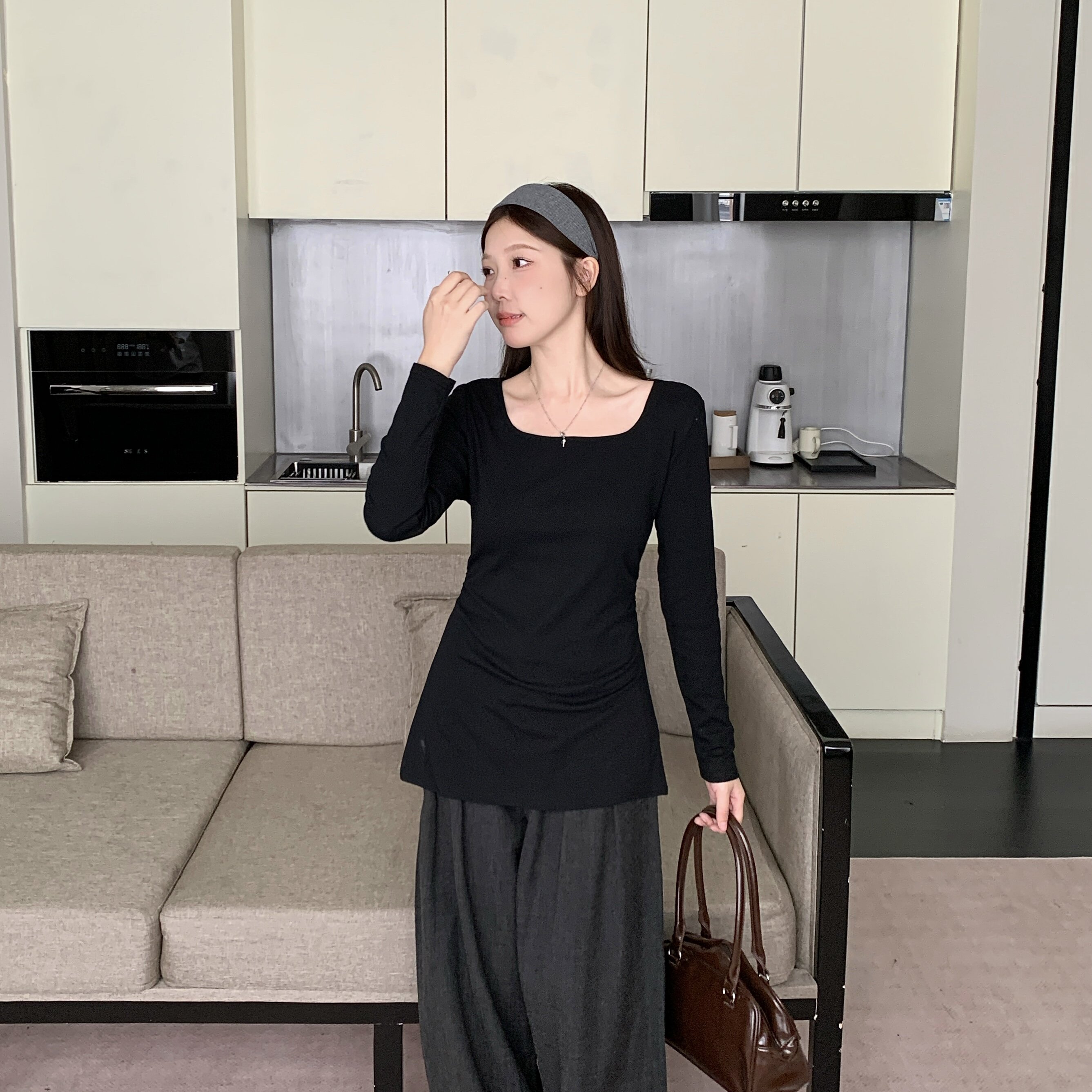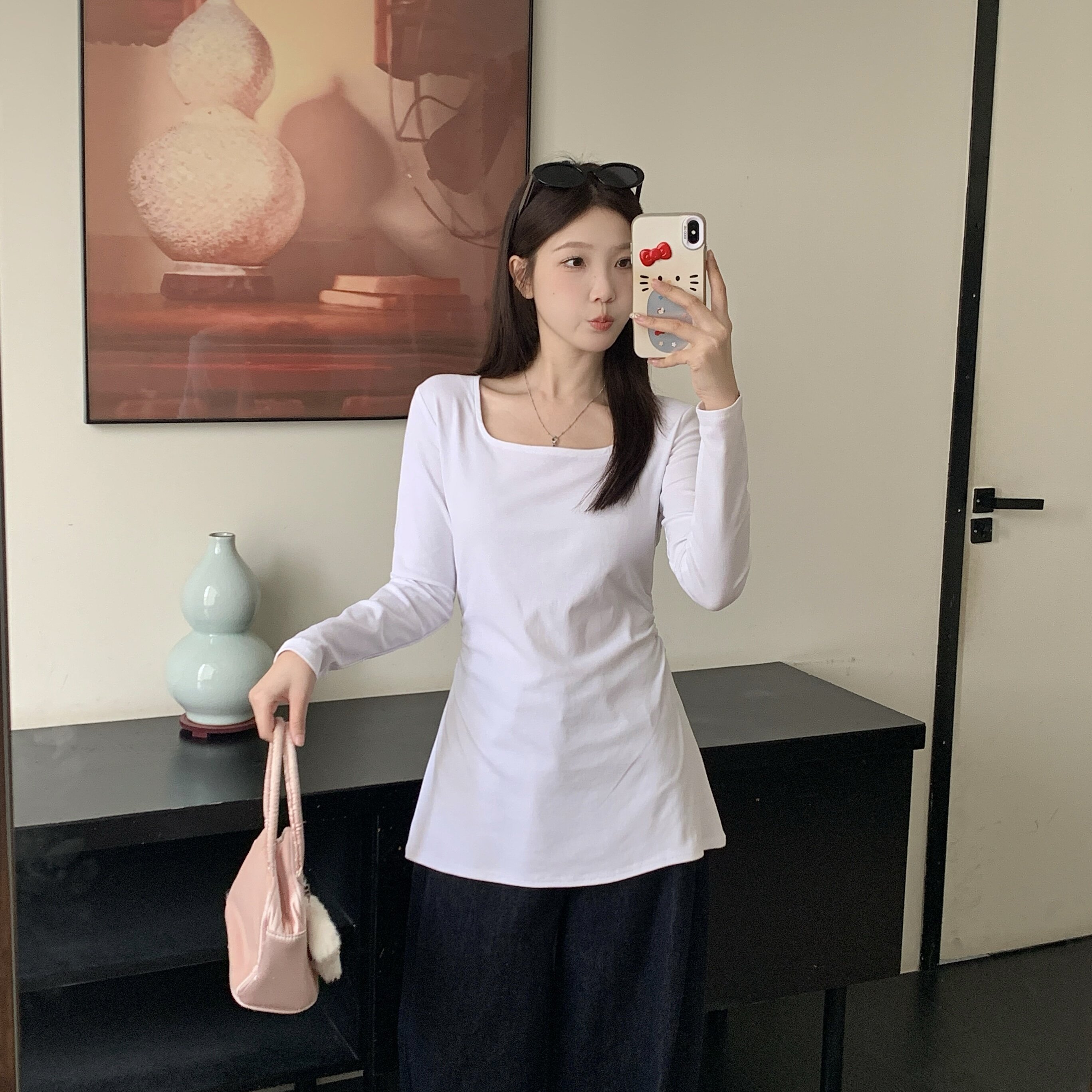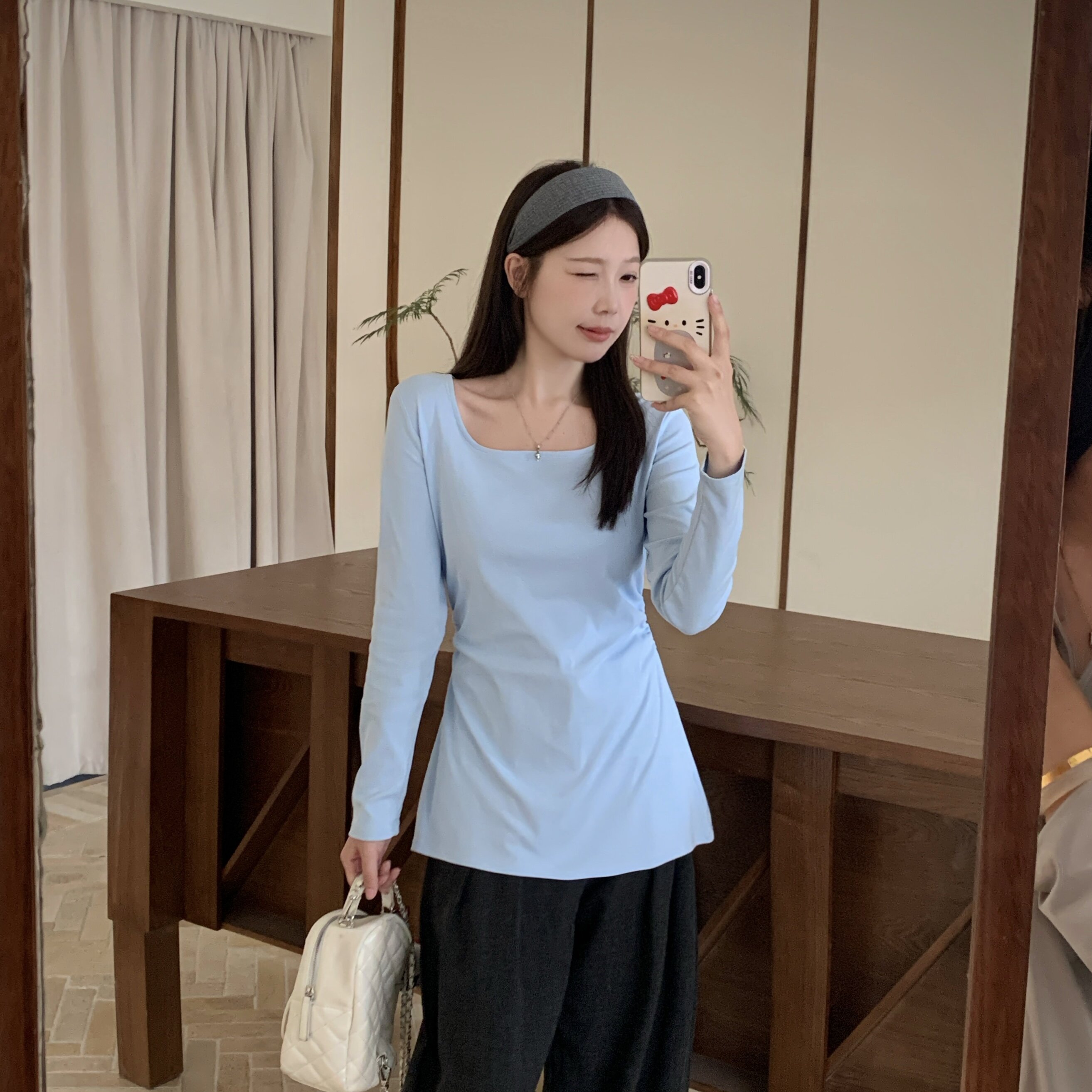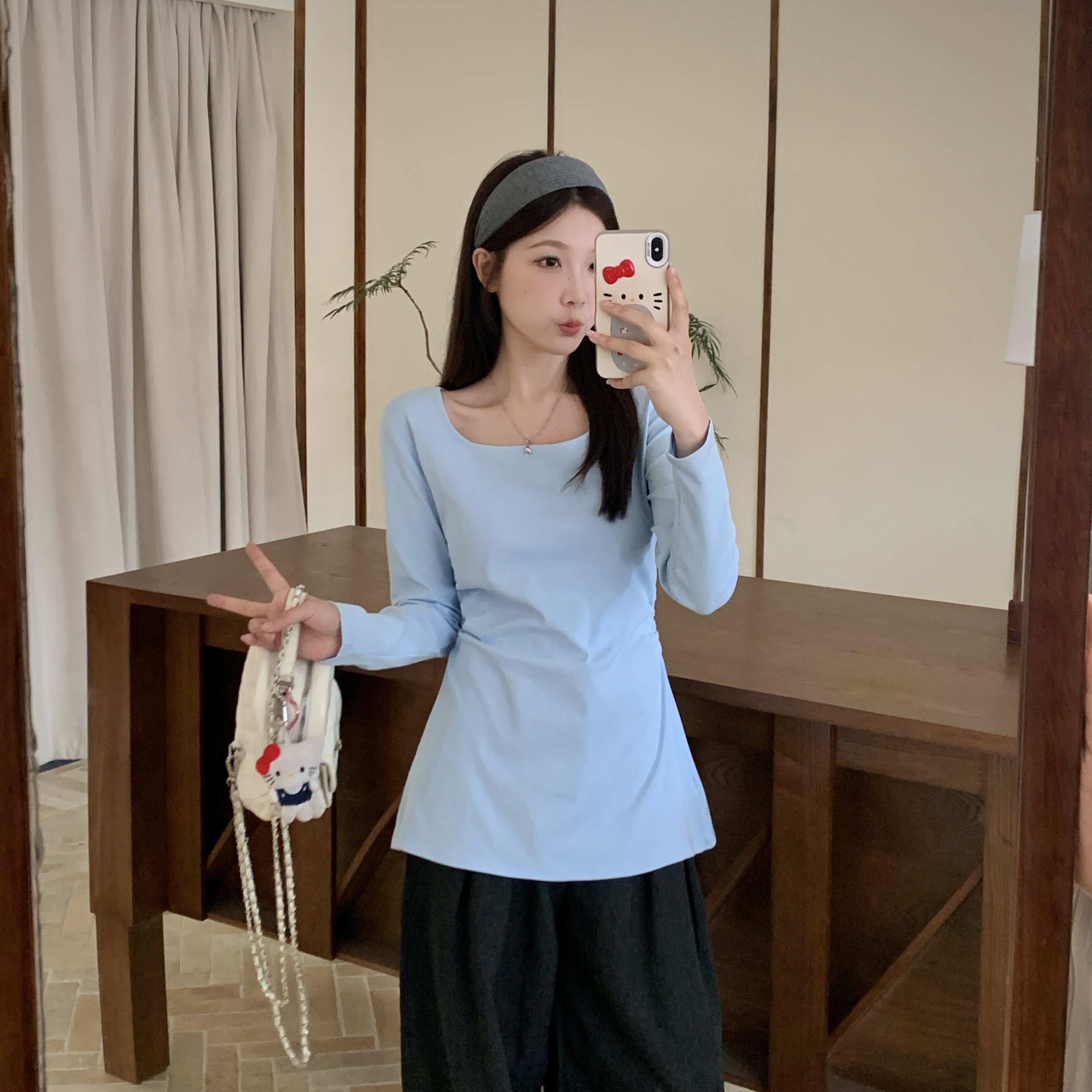 MY13938# 胖mm大码正肩方领遮肚显瘦中长款百搭长袖打底衫女裝貨源服裝批發
