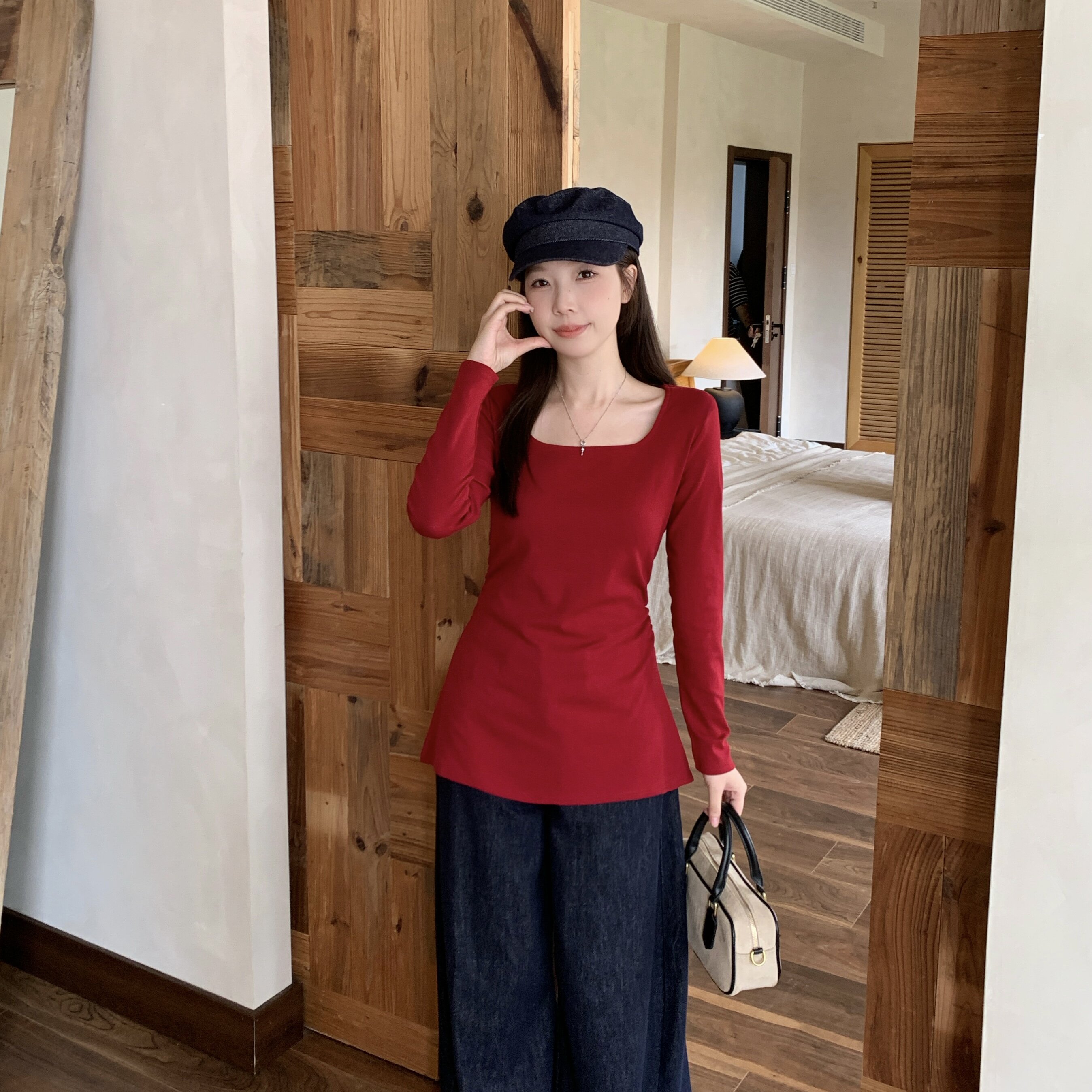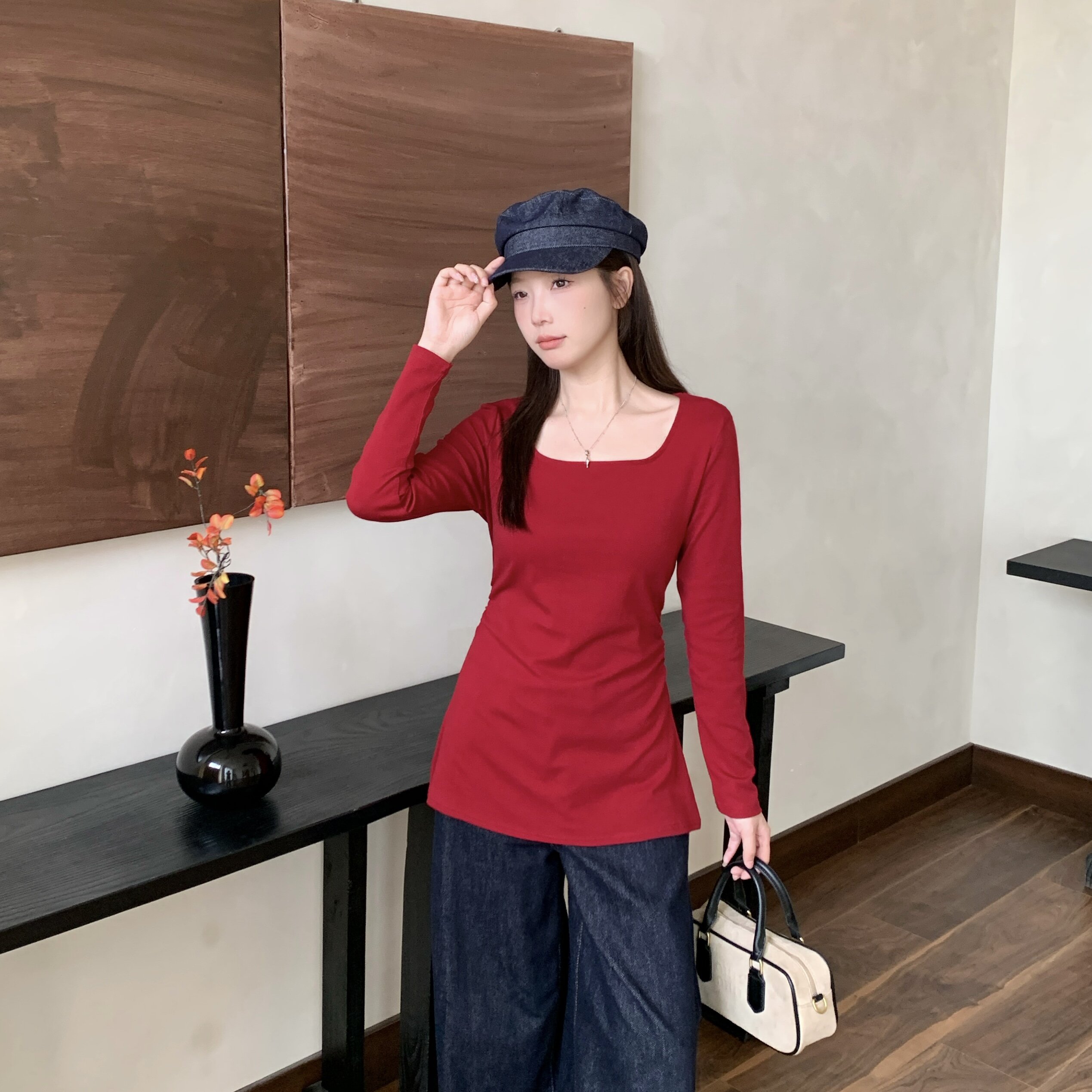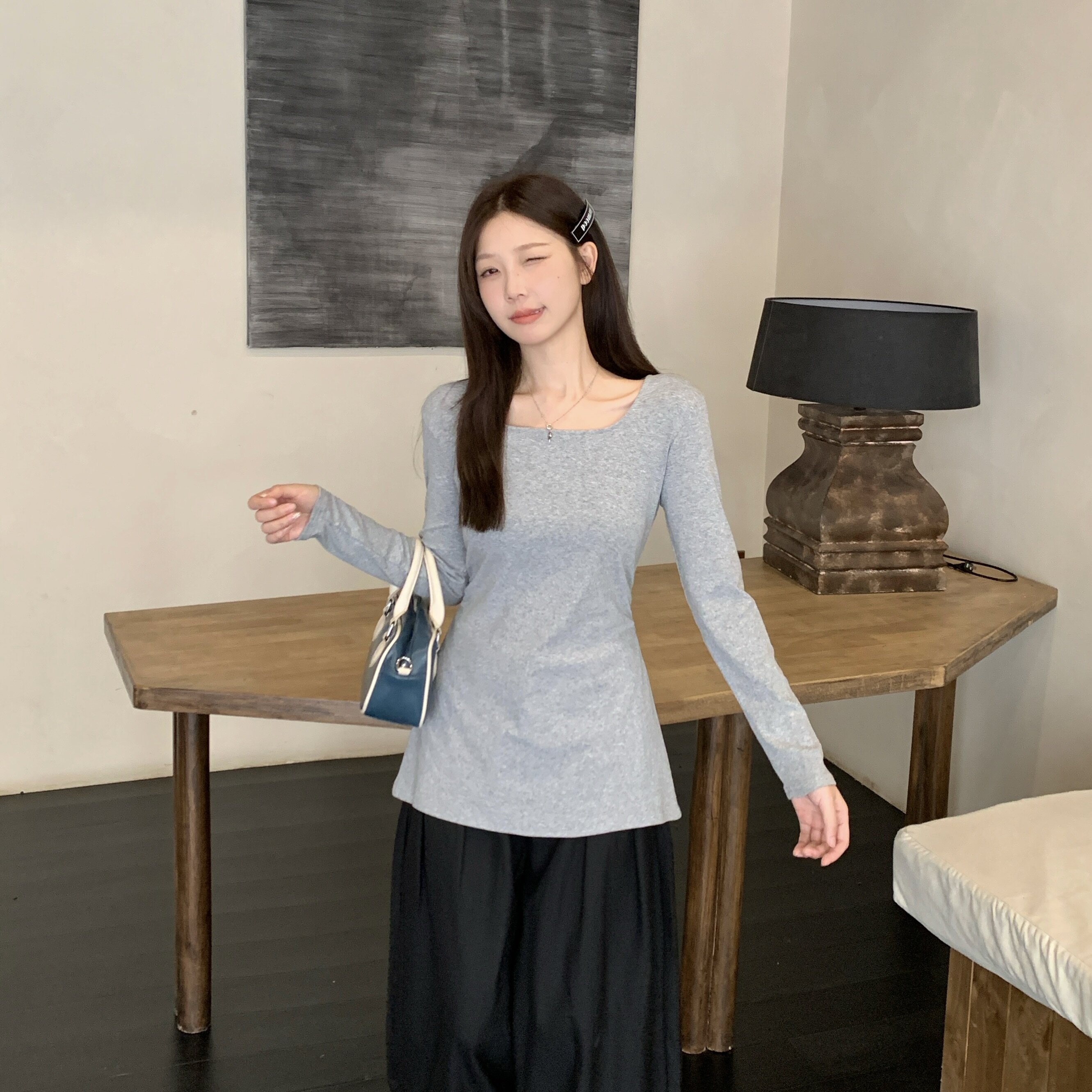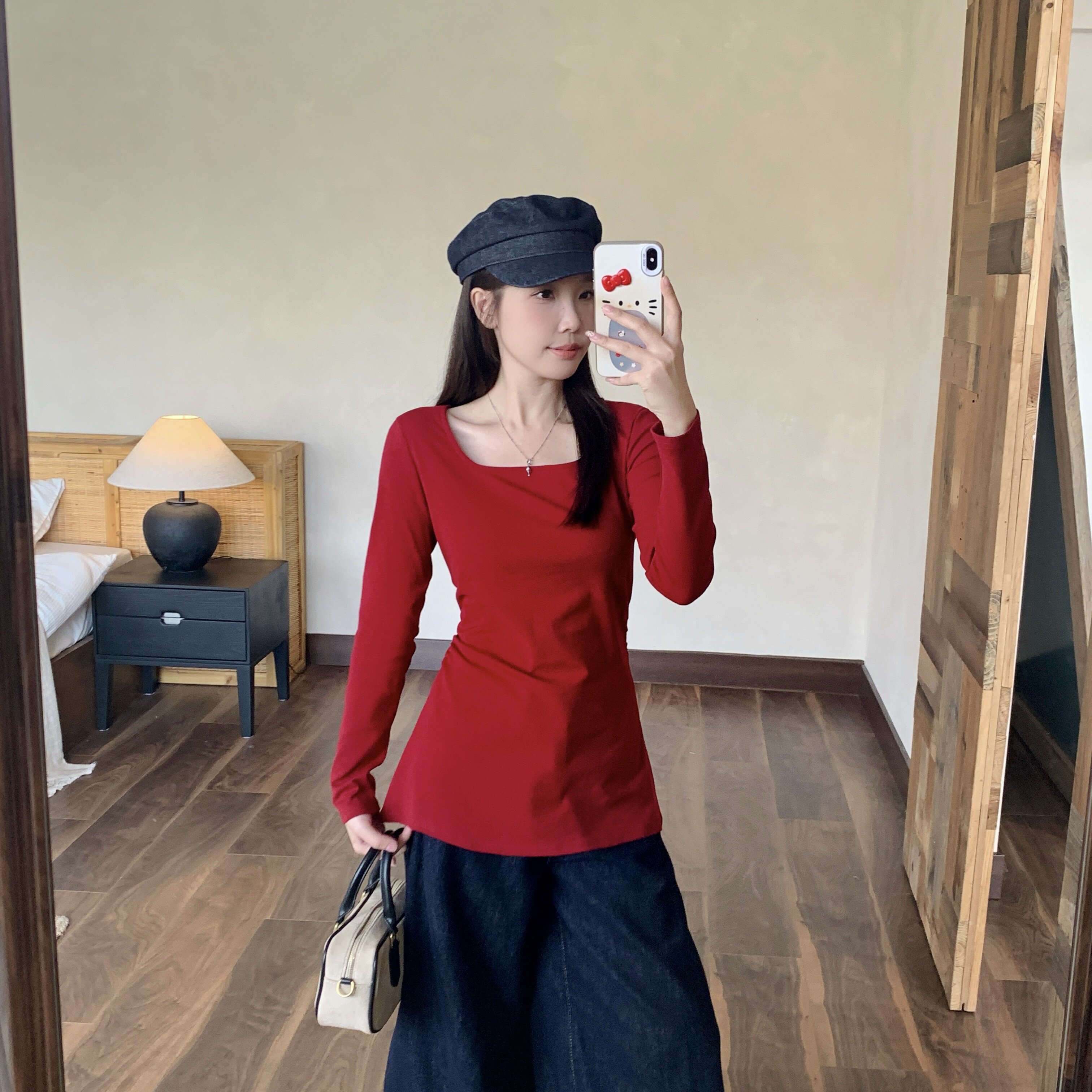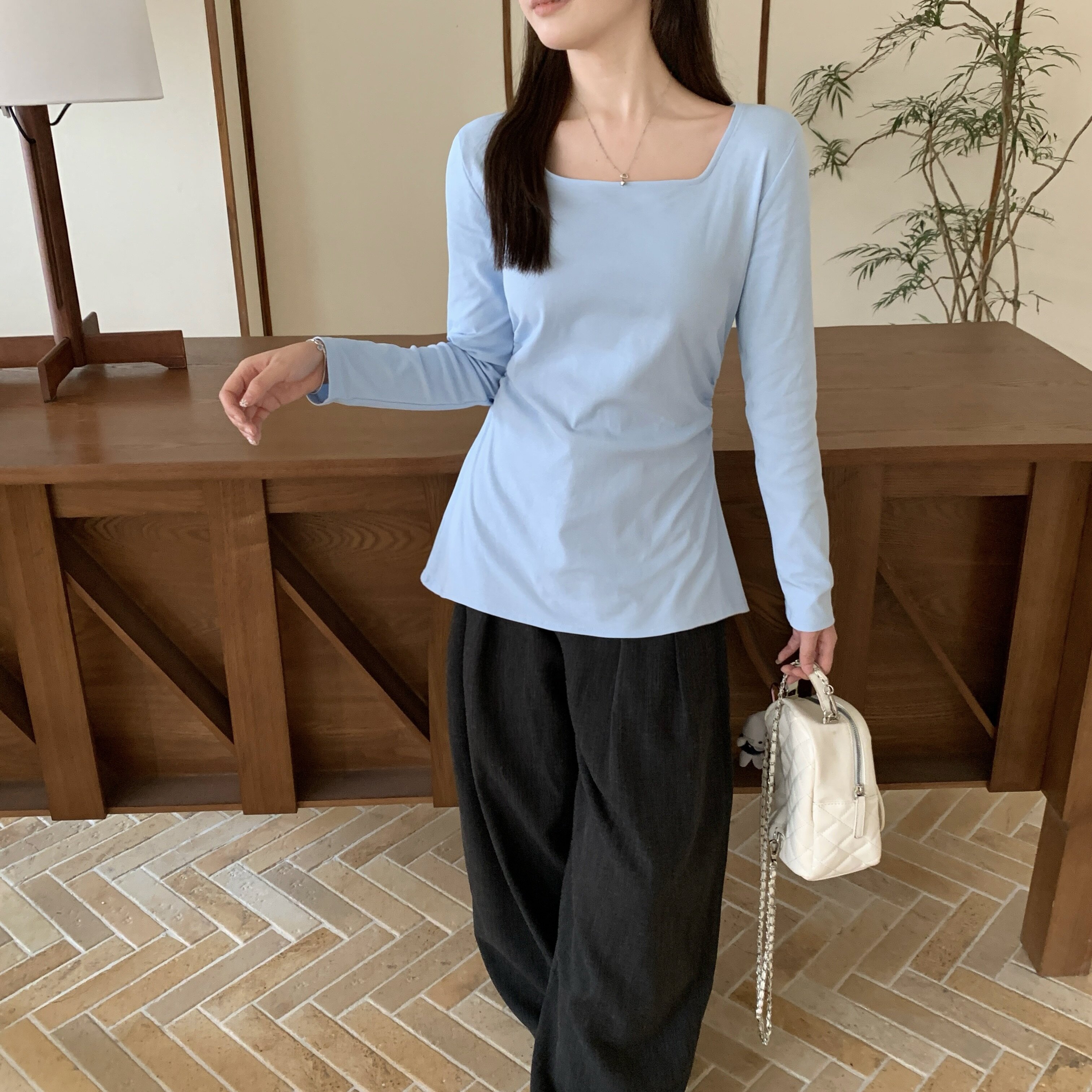 MY13938# 胖mm大码正肩方领遮肚显瘦中长款百搭长袖打底衫女裝貨源服裝批發