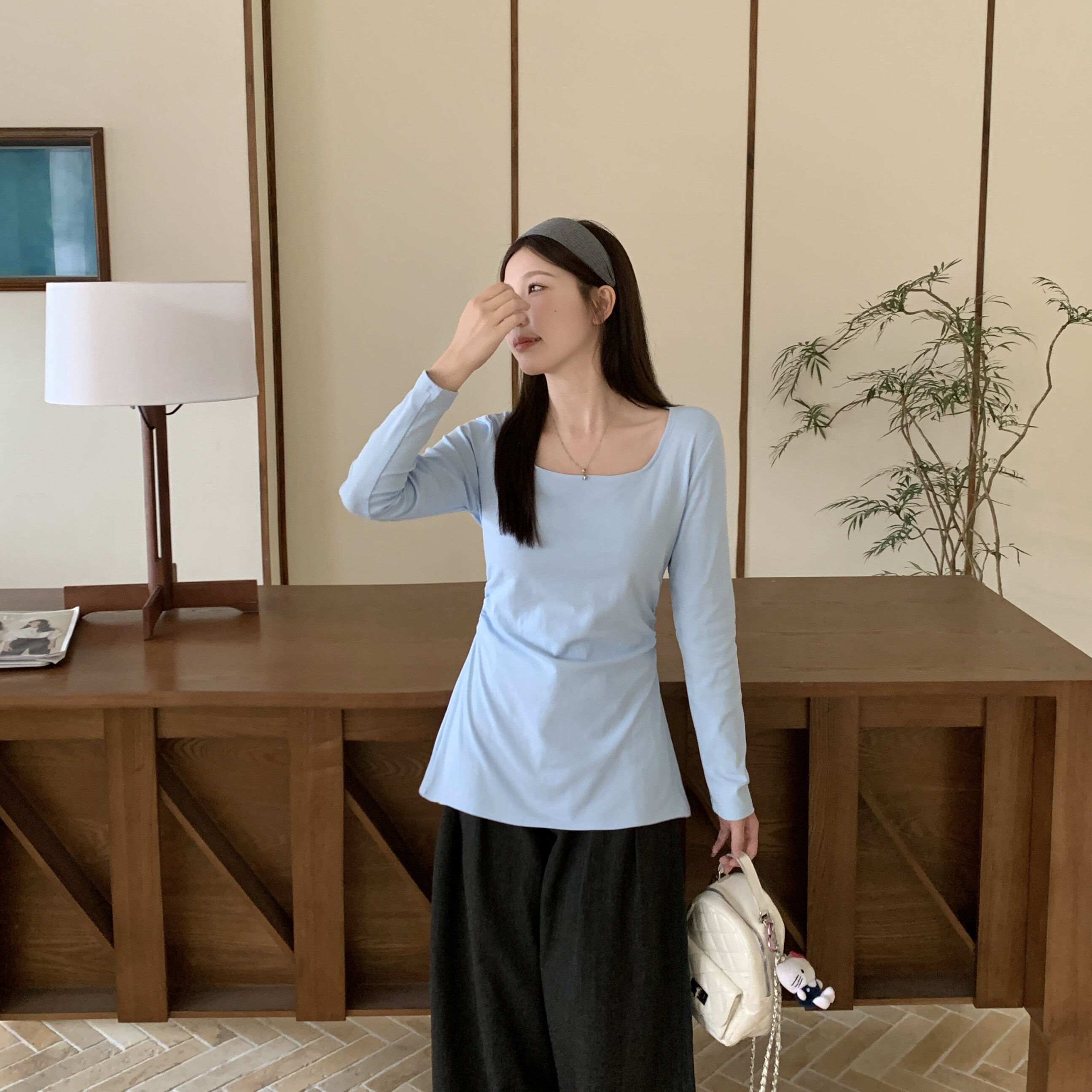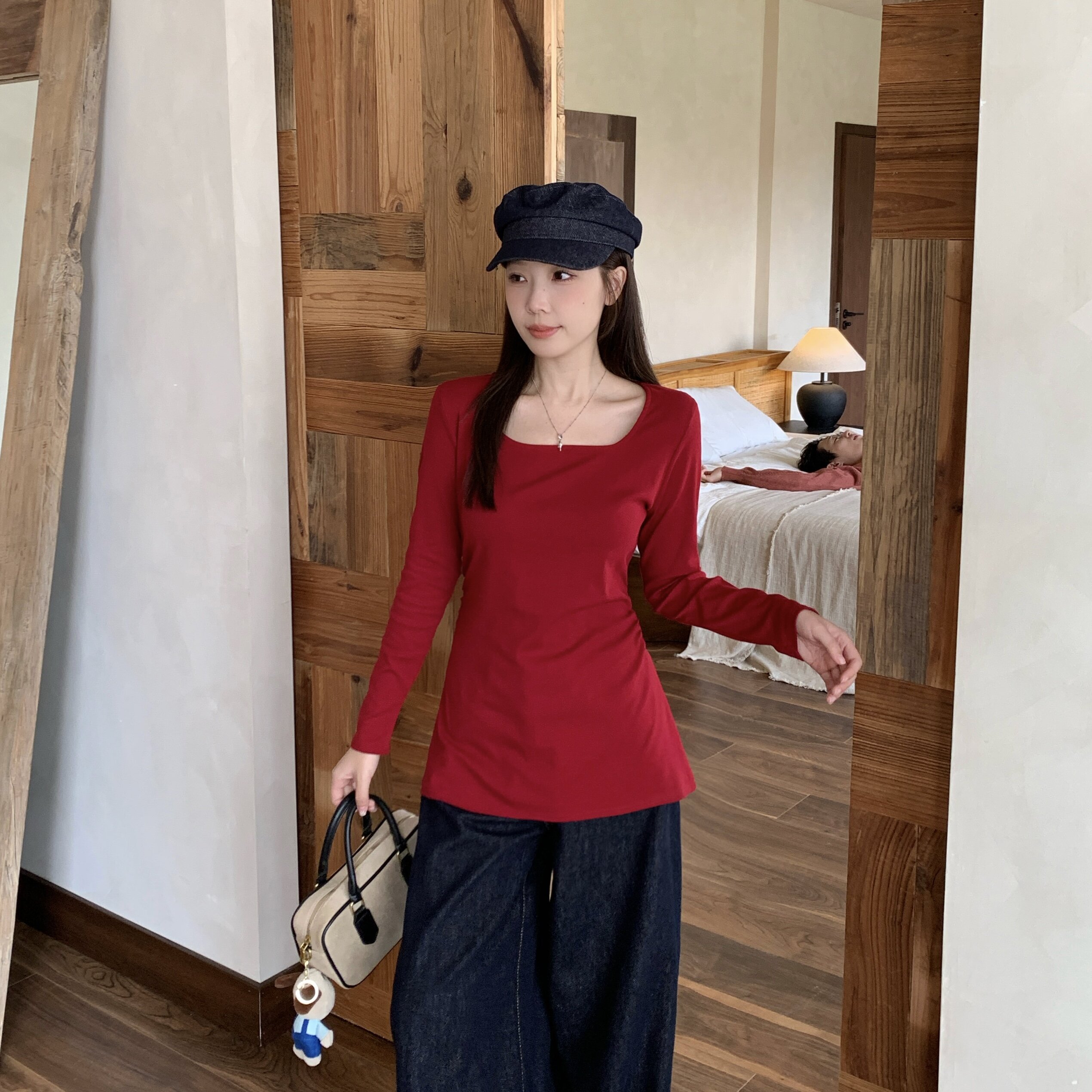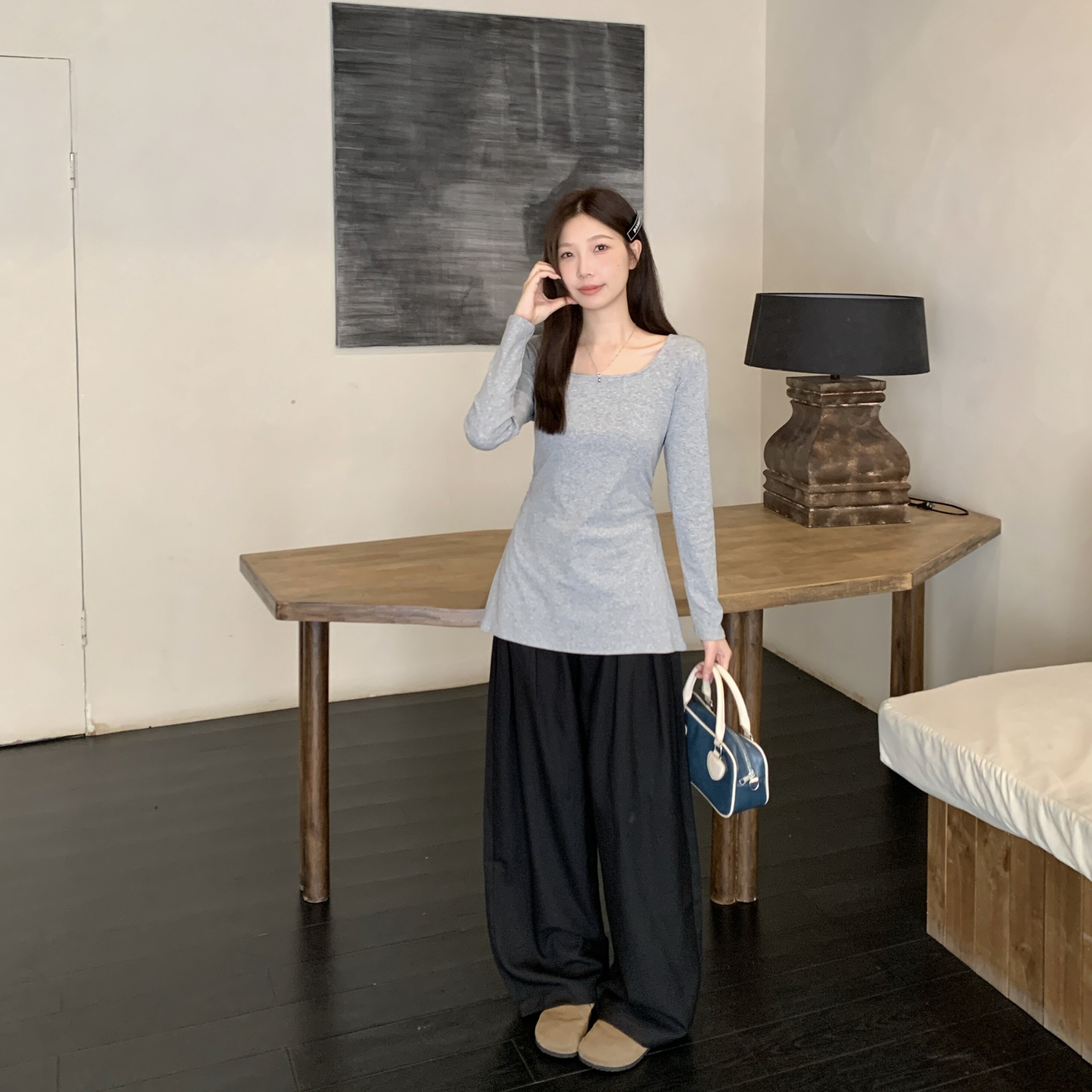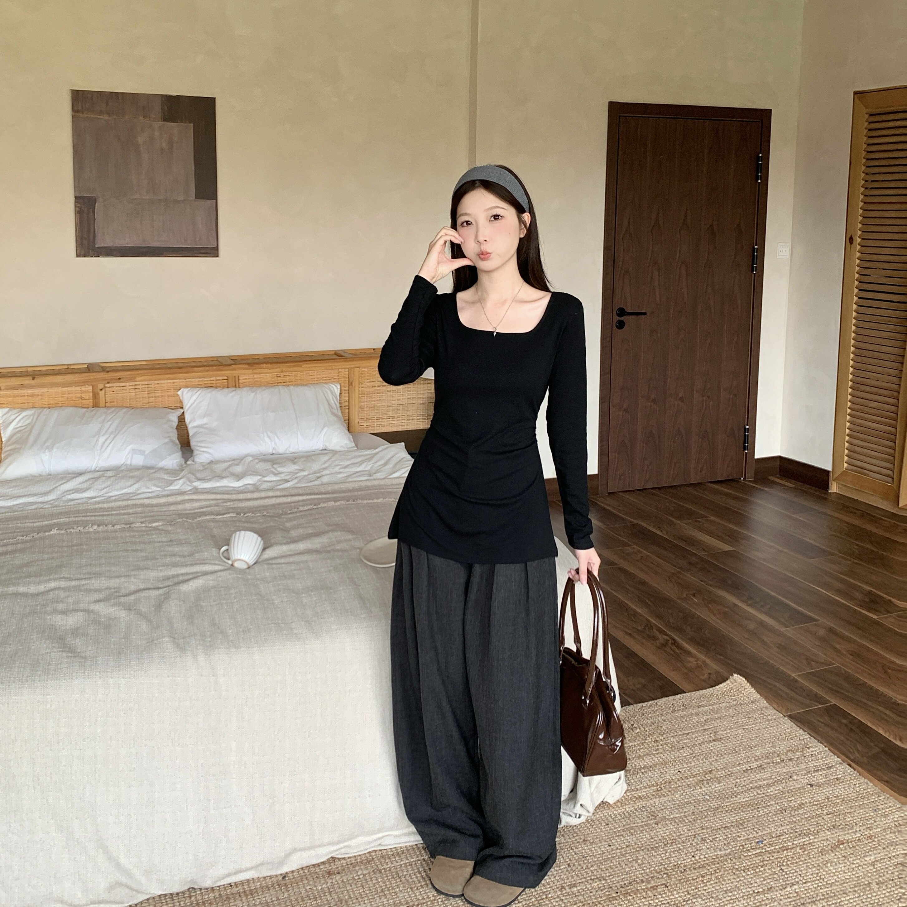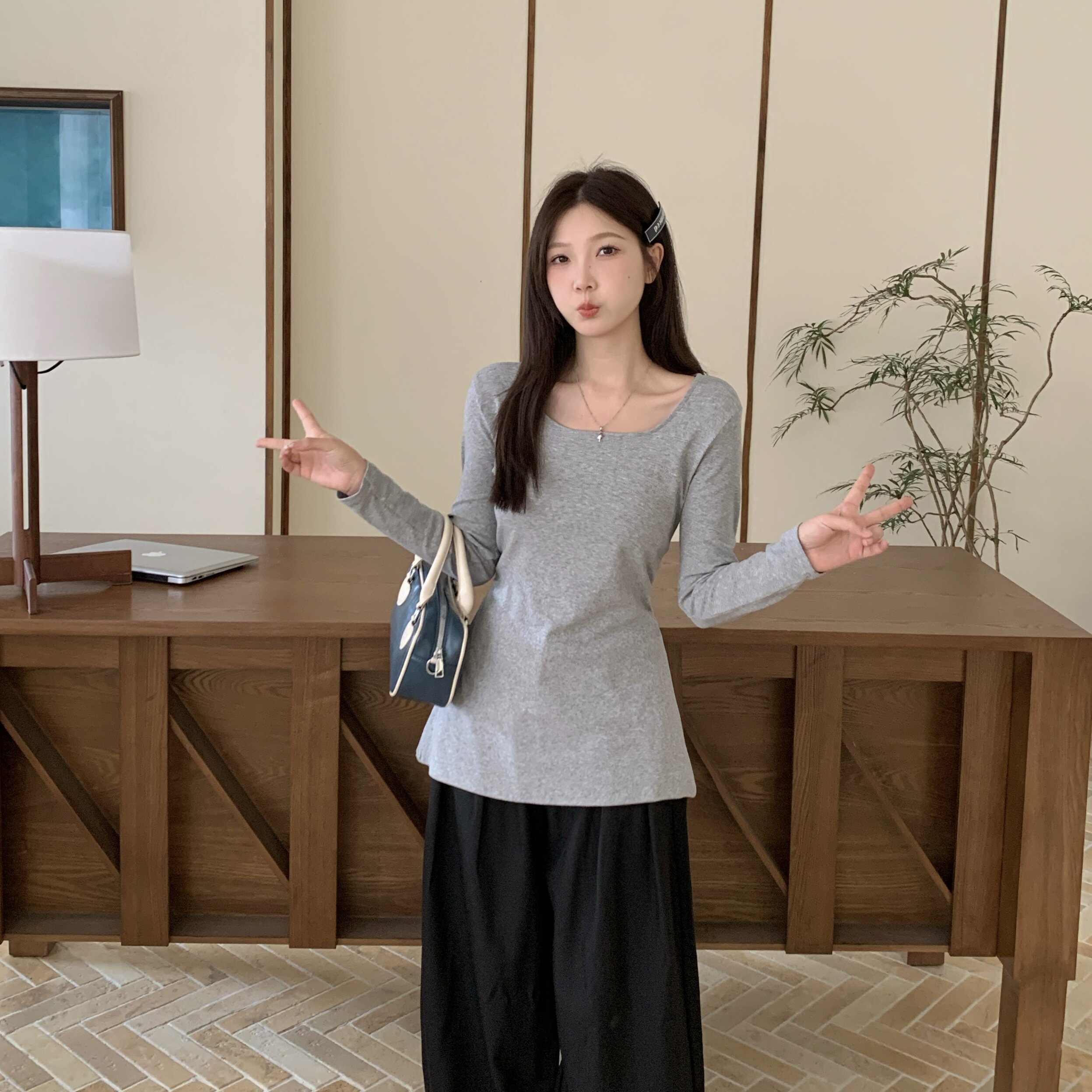 MY13938# 胖mm大码正肩方领遮肚显瘦中长款百搭长袖打底衫女裝貨源服裝批發