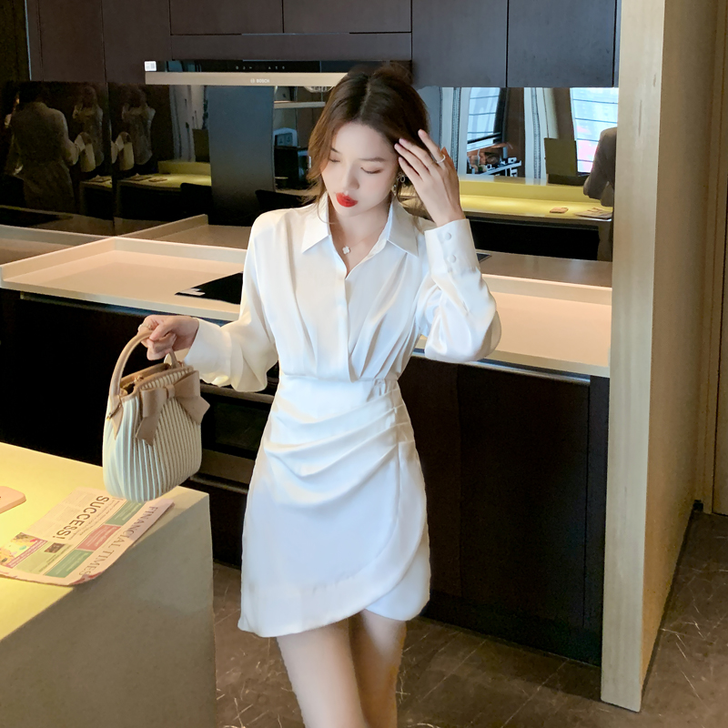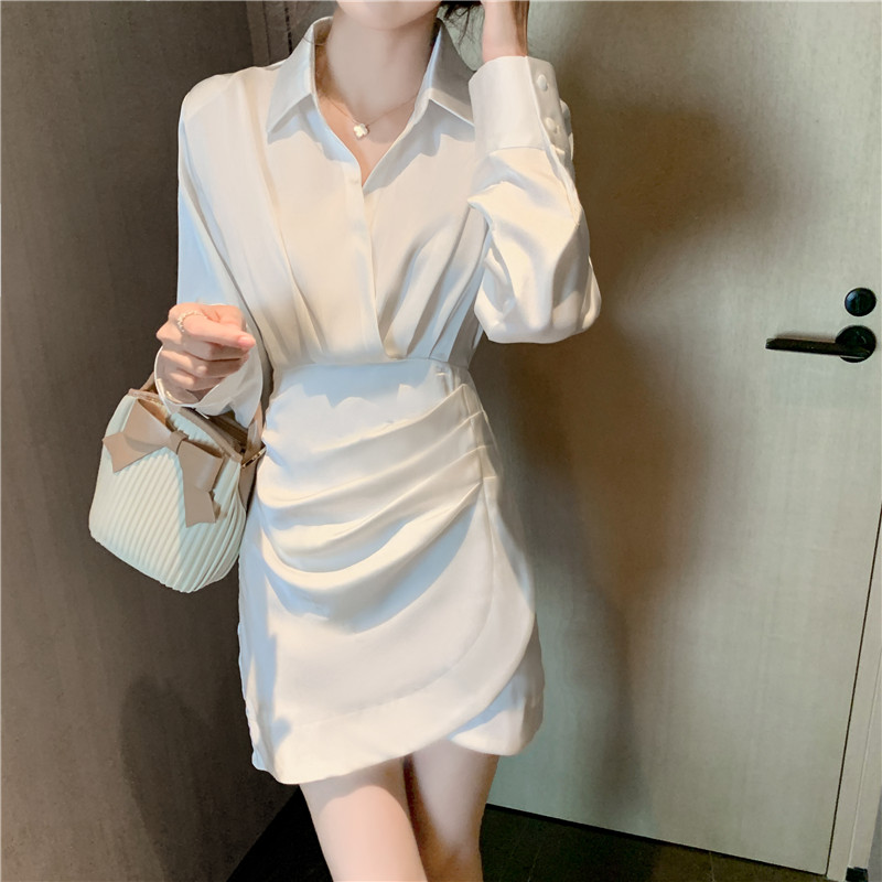 MY13942# 新款时尚高级感修身遮肉显瘦衬衫裙女气质V领连衣裙女裝貨源服裝批發