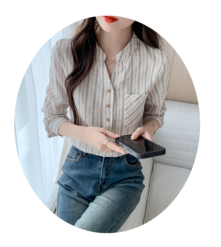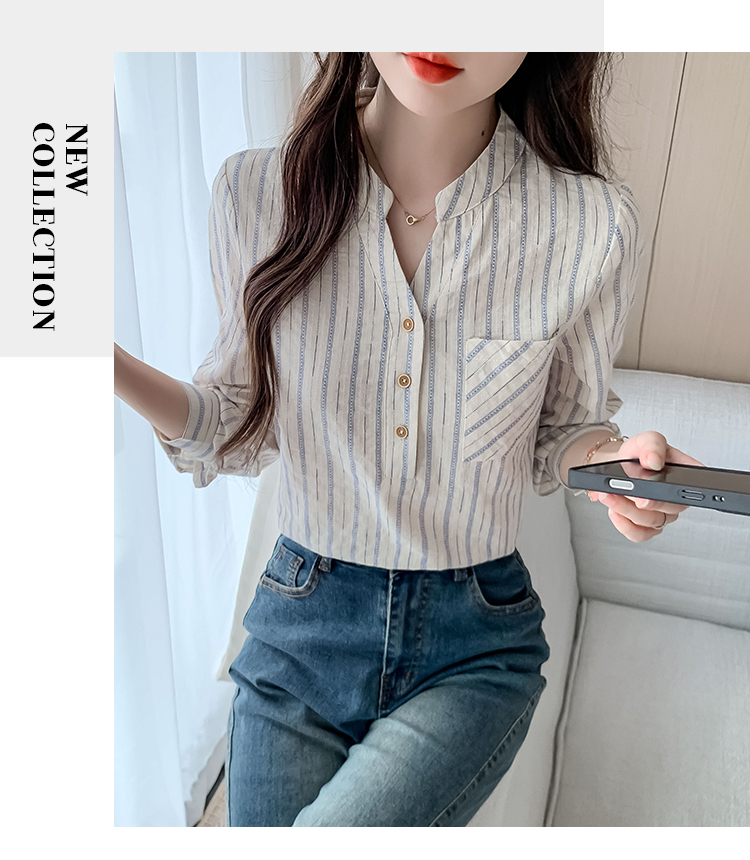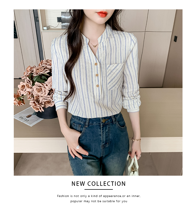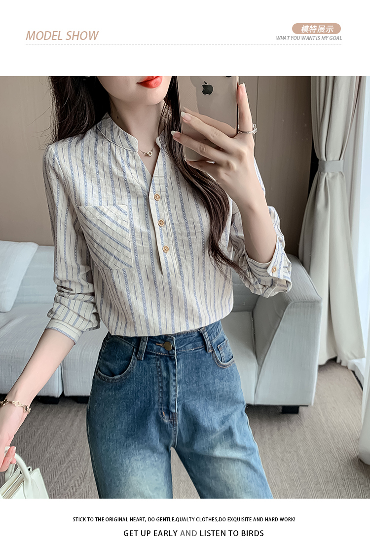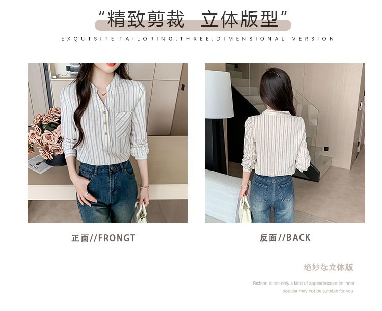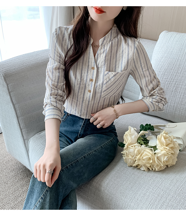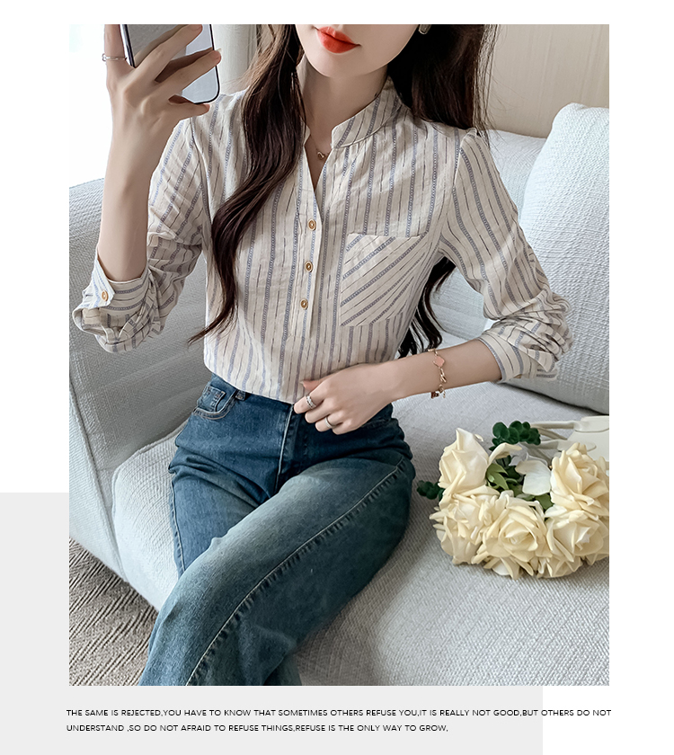 MY13960# 新款简约百搭条纹套头衬衫气质通勤立领长袖上衣女裝貨源服裝批發