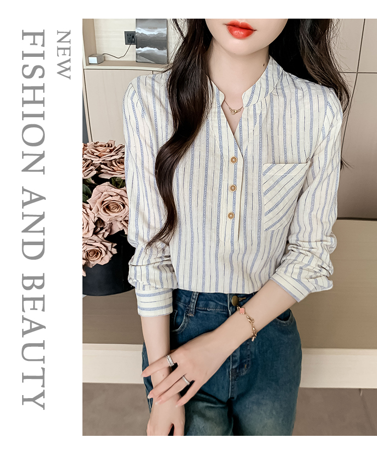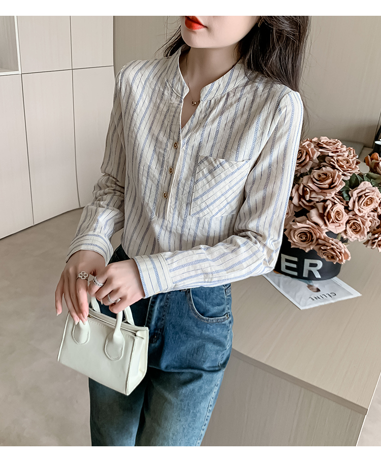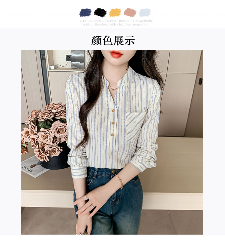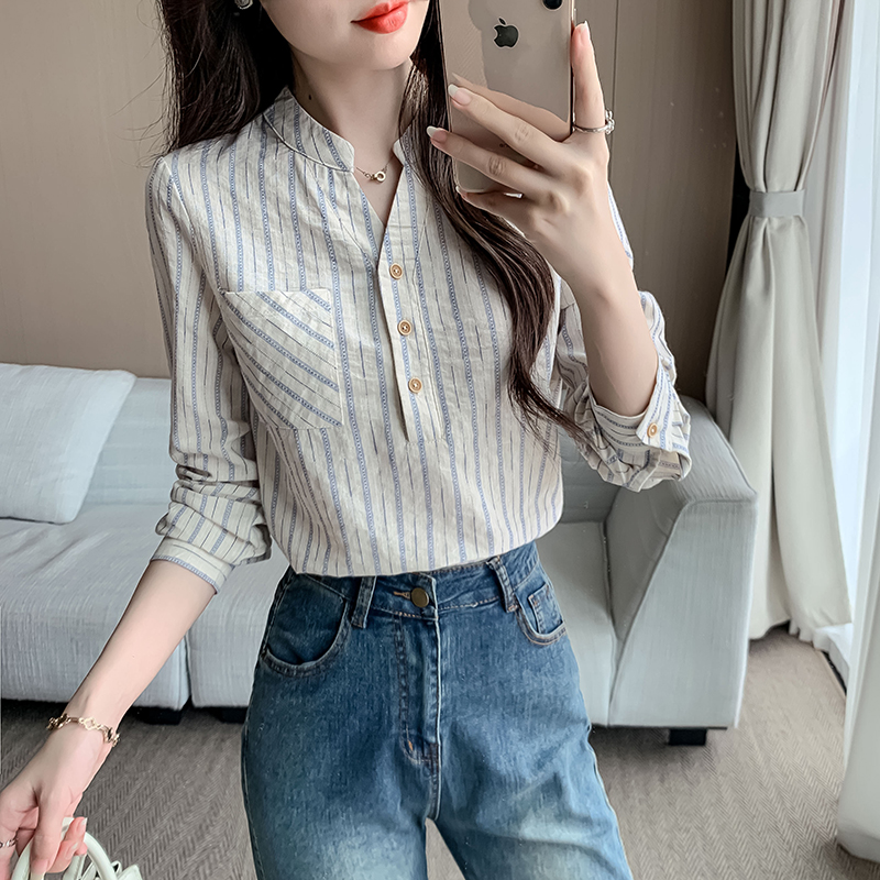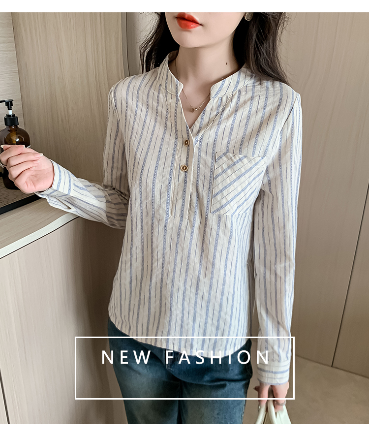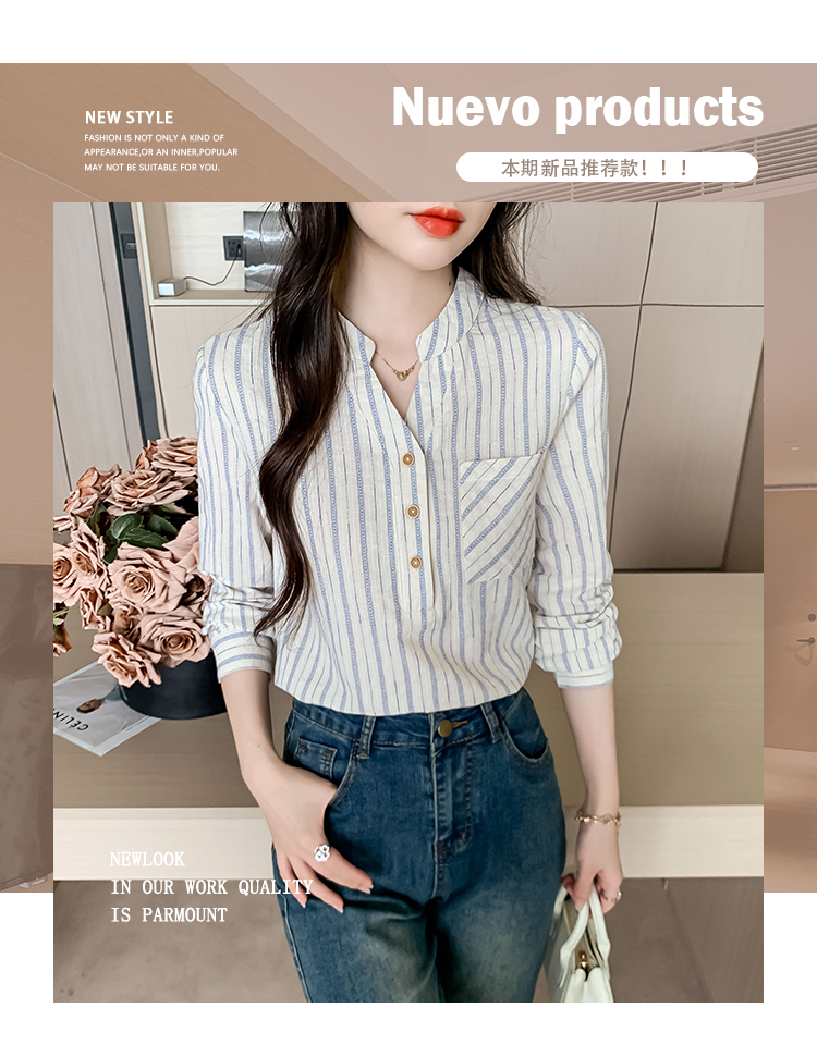 MY13960# 新款简约百搭条纹套头衬衫气质通勤立领长袖上衣女裝貨源服裝批發