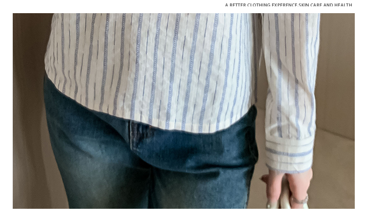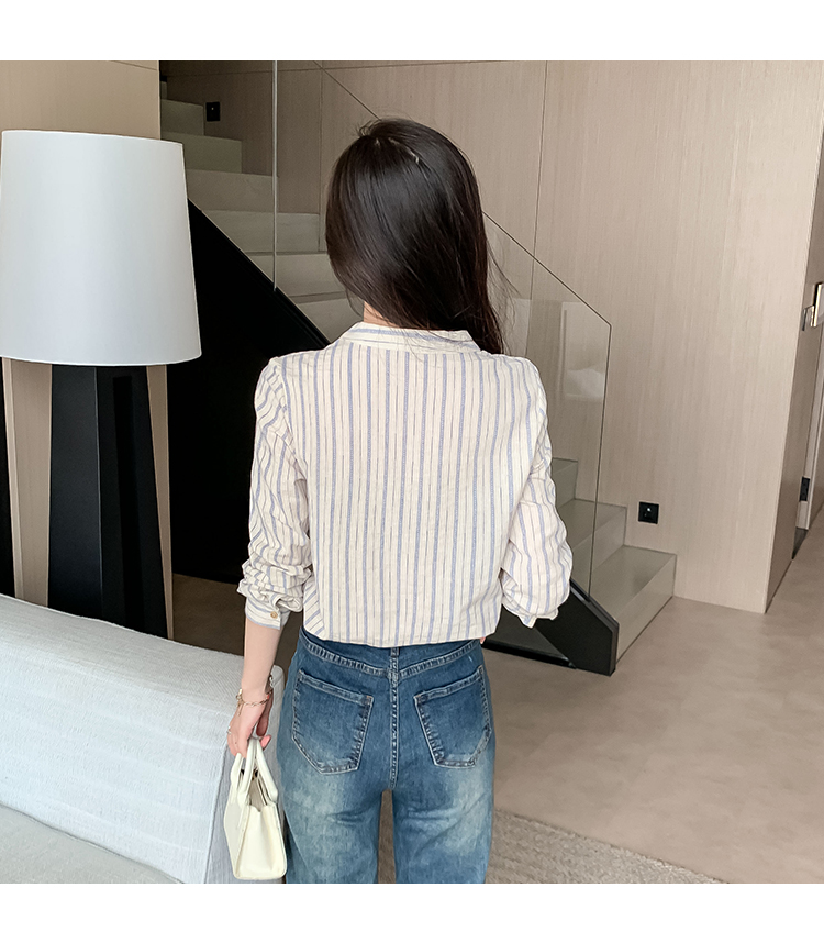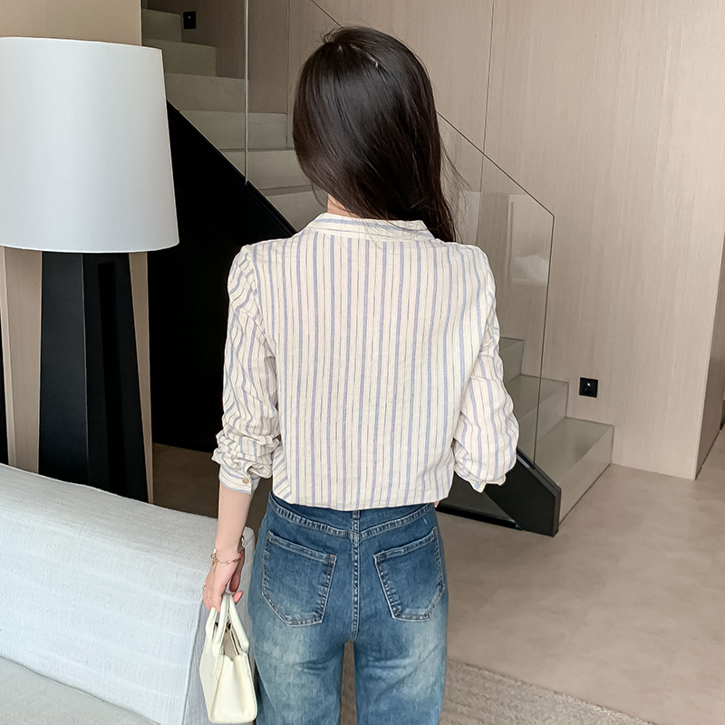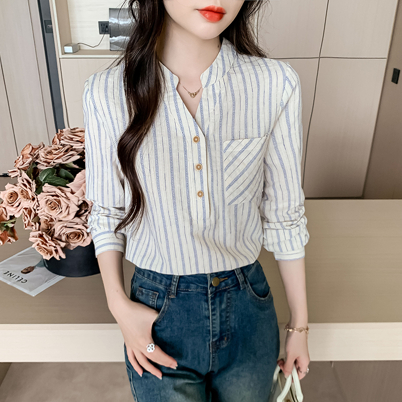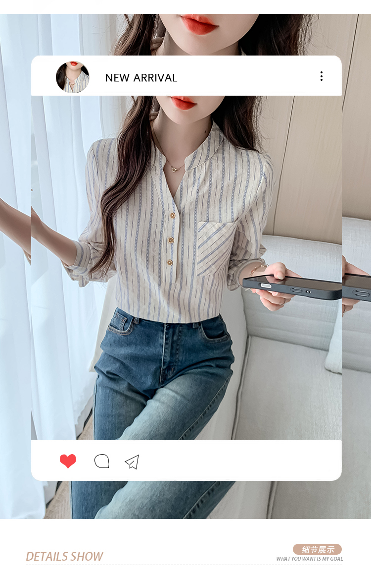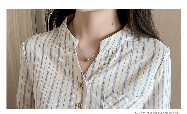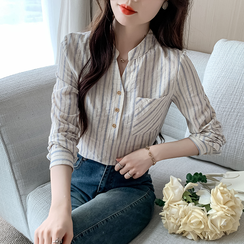 MY13960# 新款简约百搭条纹套头衬衫气质通勤立领长袖上衣女裝貨源服裝批發