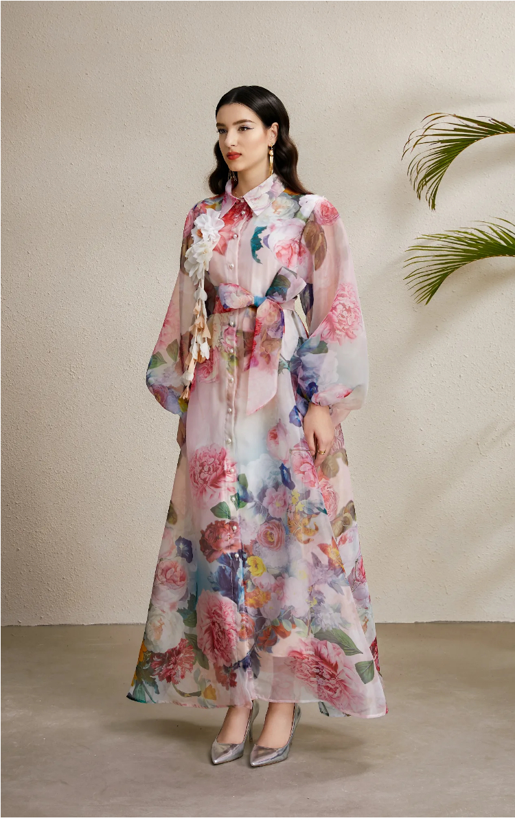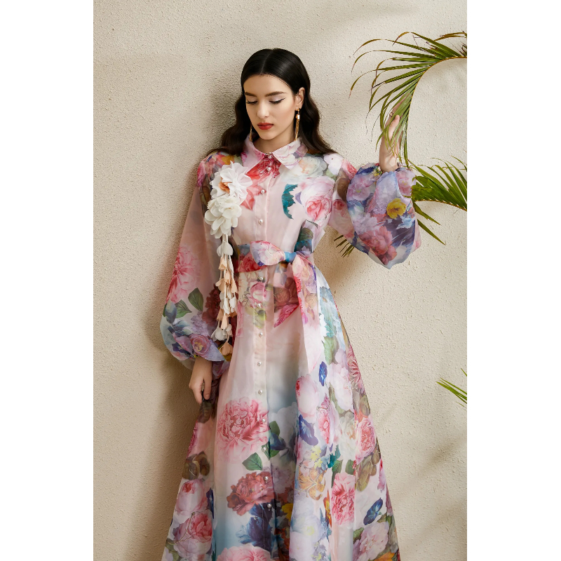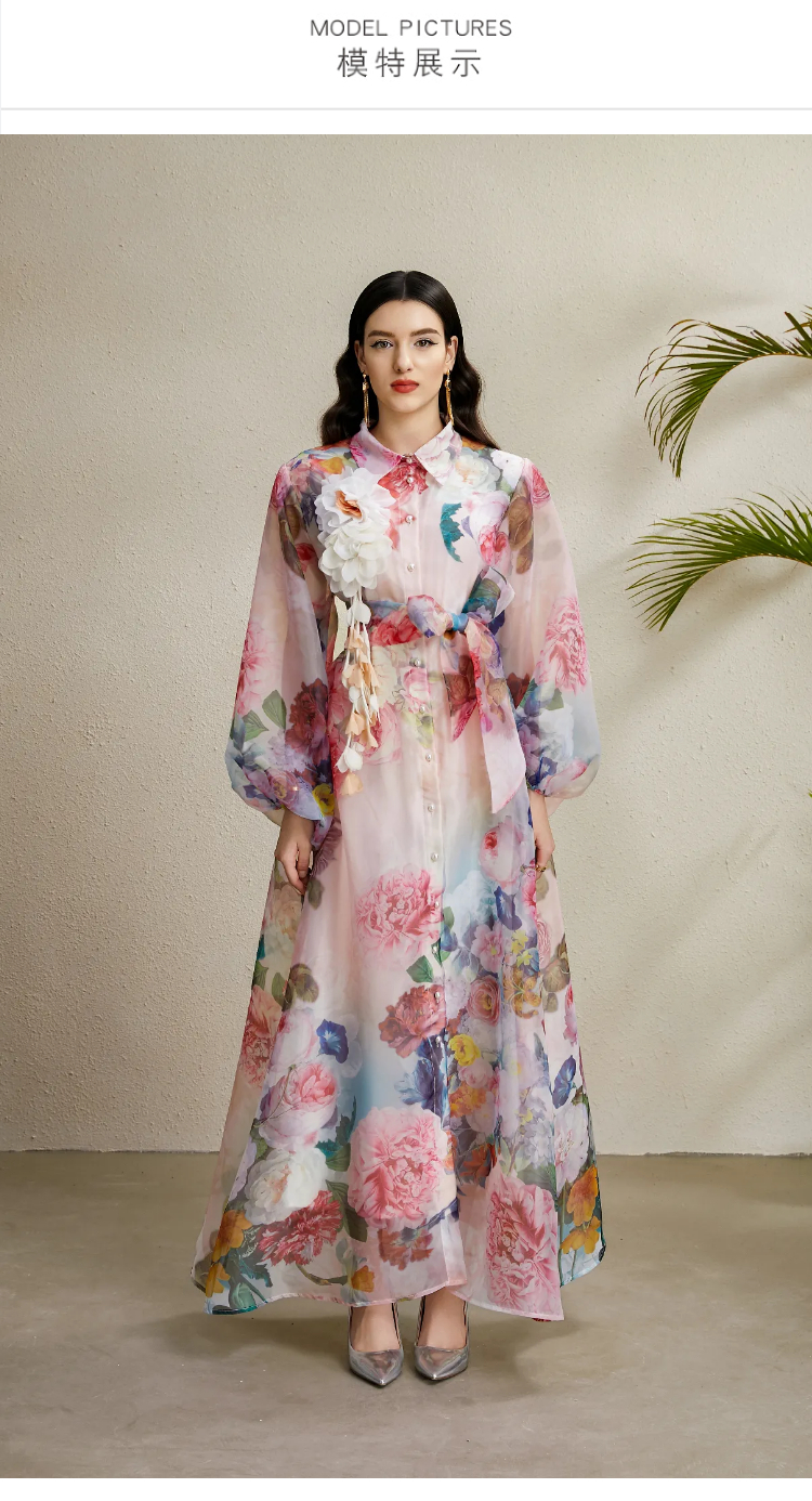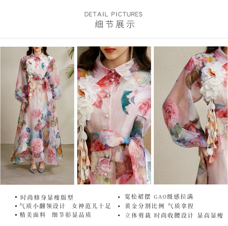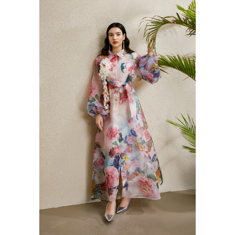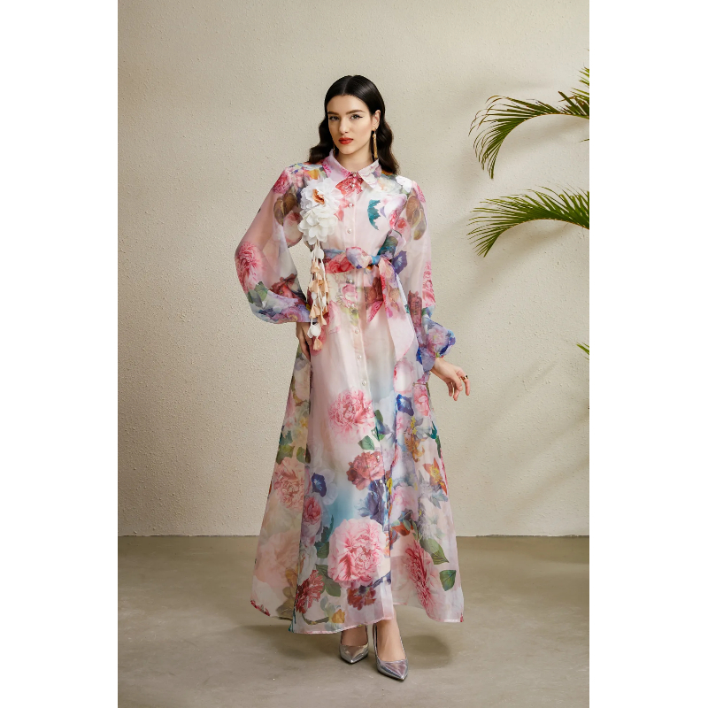 MY13969# KAROLINA翻领绑带胸花阔摆印花长款连衣裙女裝貨源服裝批發
