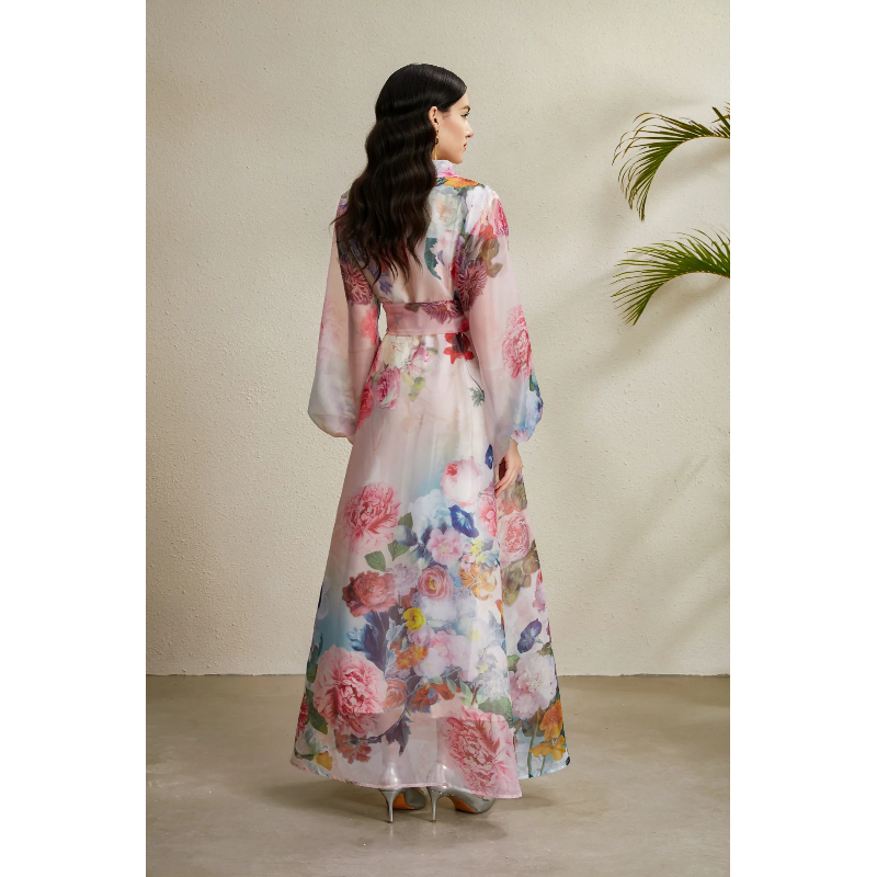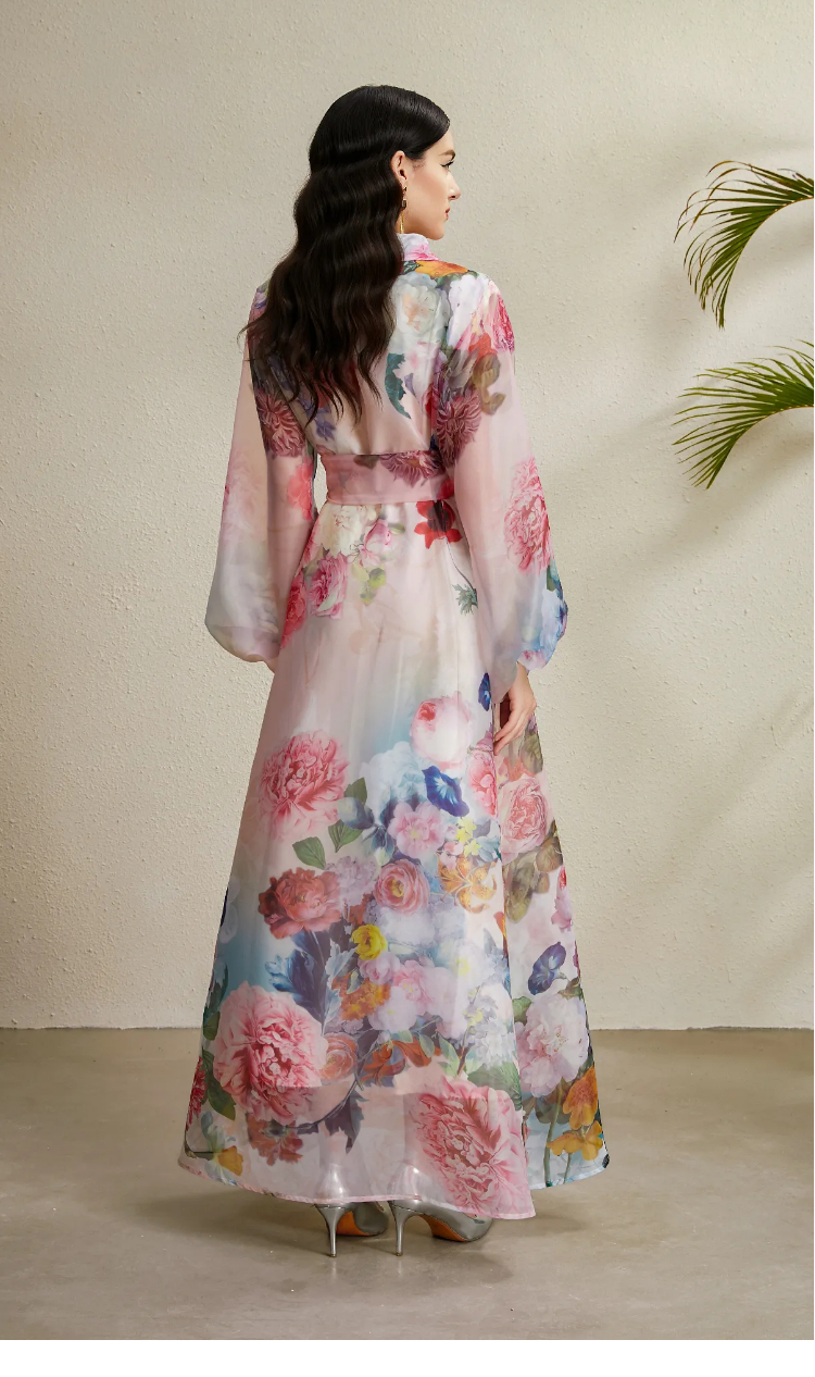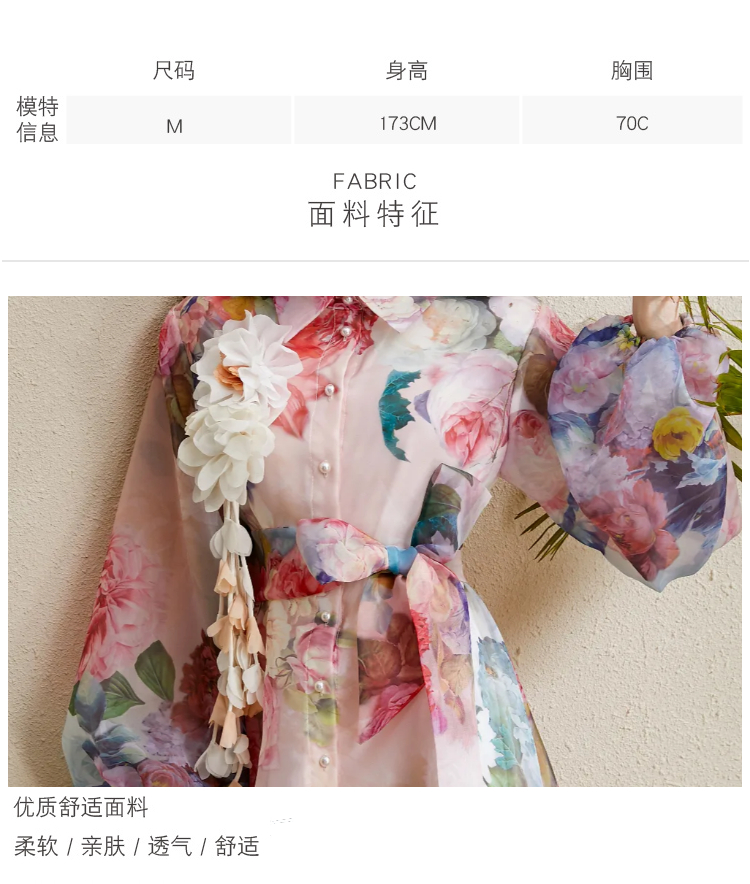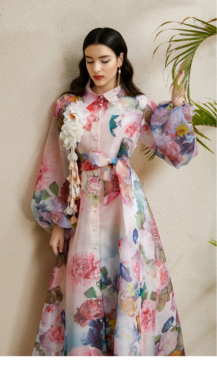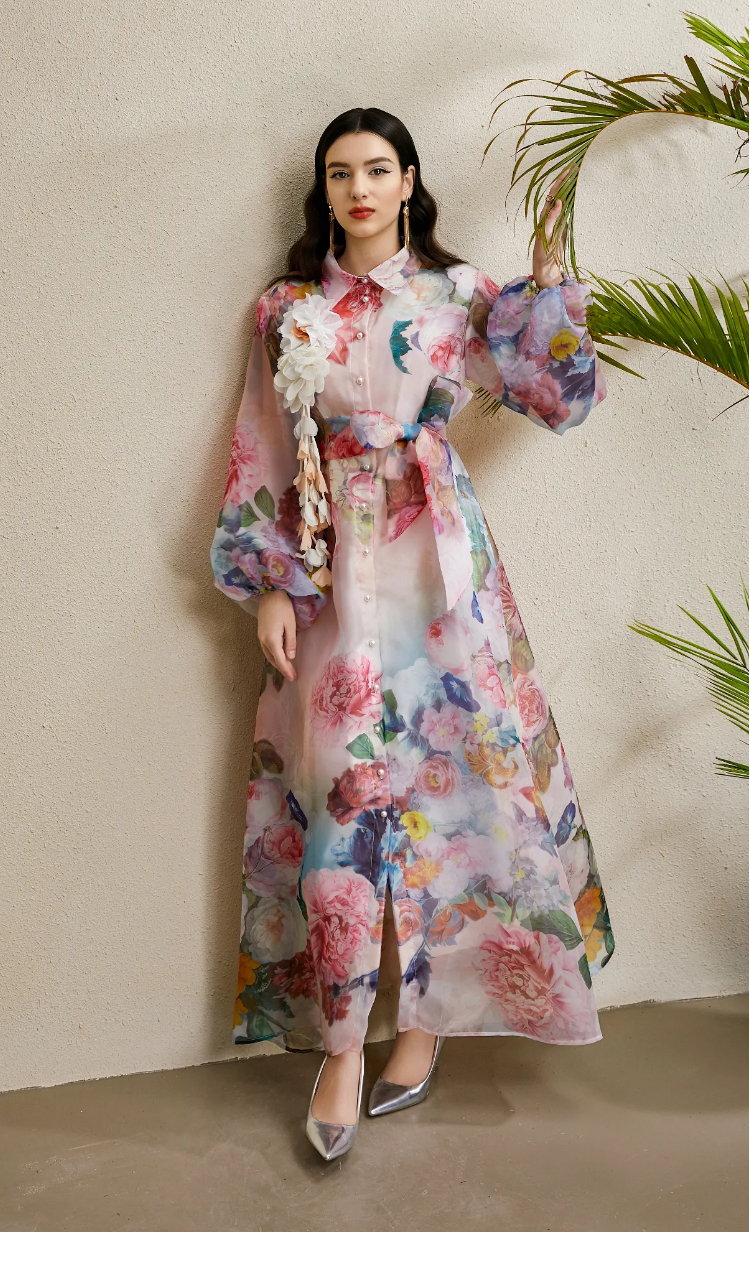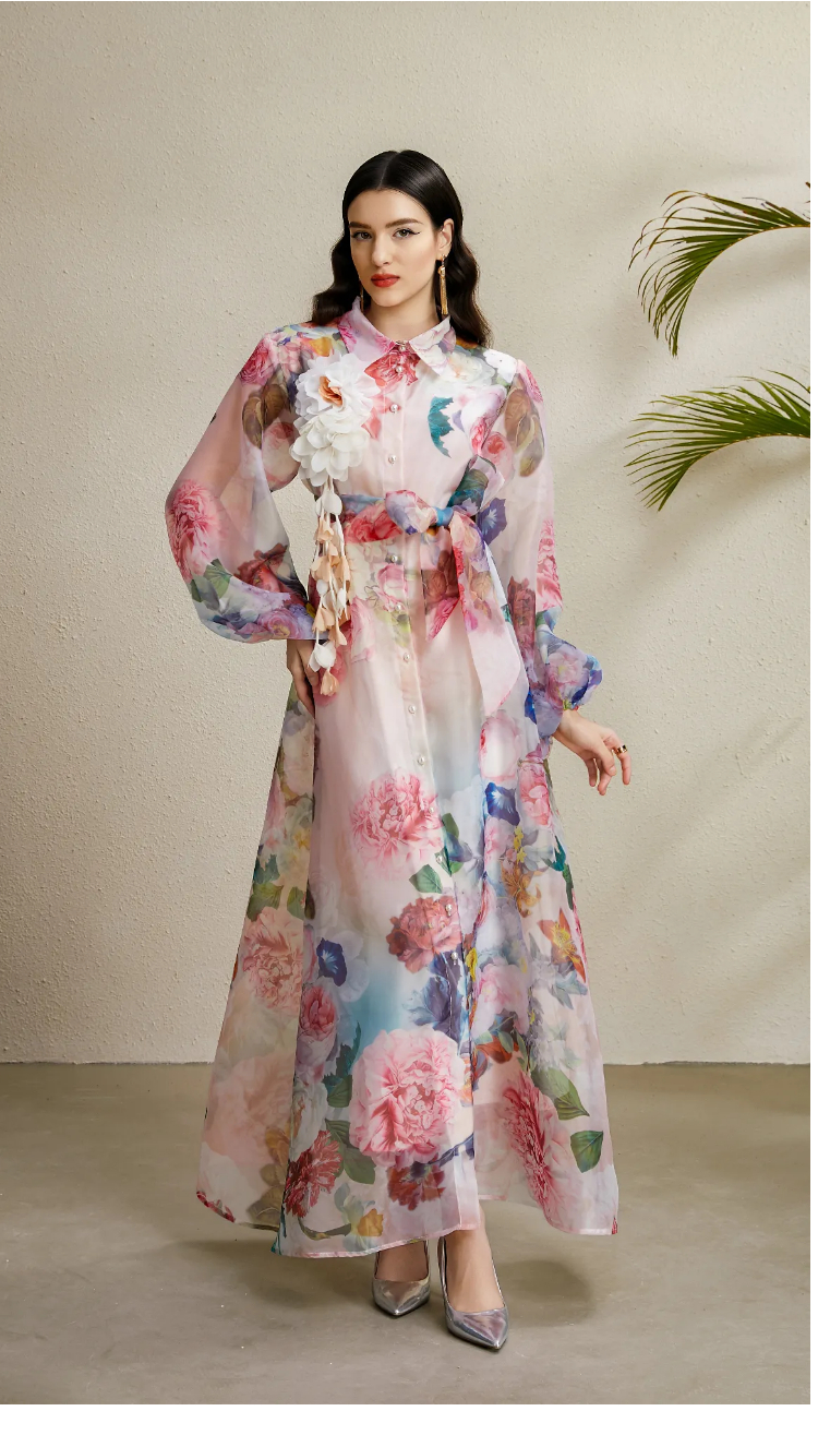 MY13969# KAROLINA翻领绑带胸花阔摆印花长款连衣裙女裝貨源服裝批發