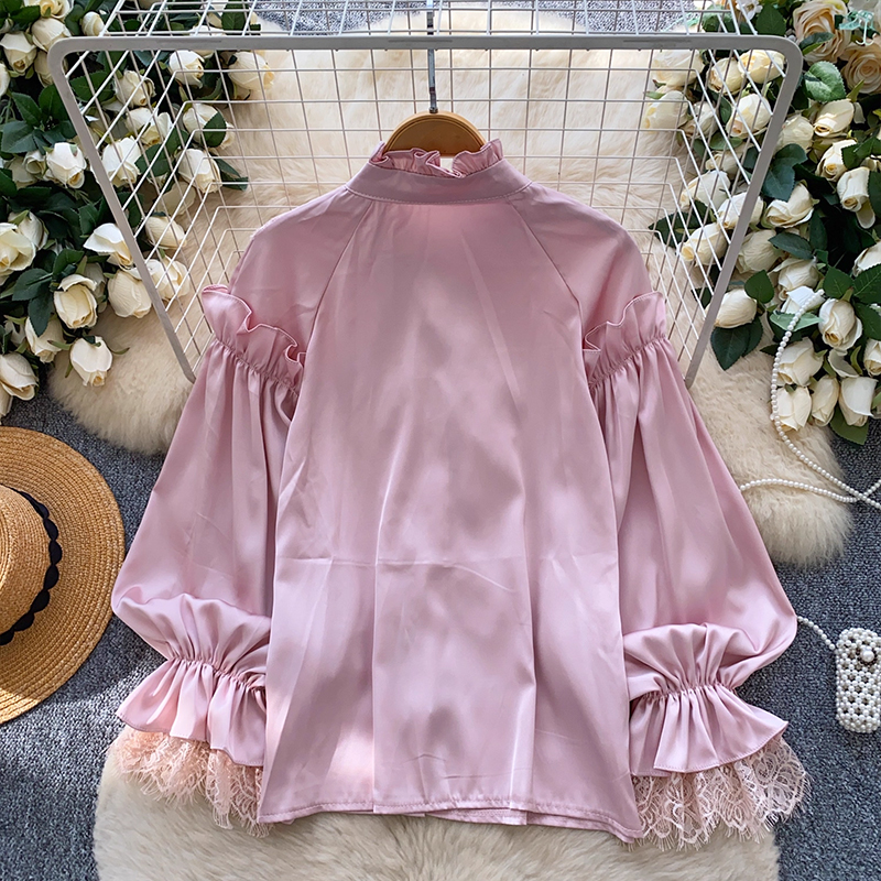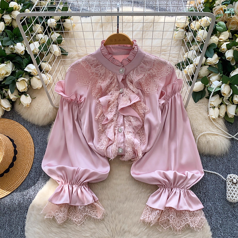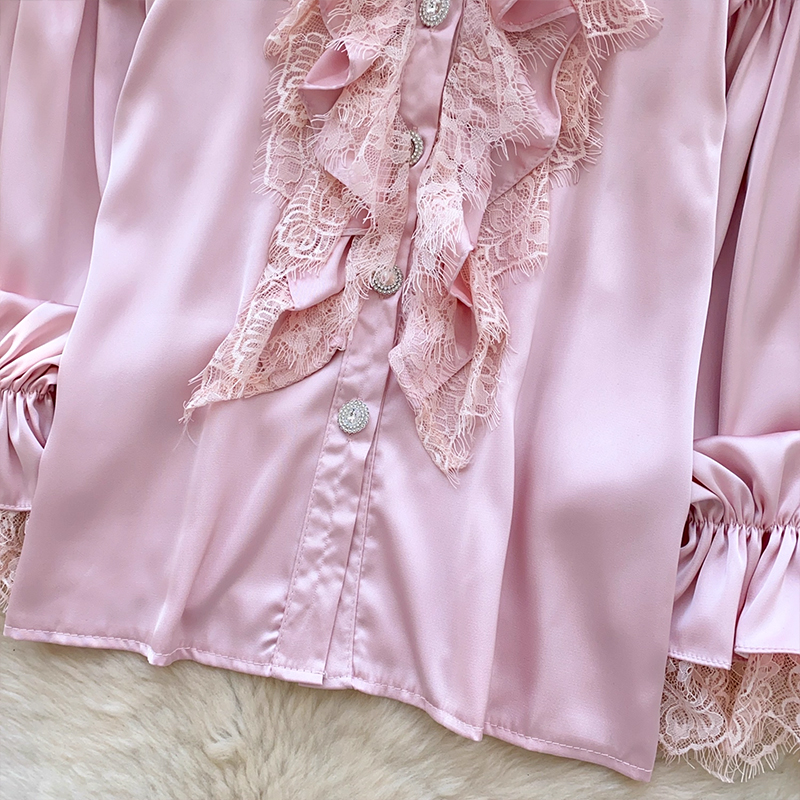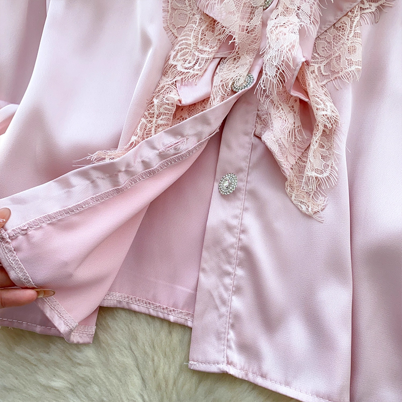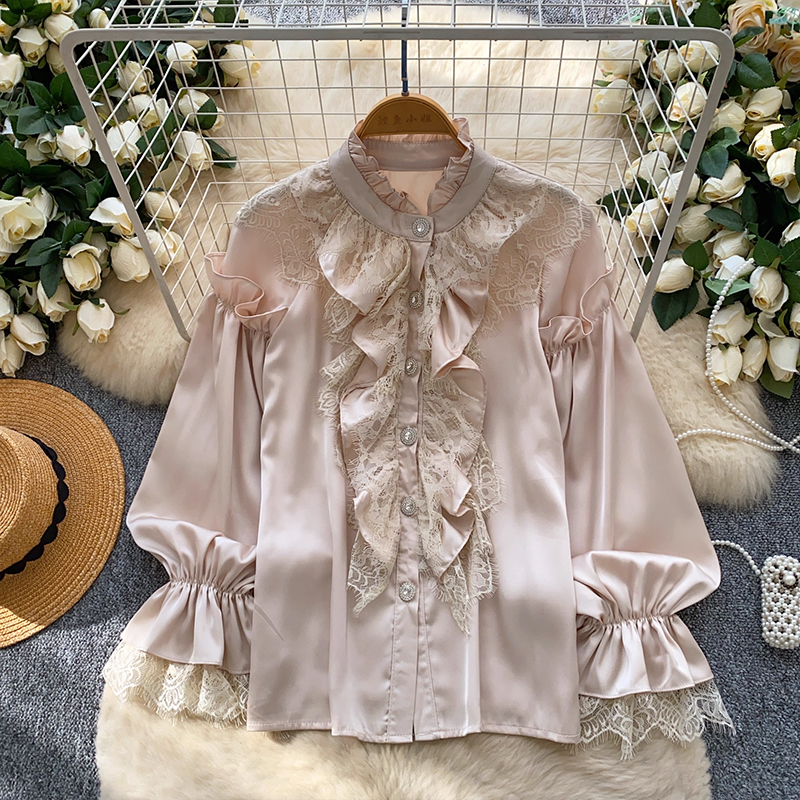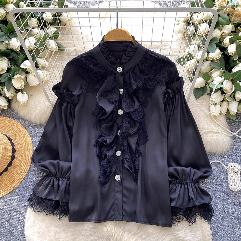 MY13972# 法式轻奢宫廷风蕾丝拼接长袖缎面衬衫宽松休闲开衫别致上衣女裝貨源服裝批發