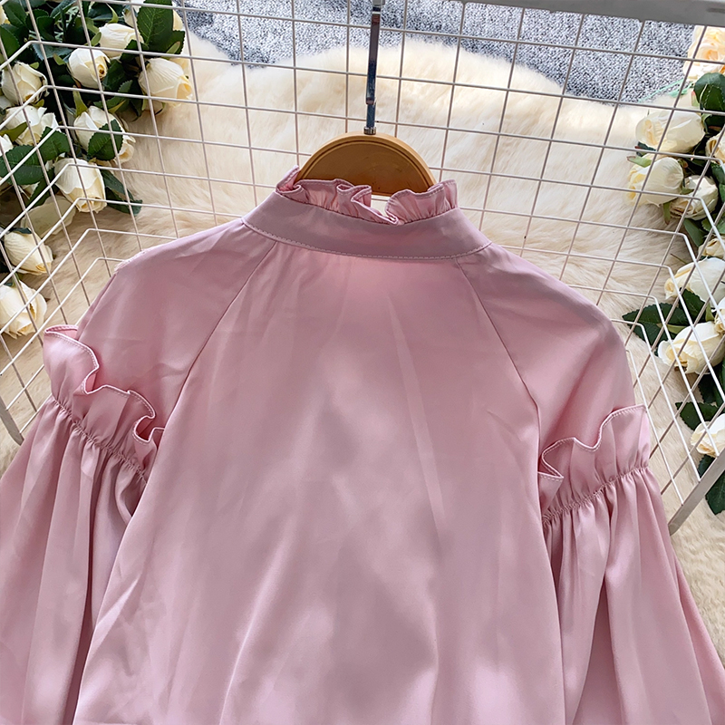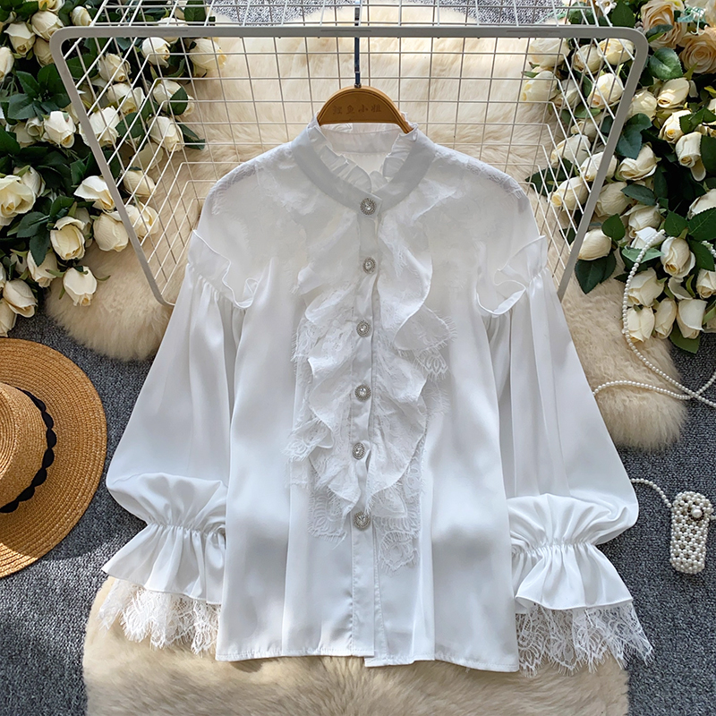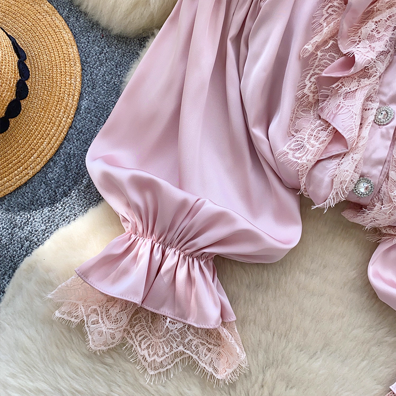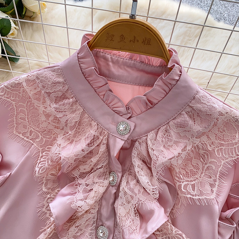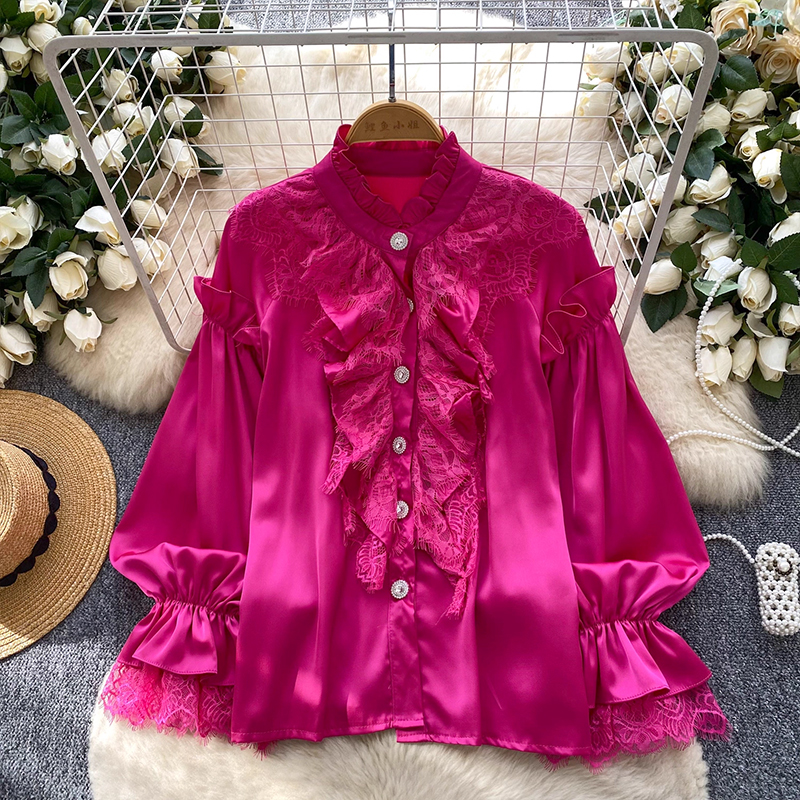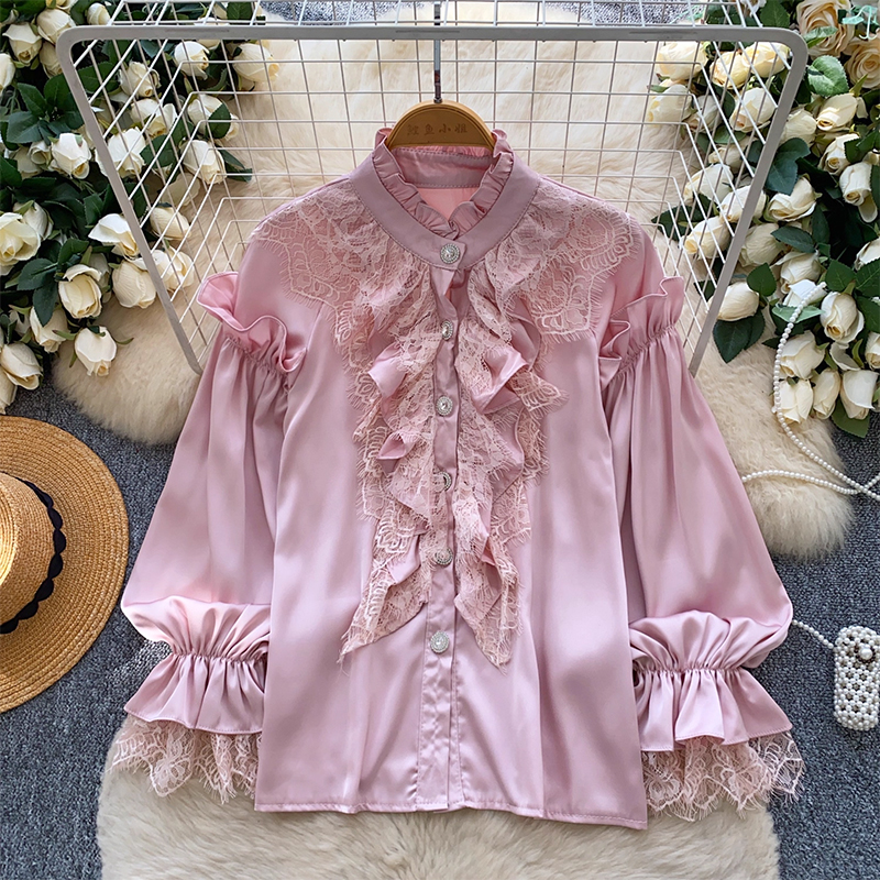 MY13972# 法式轻奢宫廷风蕾丝拼接长袖缎面衬衫宽松休闲开衫别致上衣女裝貨源服裝批發
