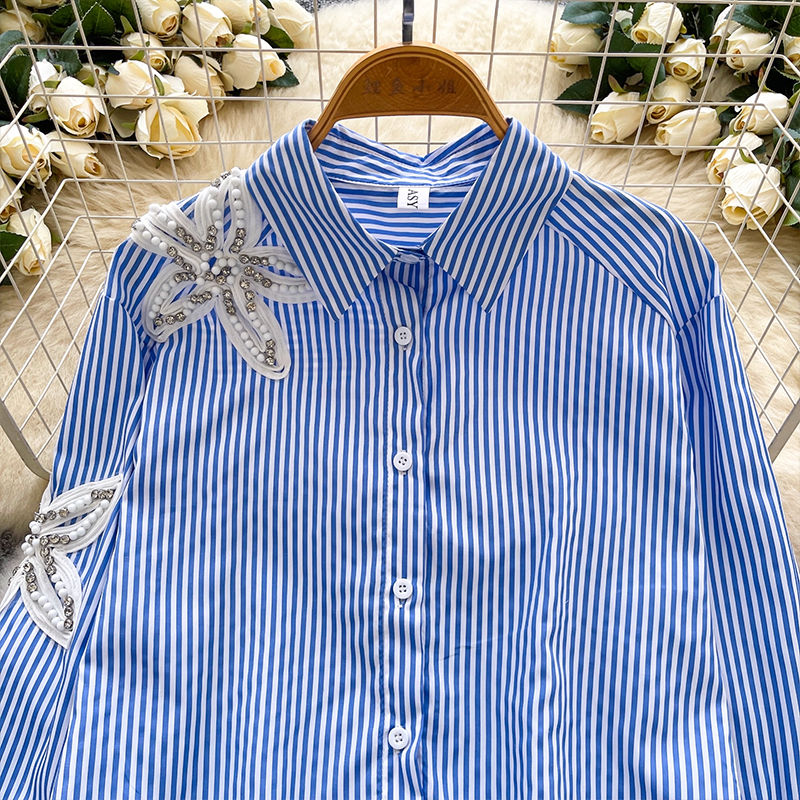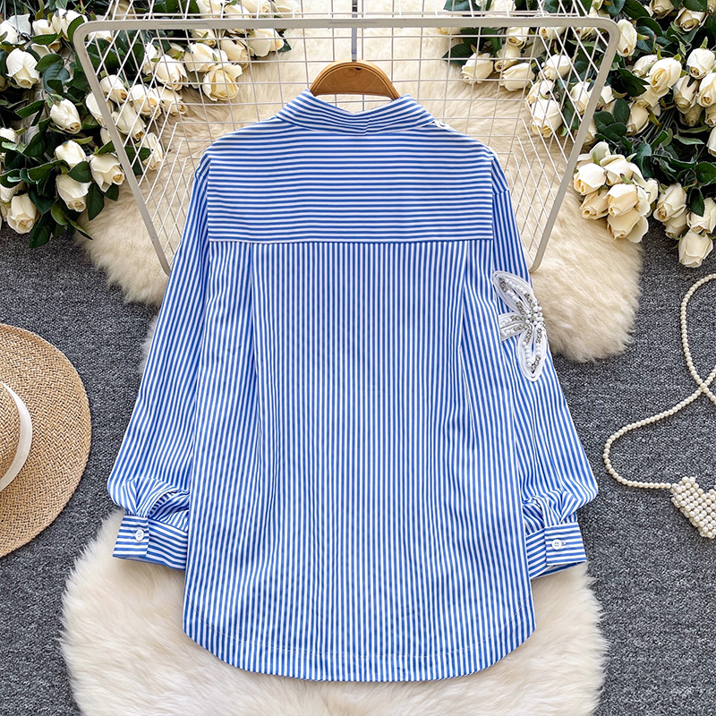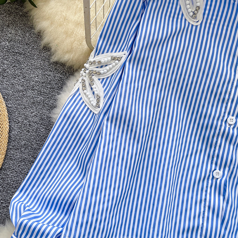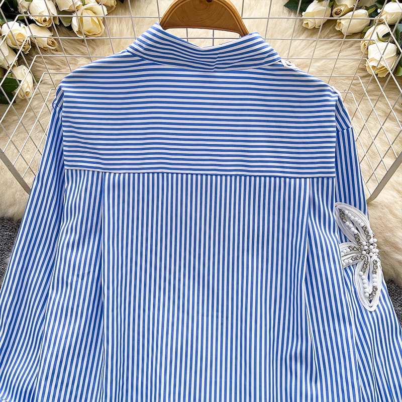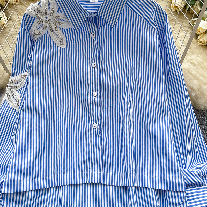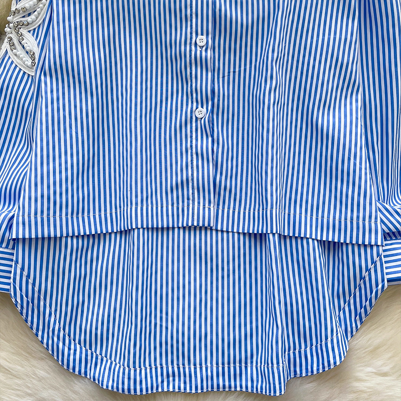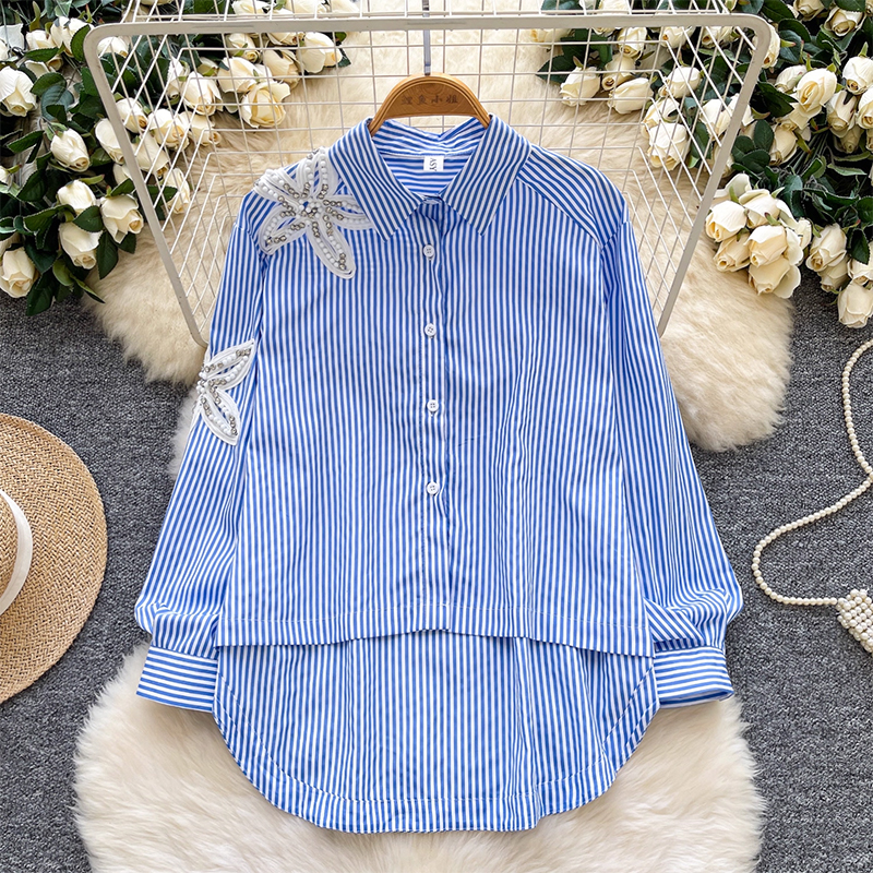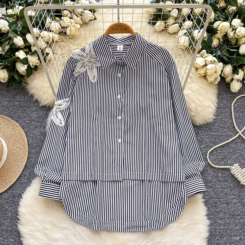 MY13973# 韩国东大门休闲衬衫时尚重工钉钻刺绣宽松不规则条纹上衣女裝貨源服裝批發