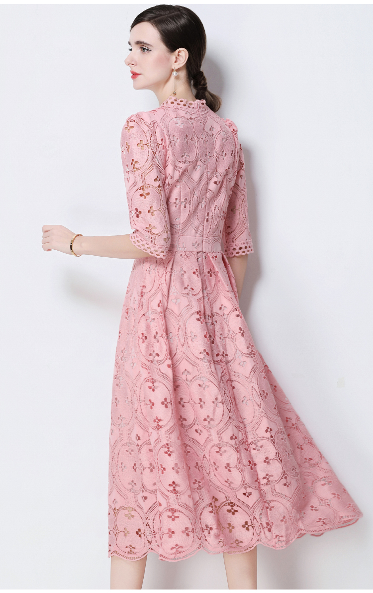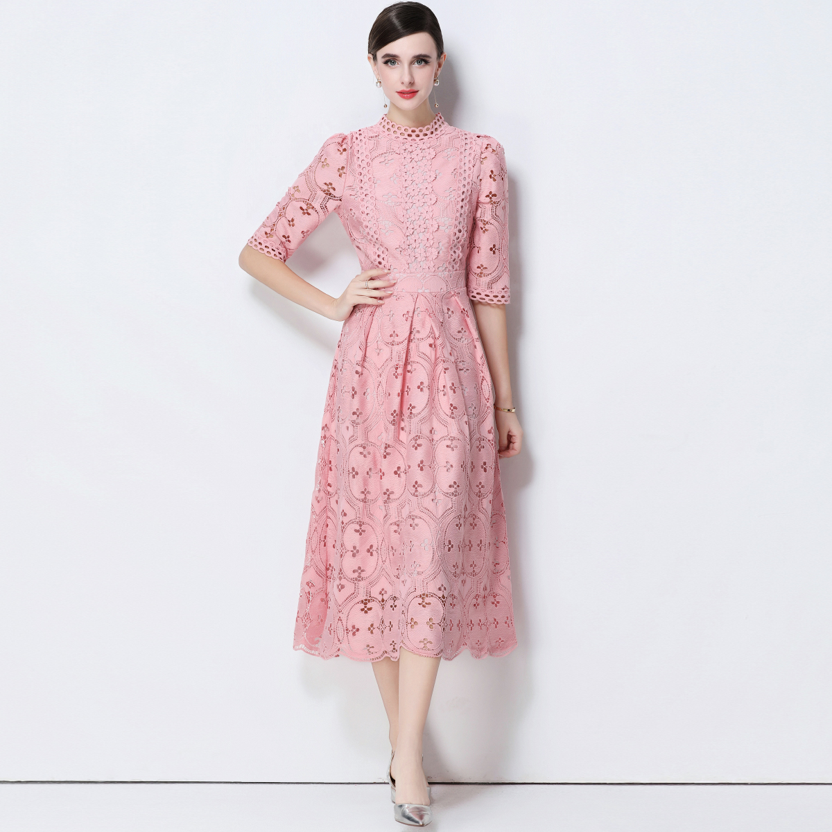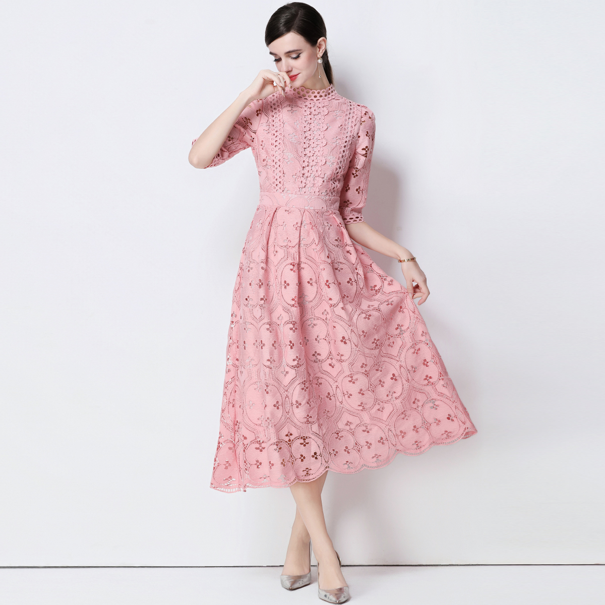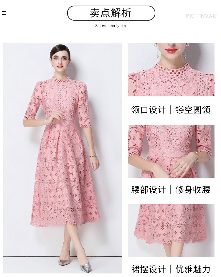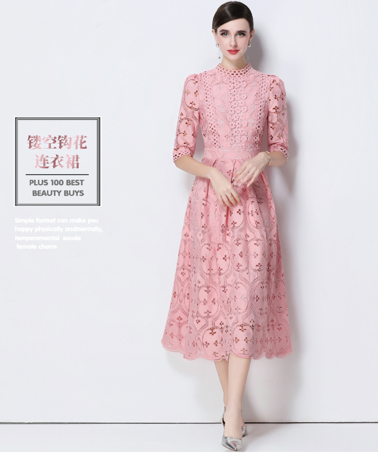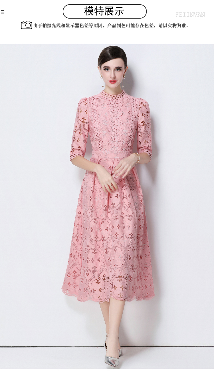MY13981# 法式气质重工镂空钩花七分袖连衣裙女收腰显瘦优雅裙子女裝貨源服裝批發