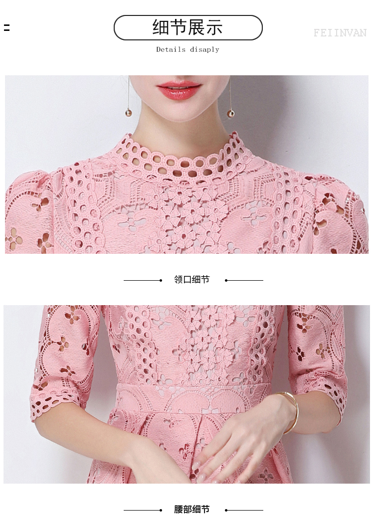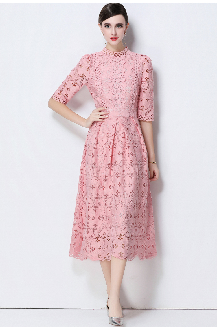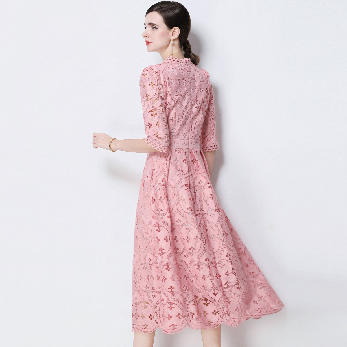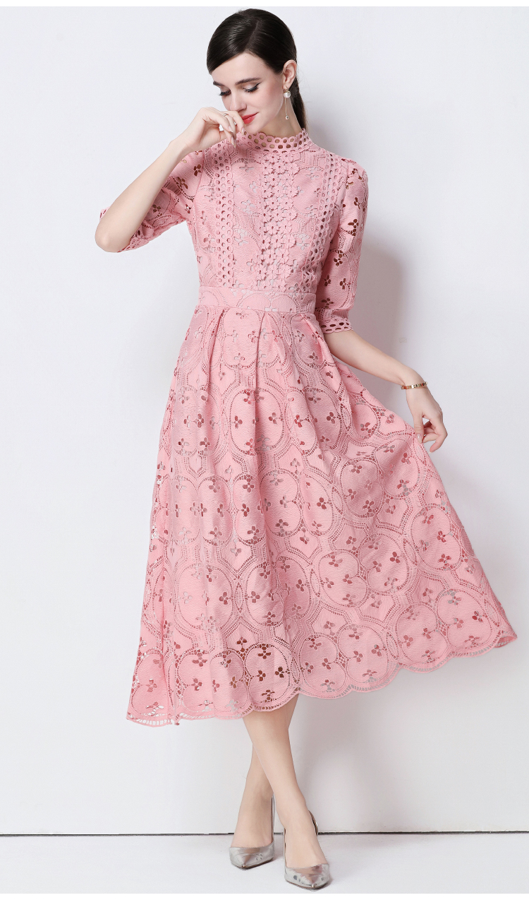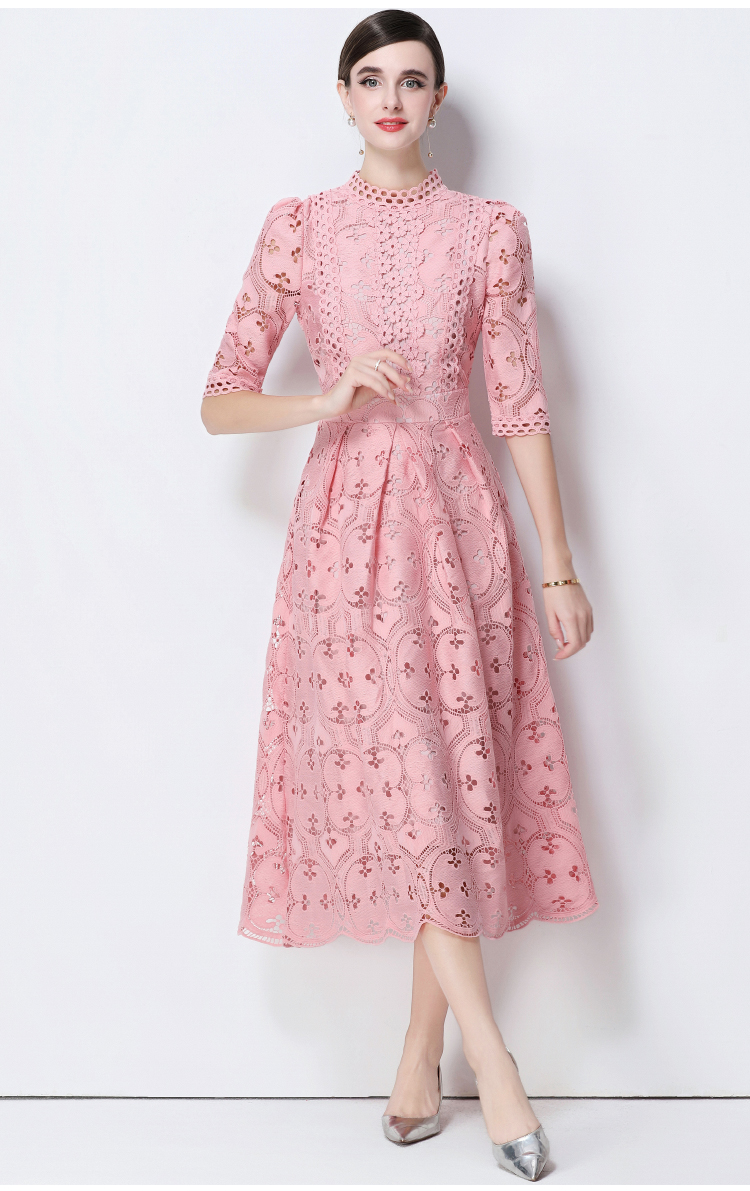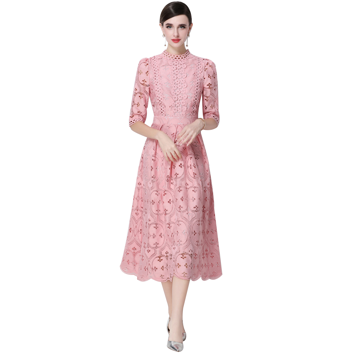 MY13981# 法式气质重工镂空钩花七分袖连衣裙女收腰显瘦优雅裙子女裝貨源服裝批發