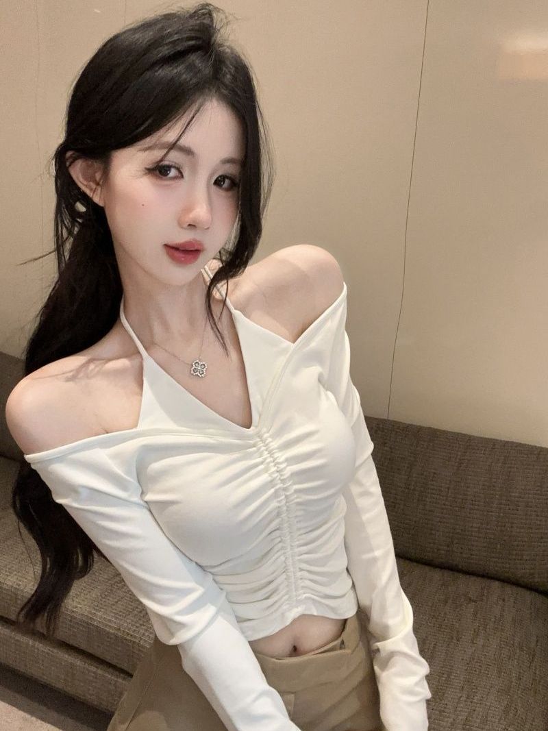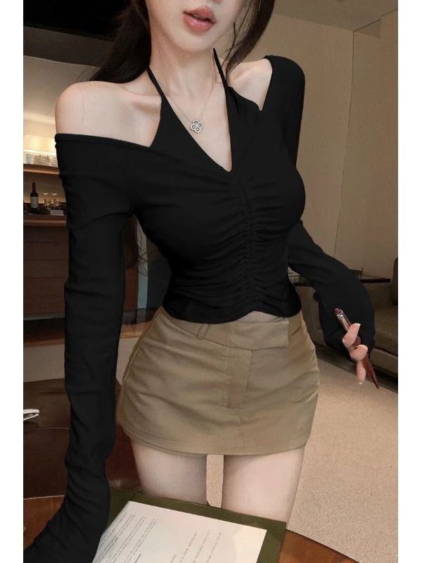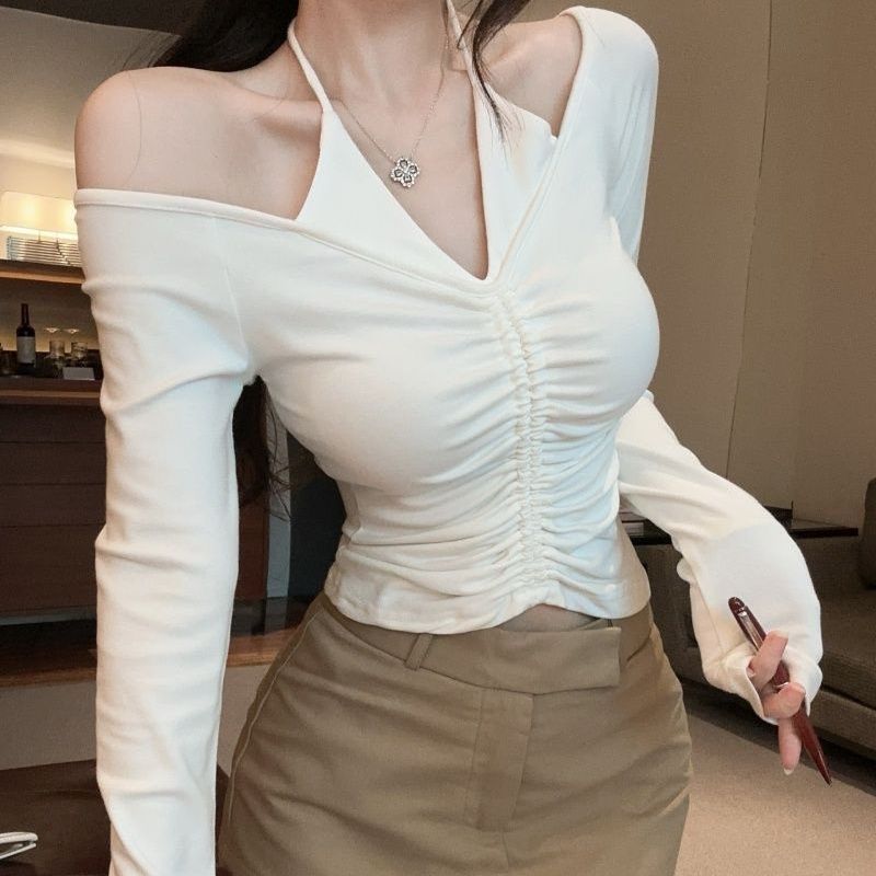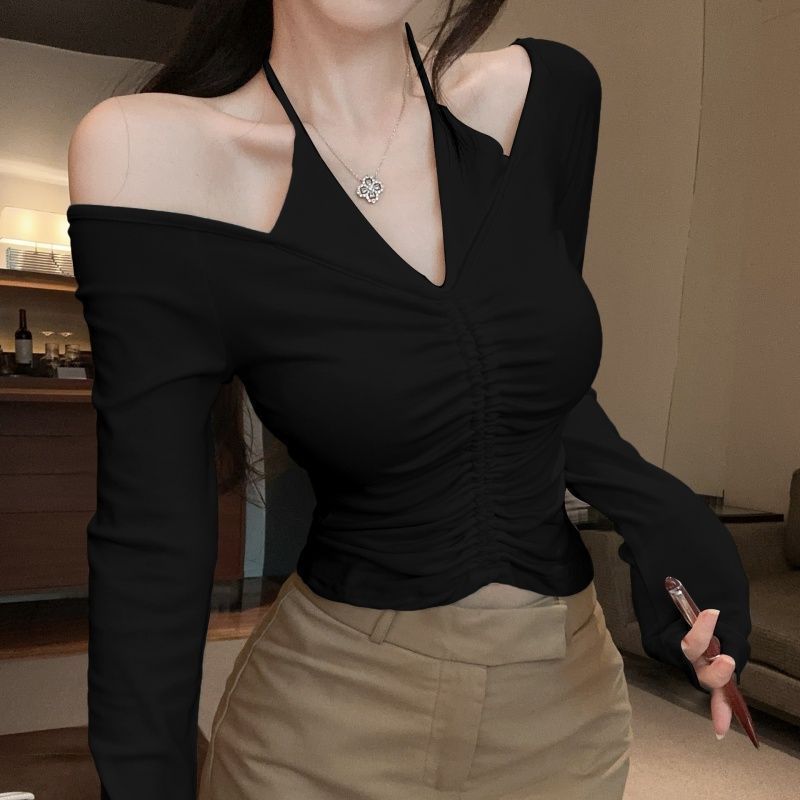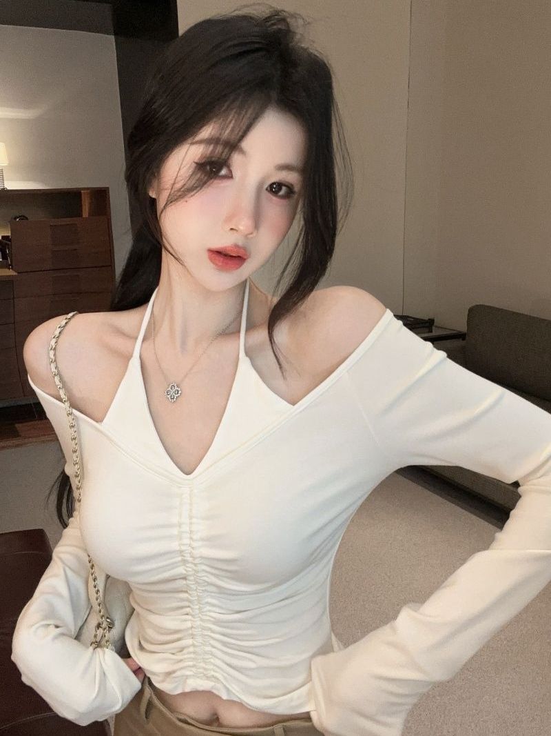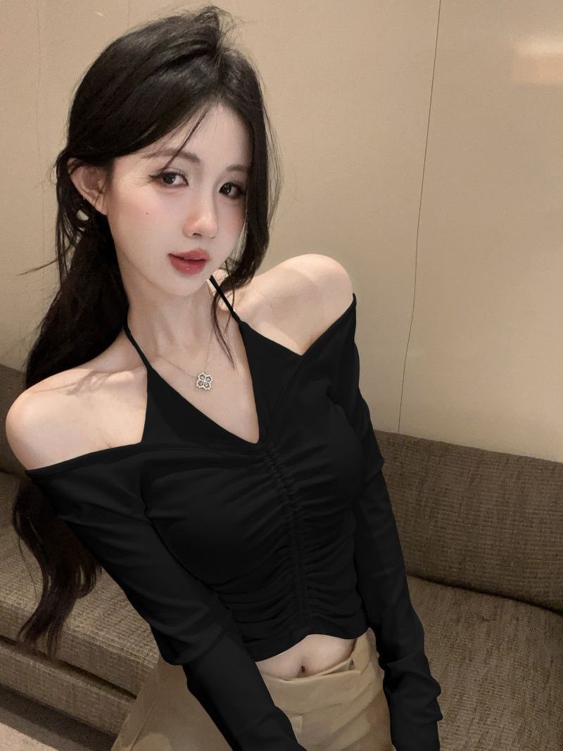 MY13989# 假两件挂脖长袖t恤纯欲辣妹风一字肩挂脖上衣打底内搭女裝貨源服裝批發
