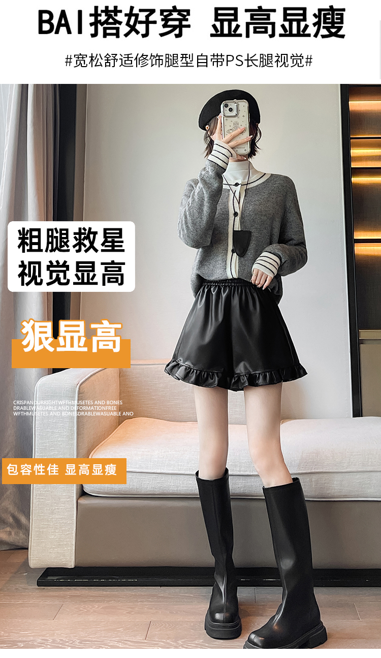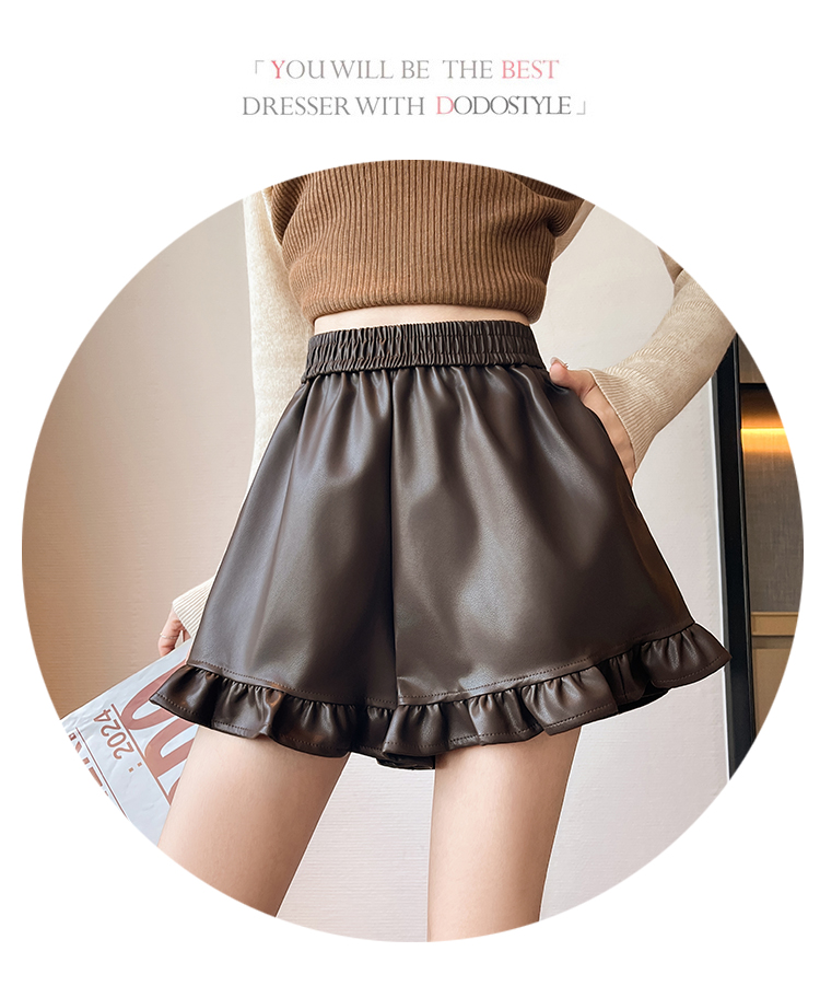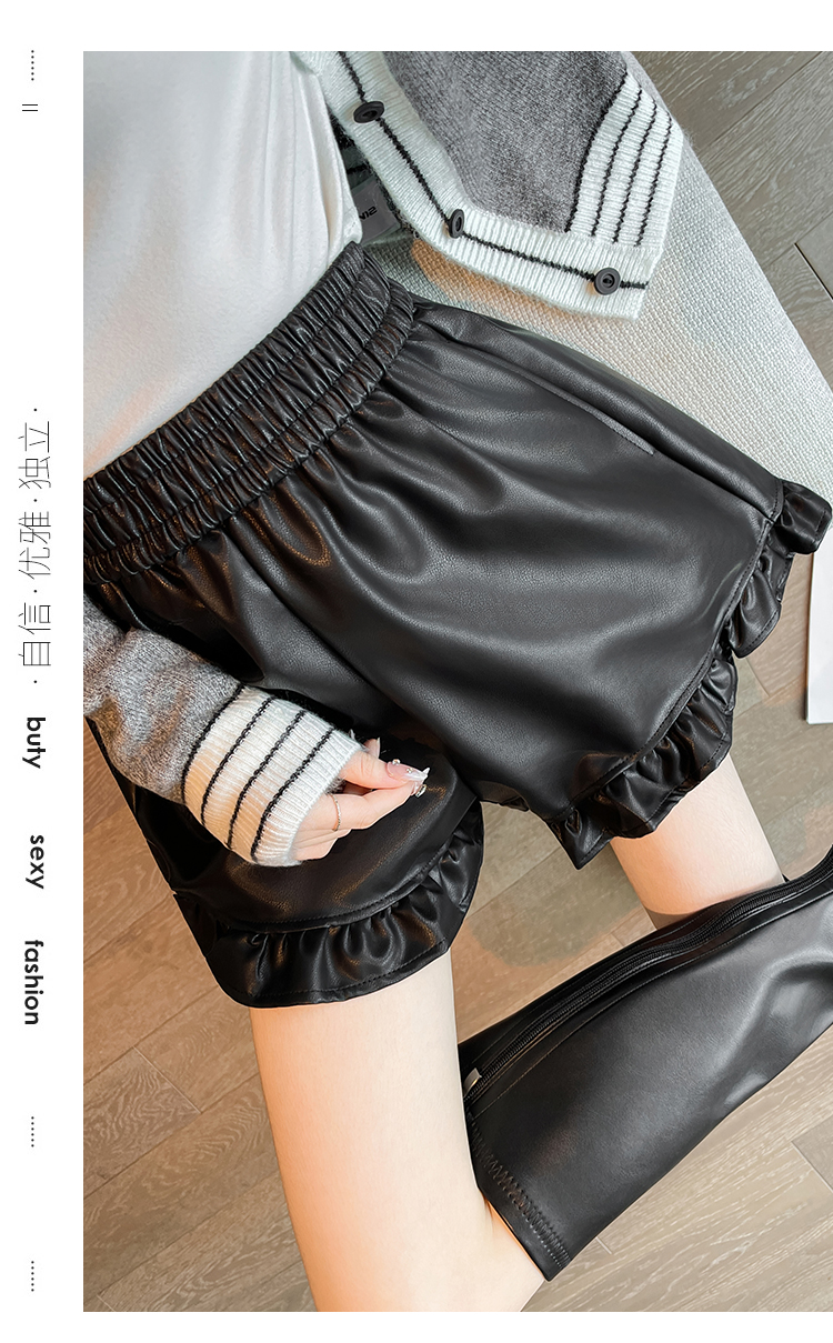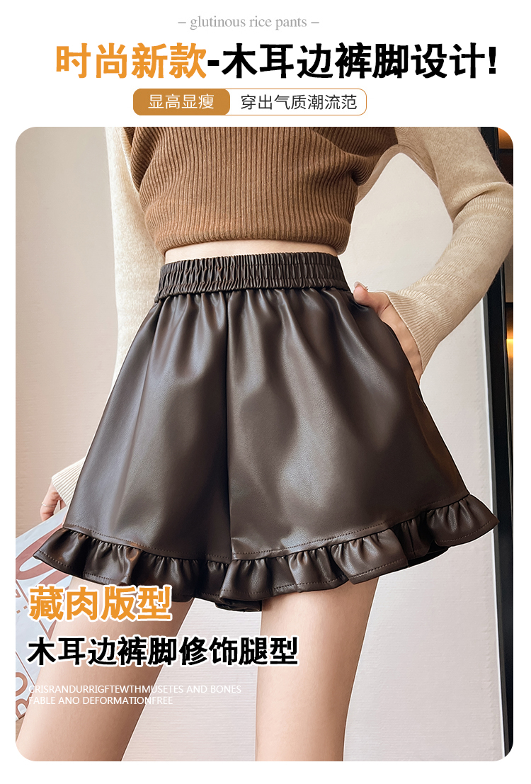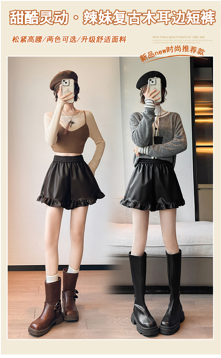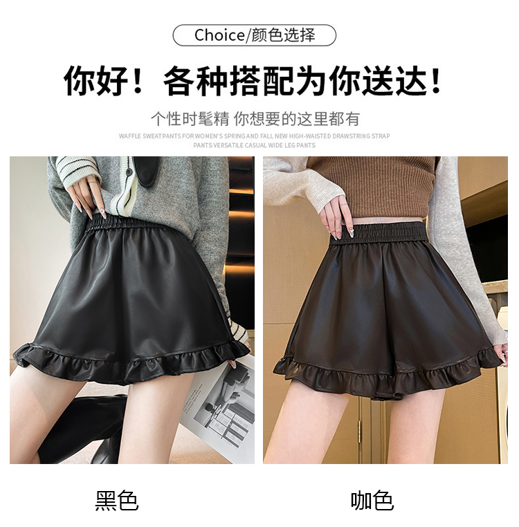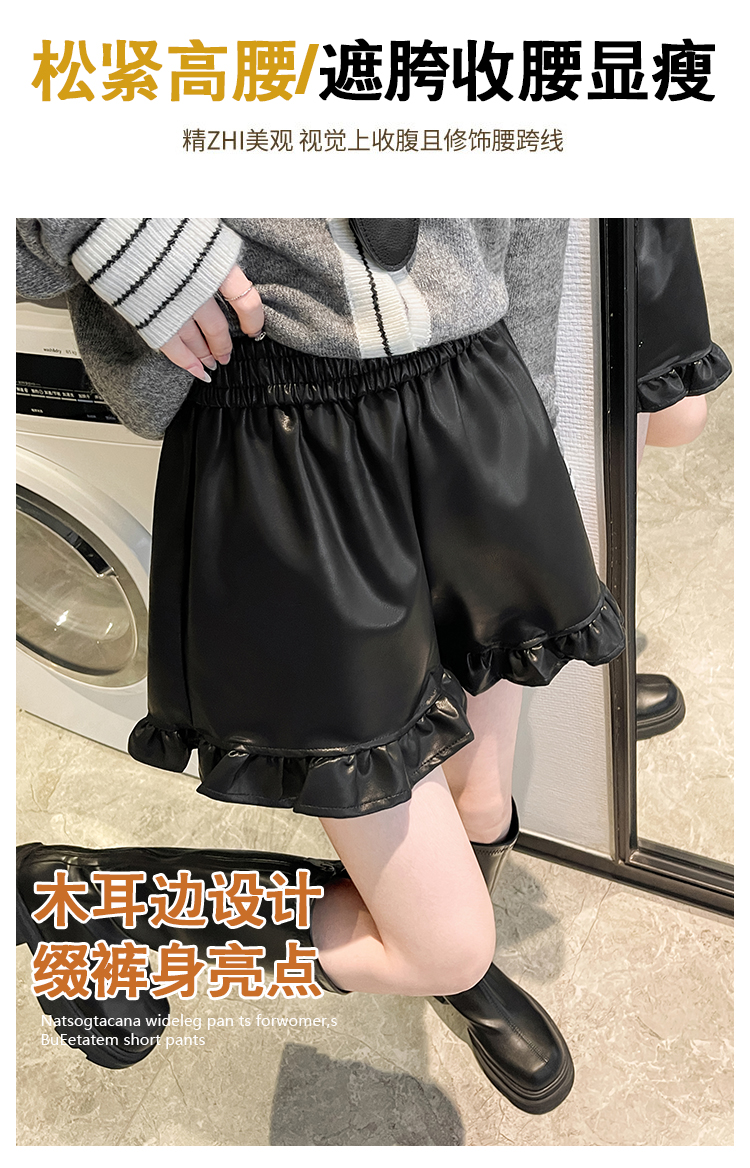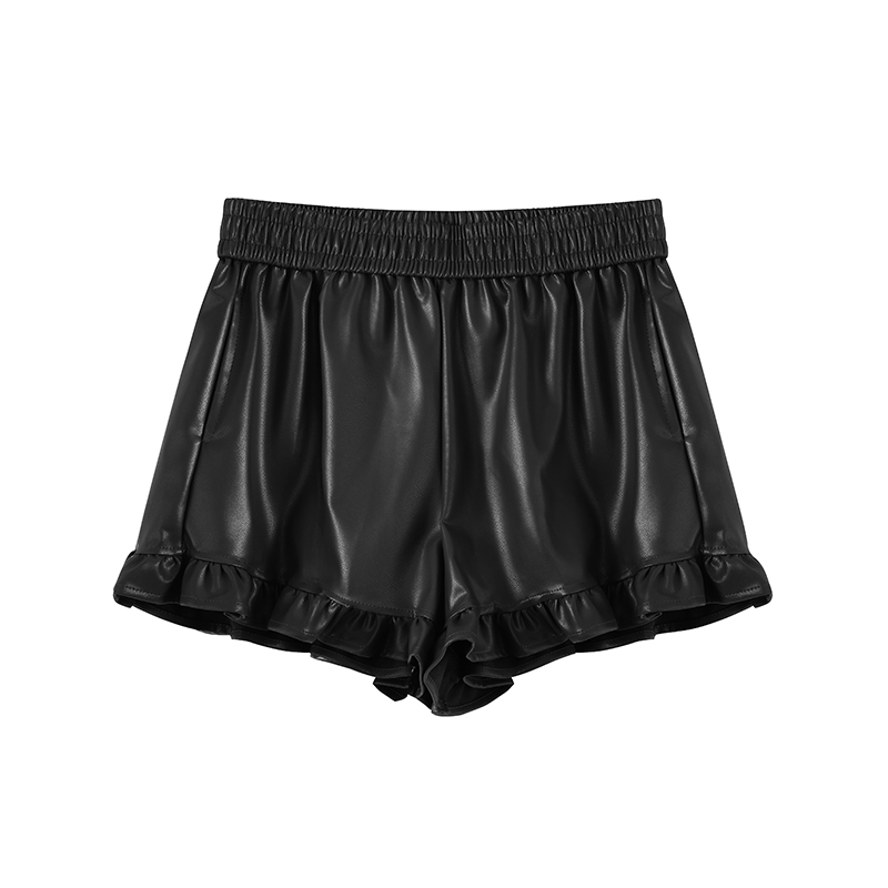 MY14017# 黑色木耳边PU皮休闲短裤外穿气质百搭款式显瘦阔腿短裤子女裝貨源服裝批發
