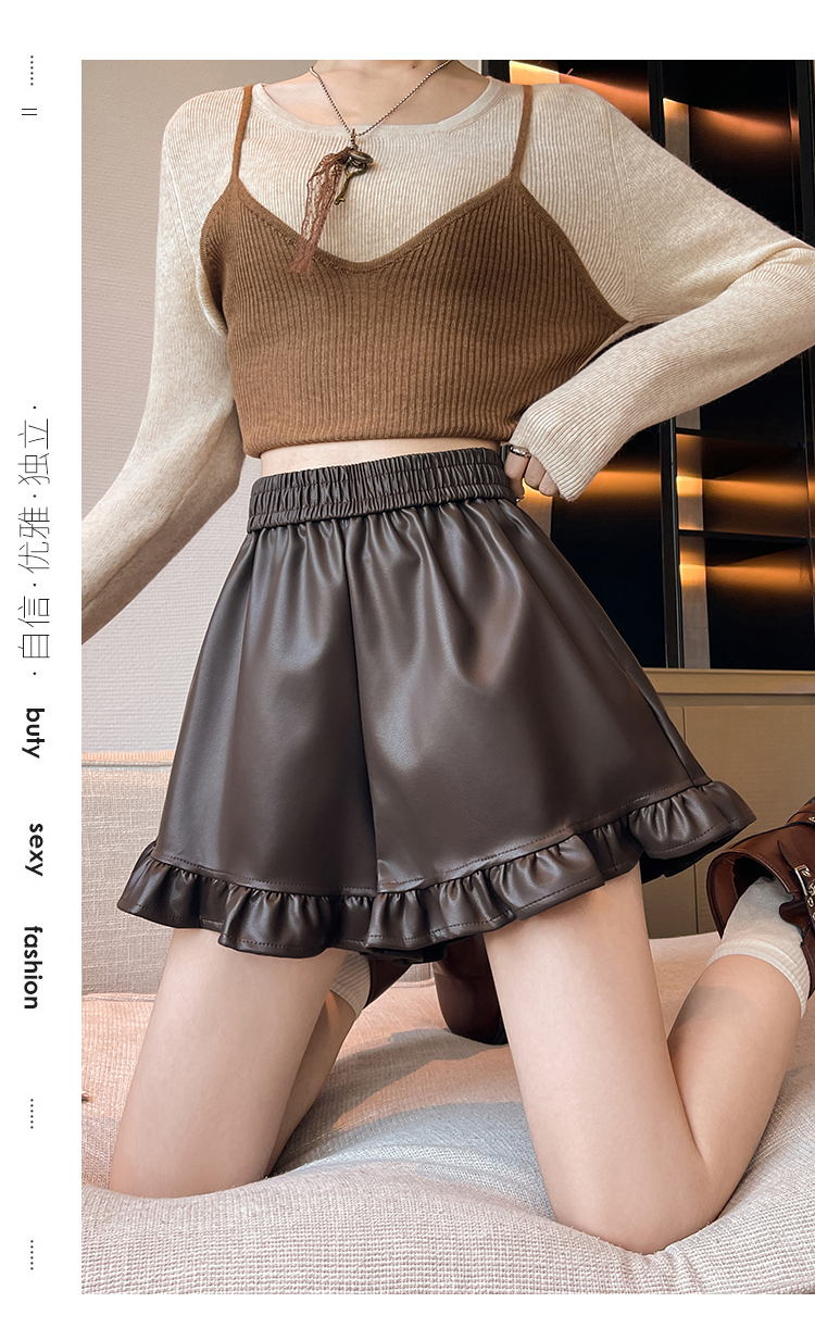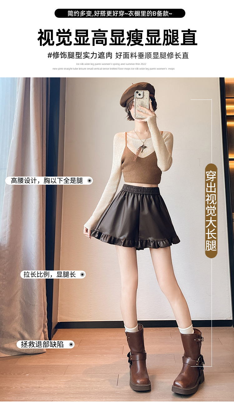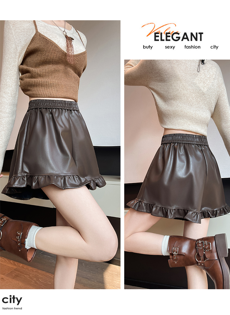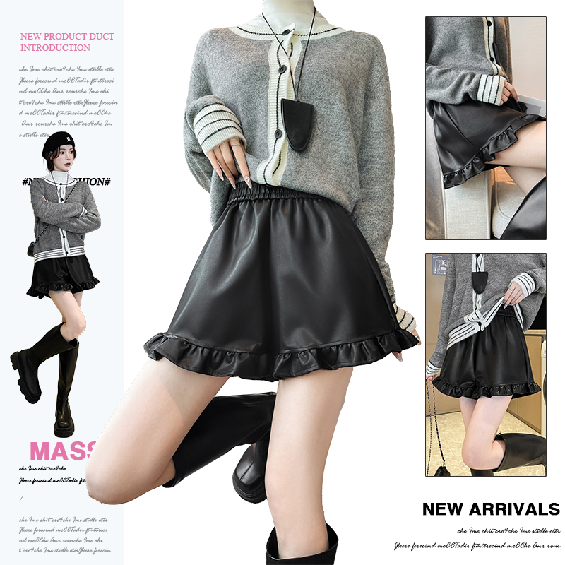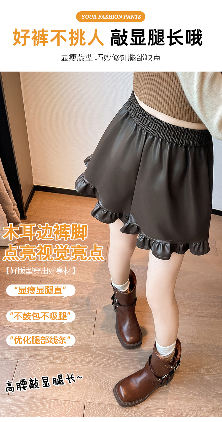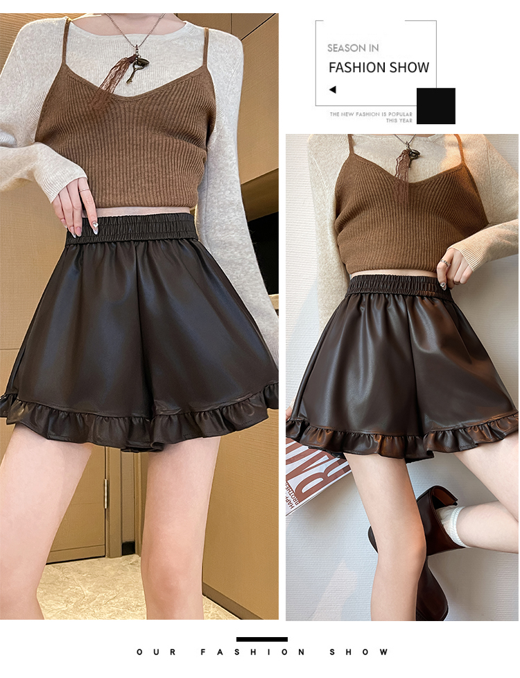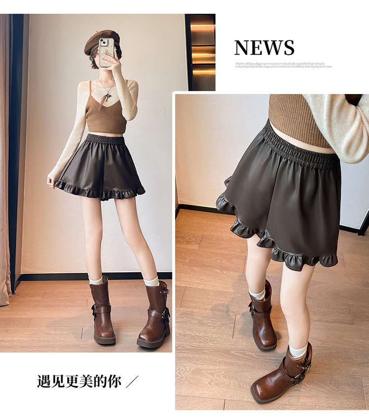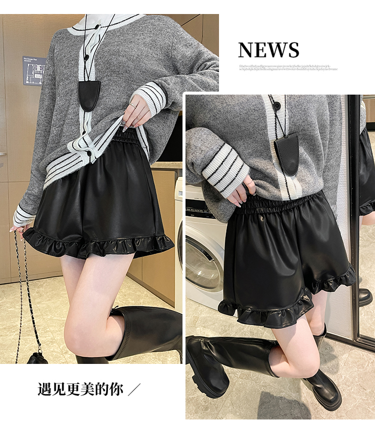 MY14017# 黑色木耳边PU皮休闲短裤外穿气质百搭款式显瘦阔腿短裤子女裝貨源服裝批發