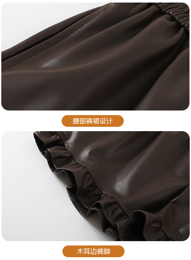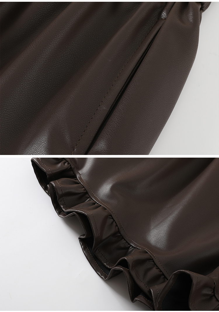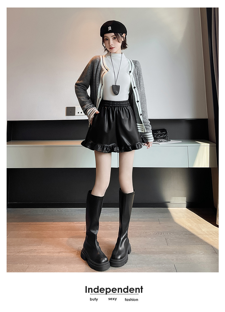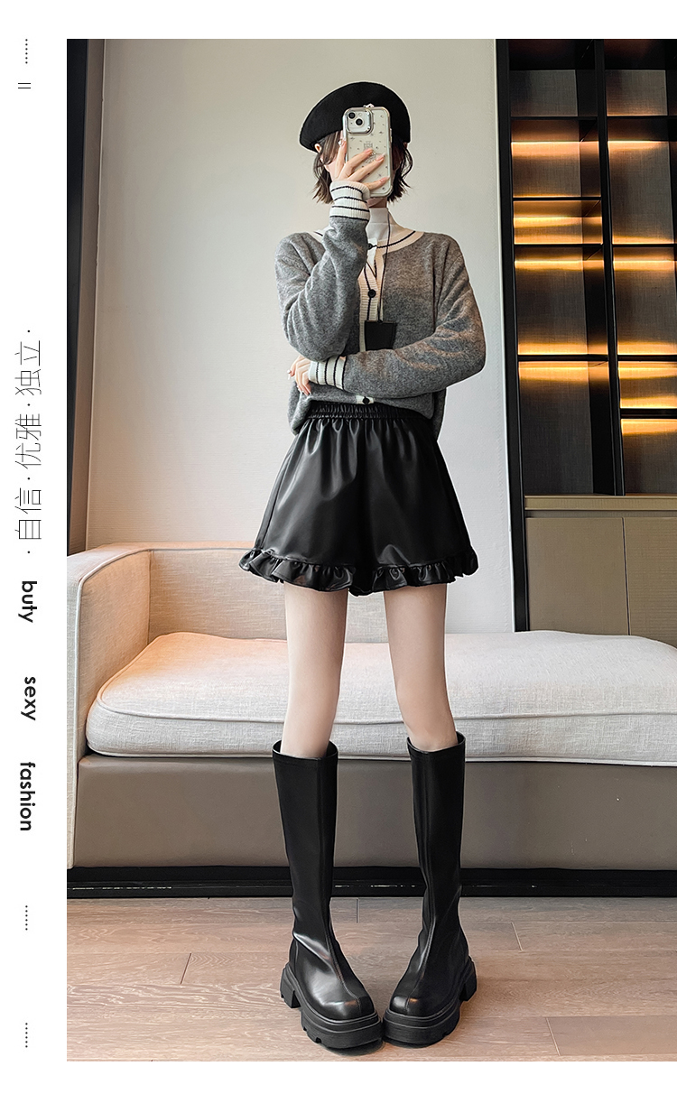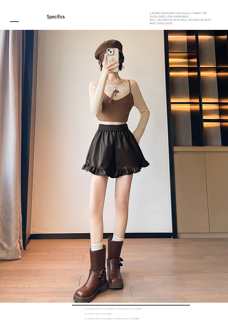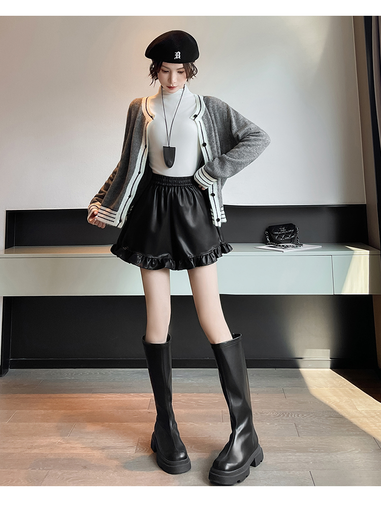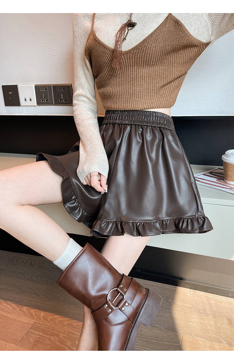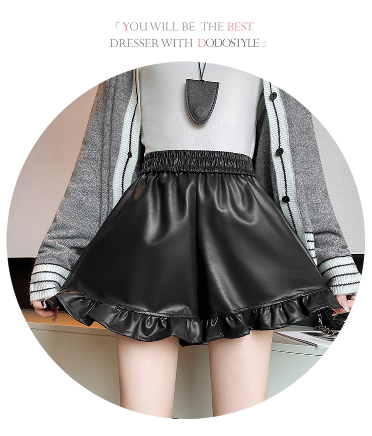 MY14017# 黑色木耳边PU皮休闲短裤外穿气质百搭款式显瘦阔腿短裤子女裝貨源服裝批發