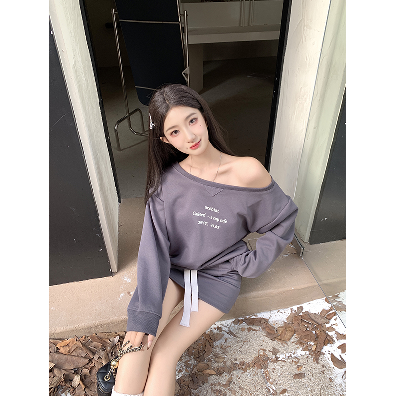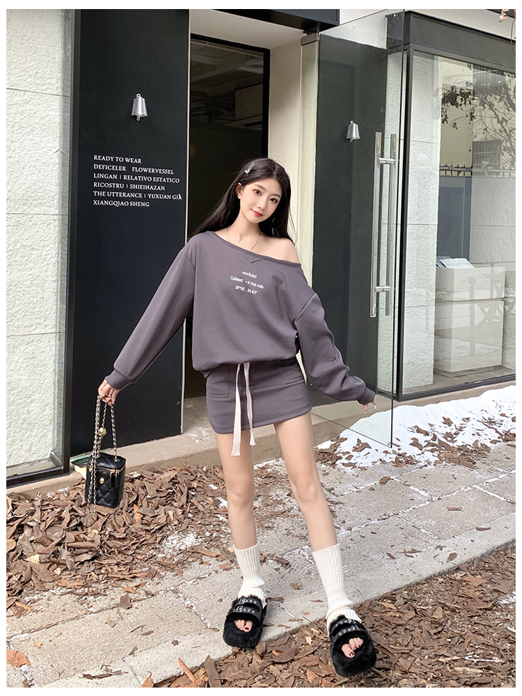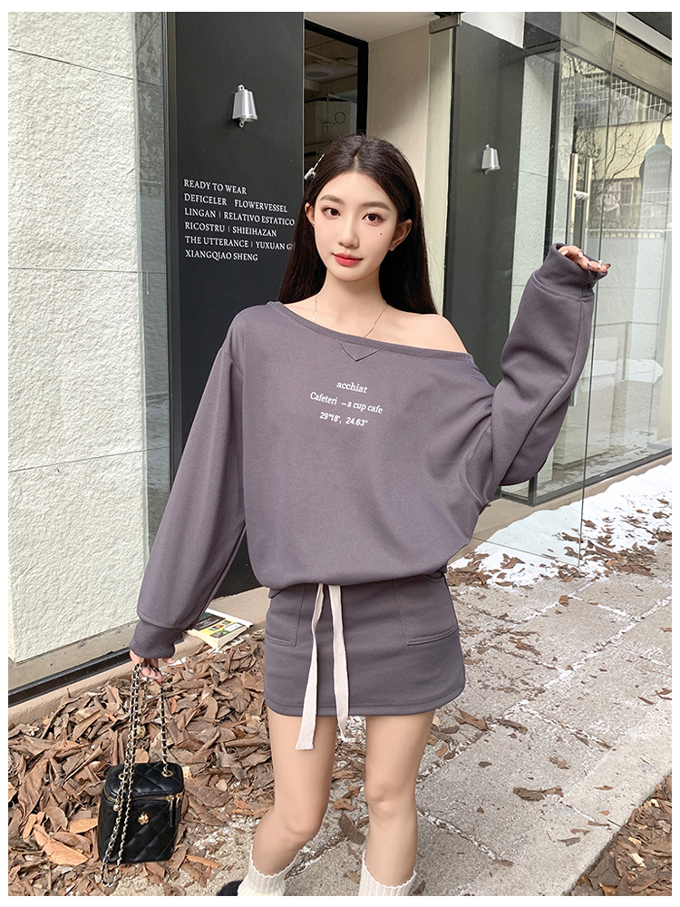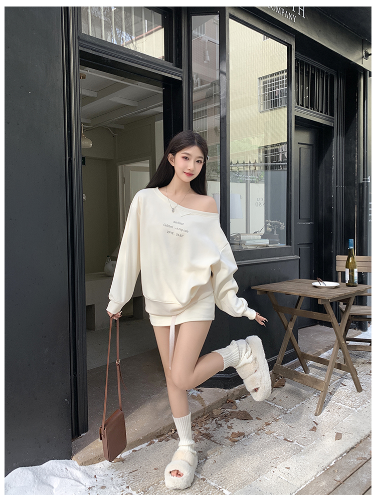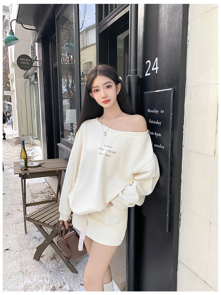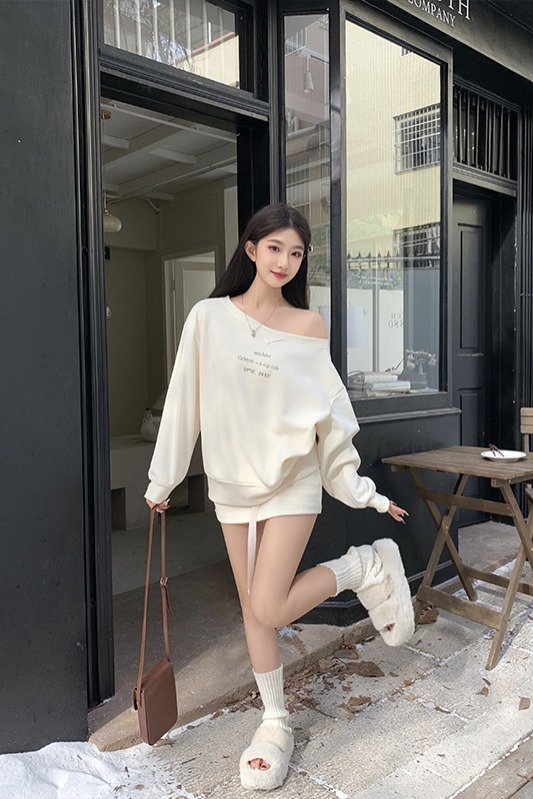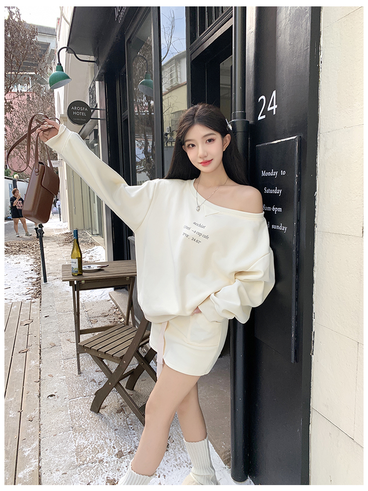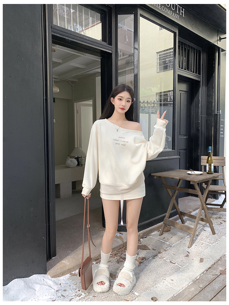 MY14091# 休闲运动两件套米白色一字肩长袖卫衣女装卫裙半身裙套装女裝貨源服裝批發