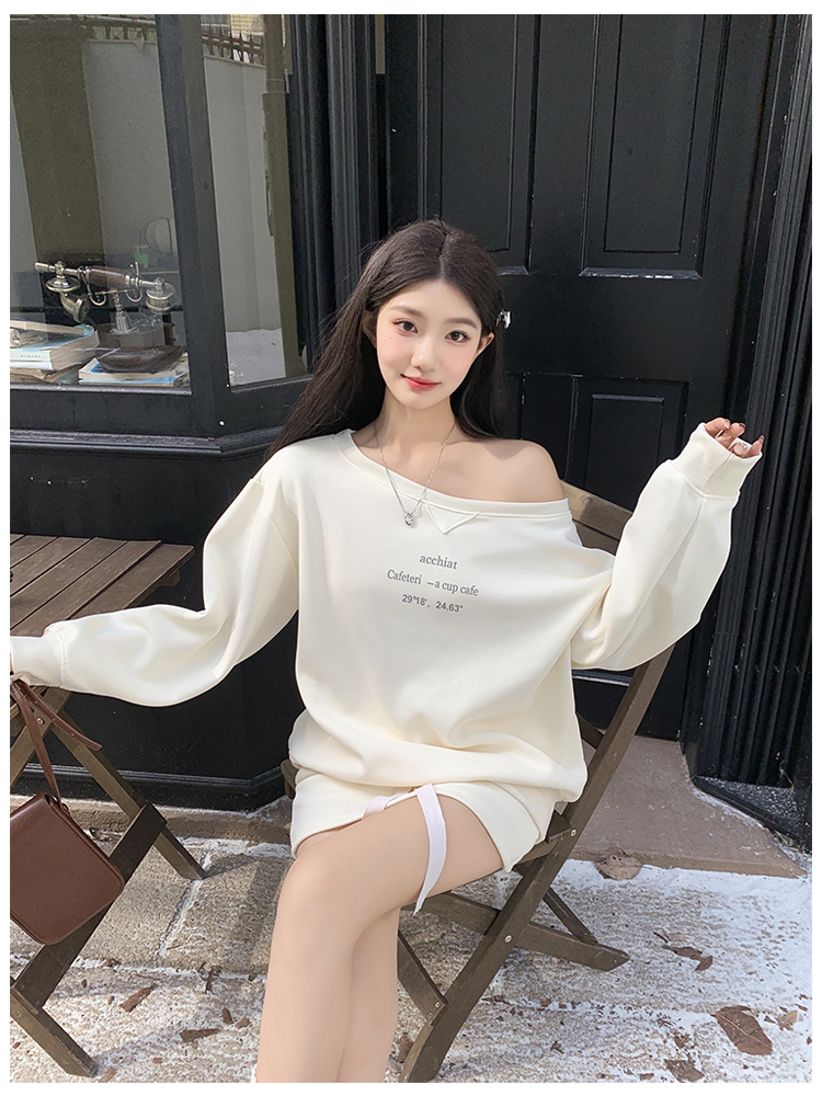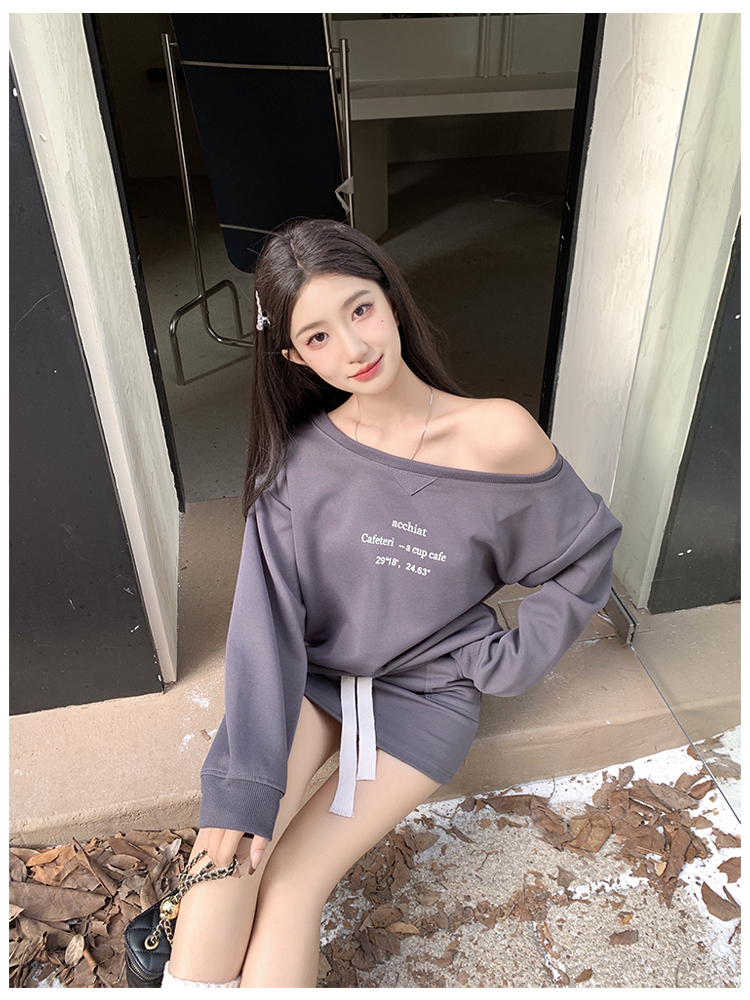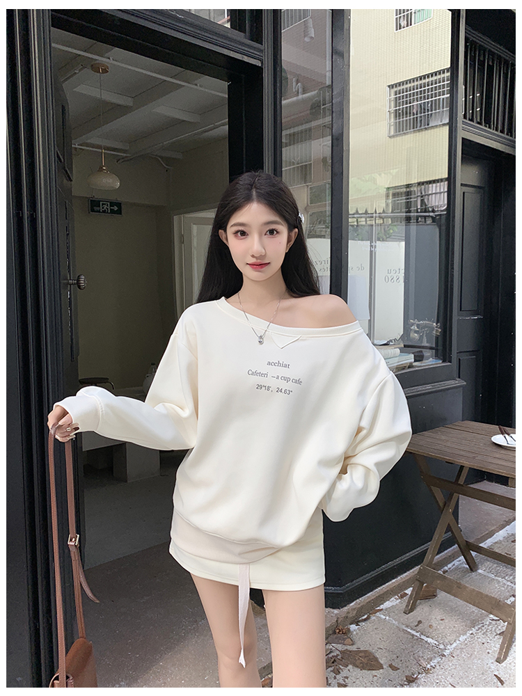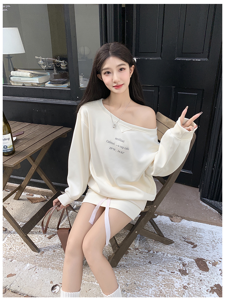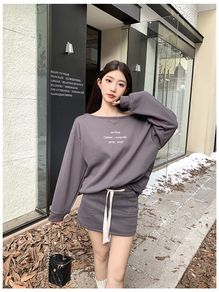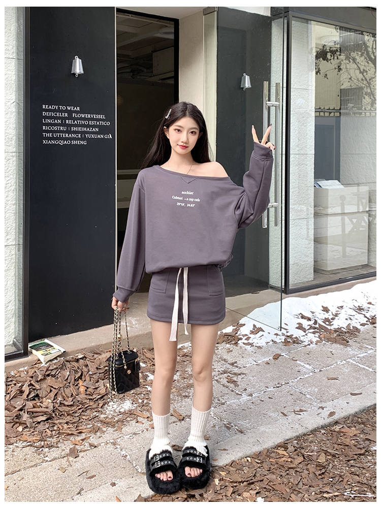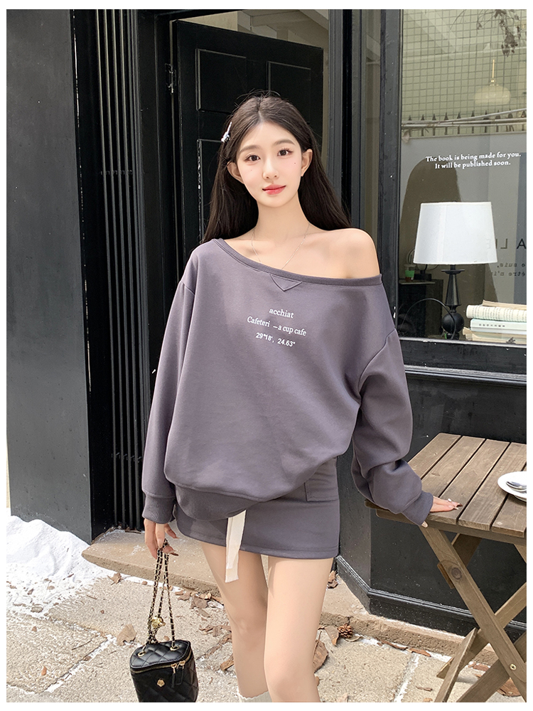 MY14091# 休闲运动两件套米白色一字肩长袖卫衣女装卫裙半身裙套装女裝貨源服裝批發