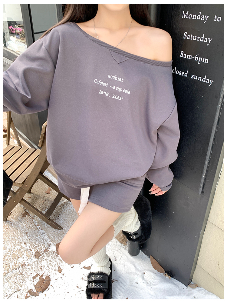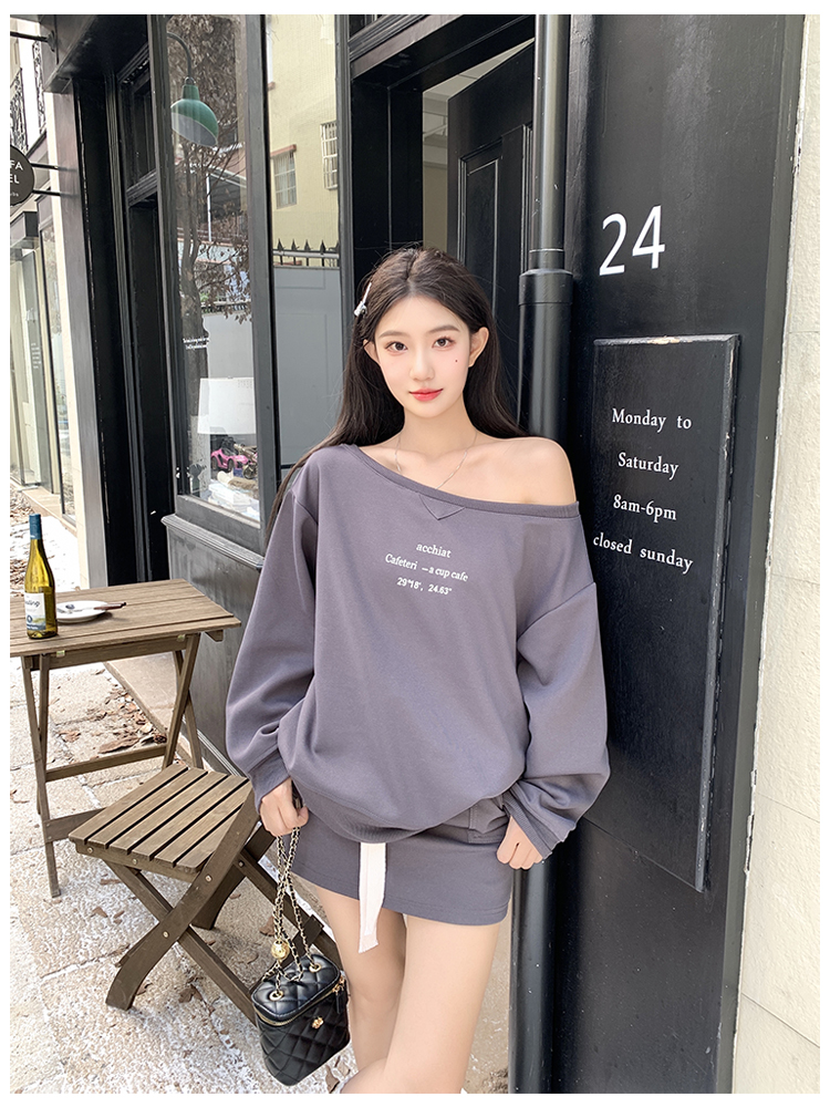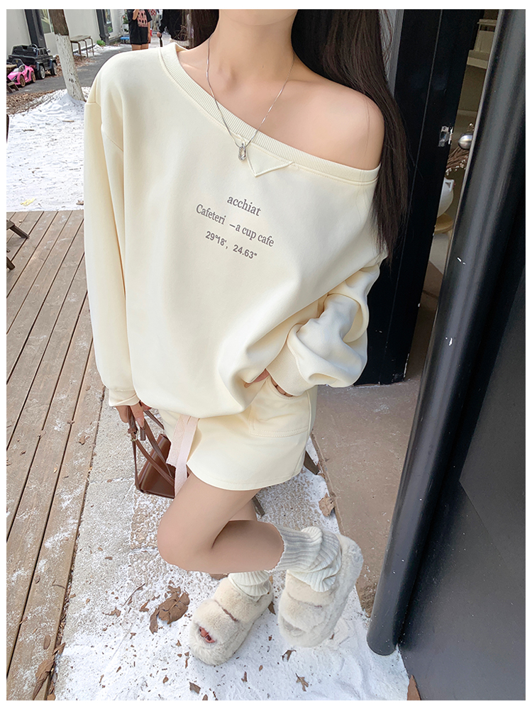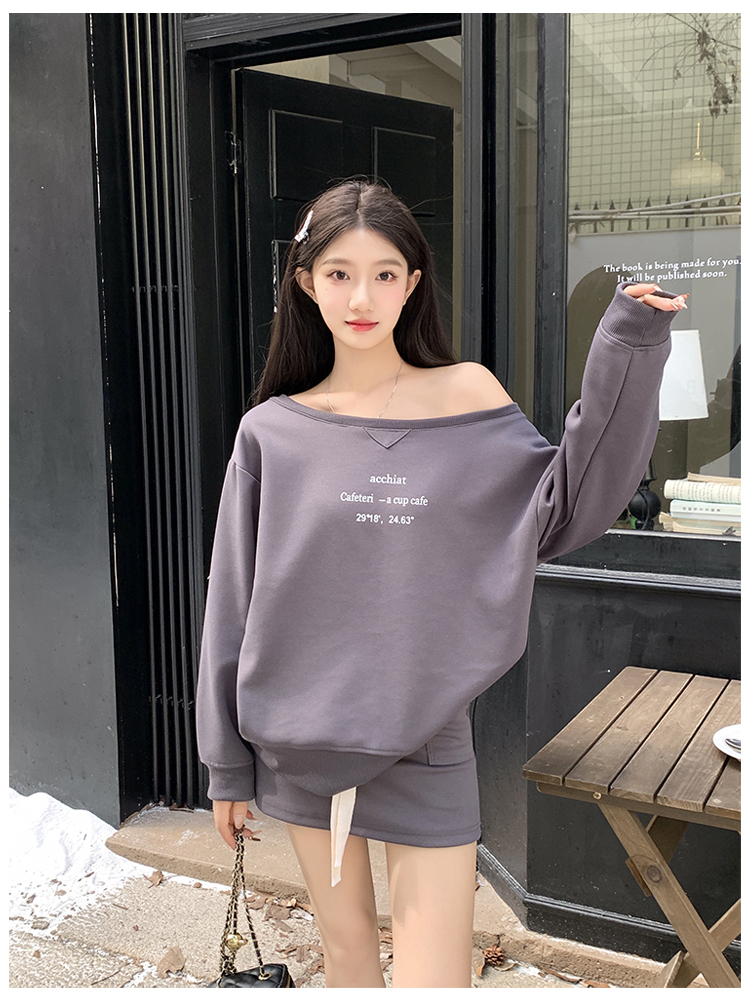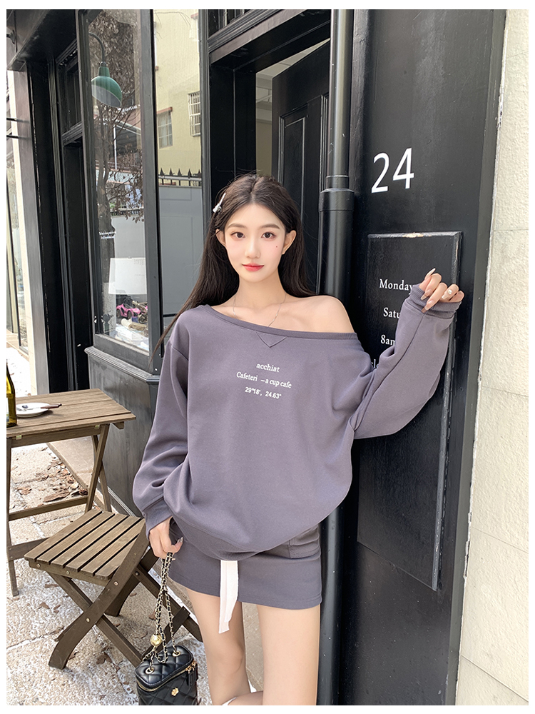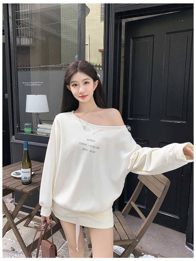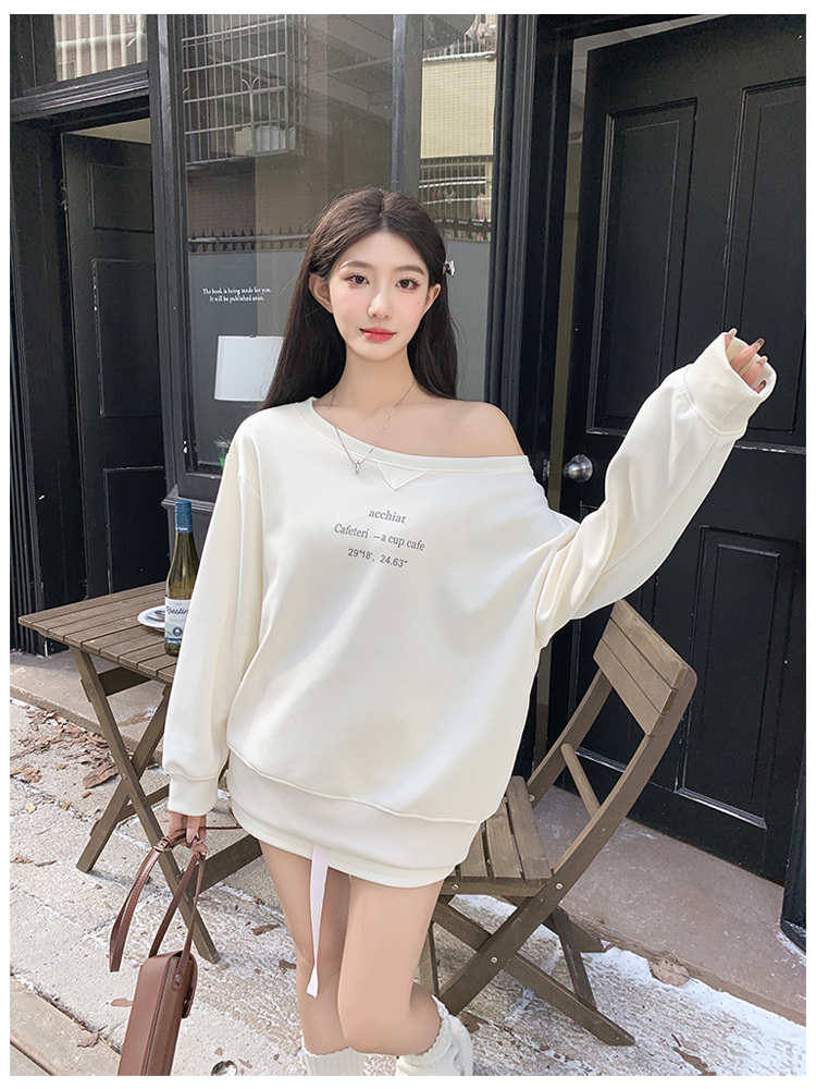 MY14091# 休闲运动两件套米白色一字肩长袖卫衣女装卫裙半身裙套装女裝貨源服裝批發
