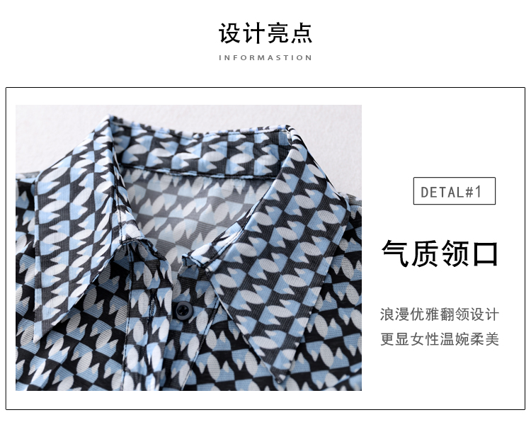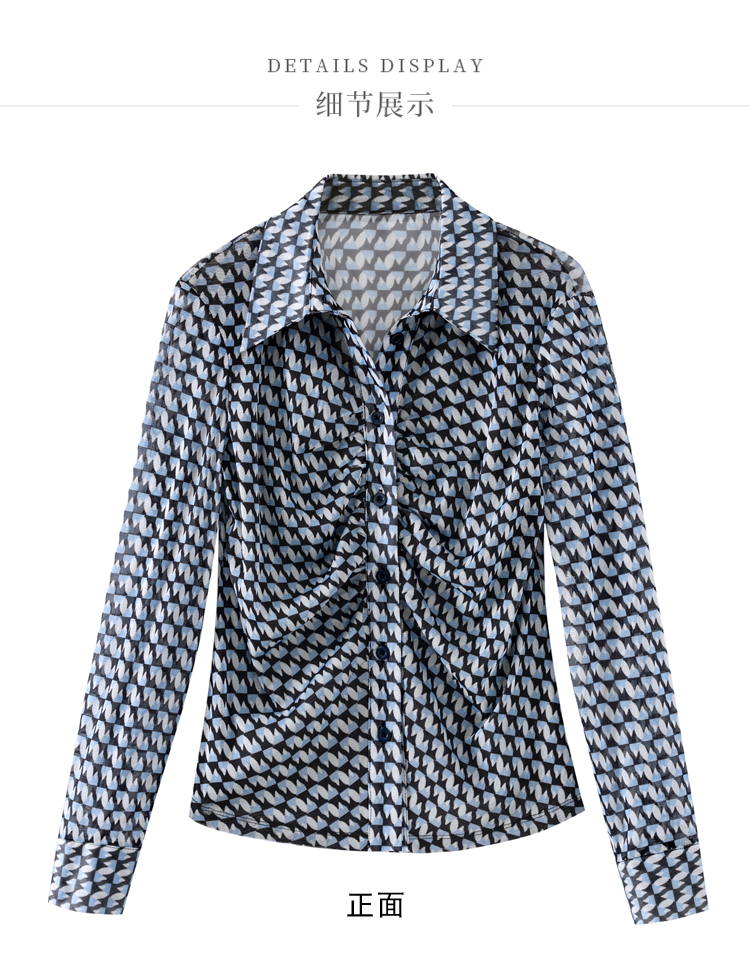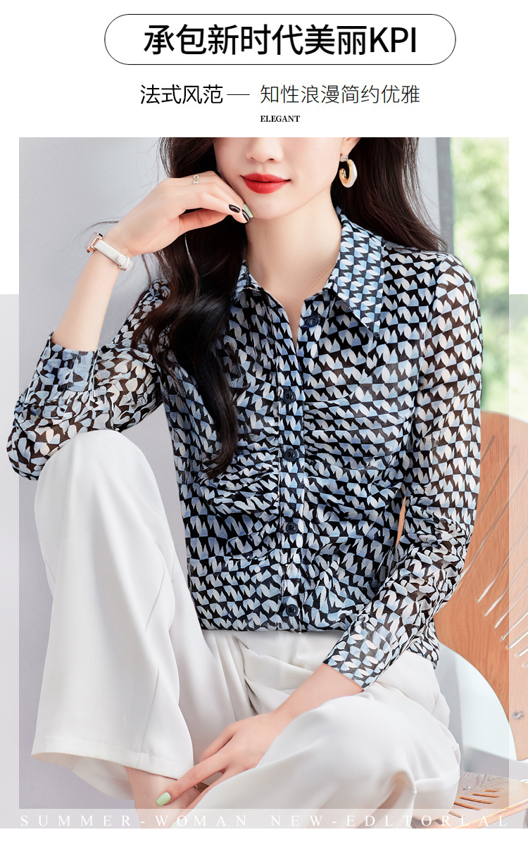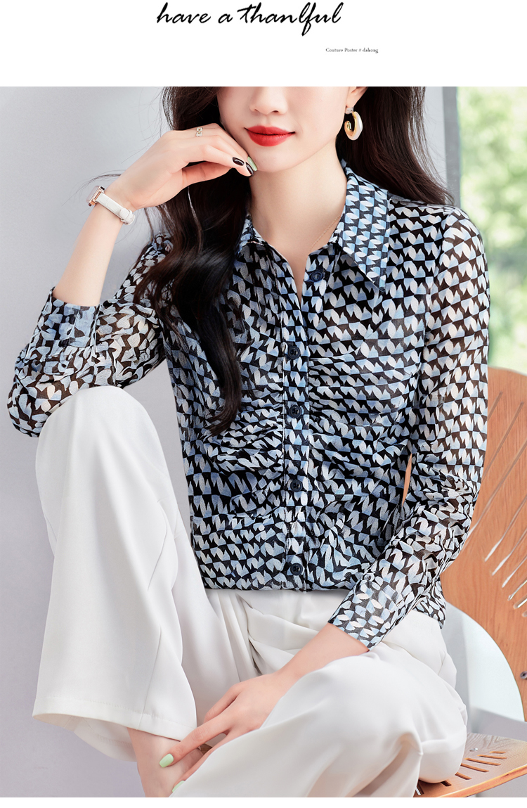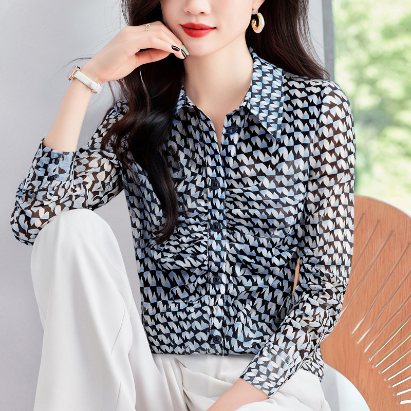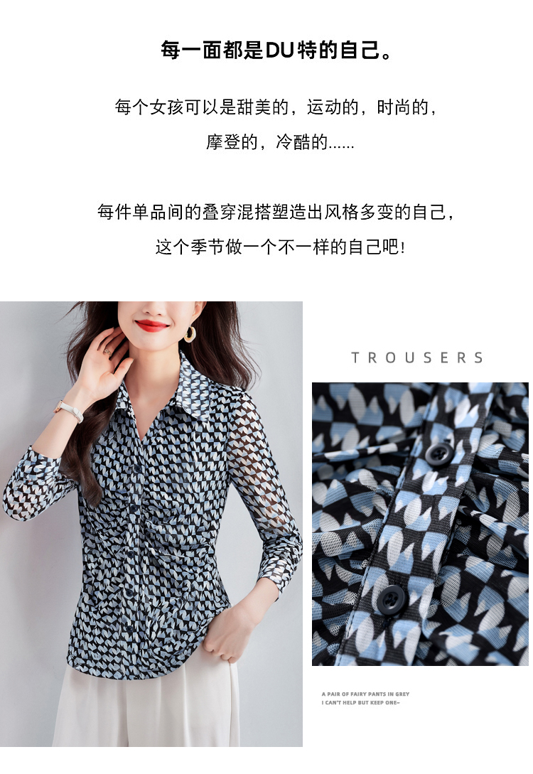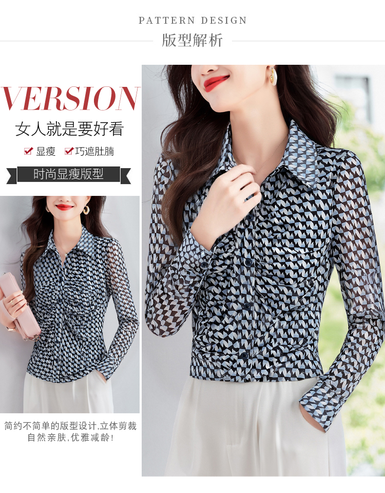 MY14124# 新款交叉翻V领长袖高弹印花百搭衬衫上衣女裝貨源服裝批發