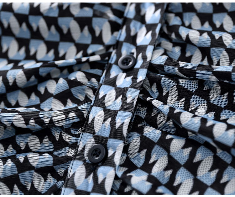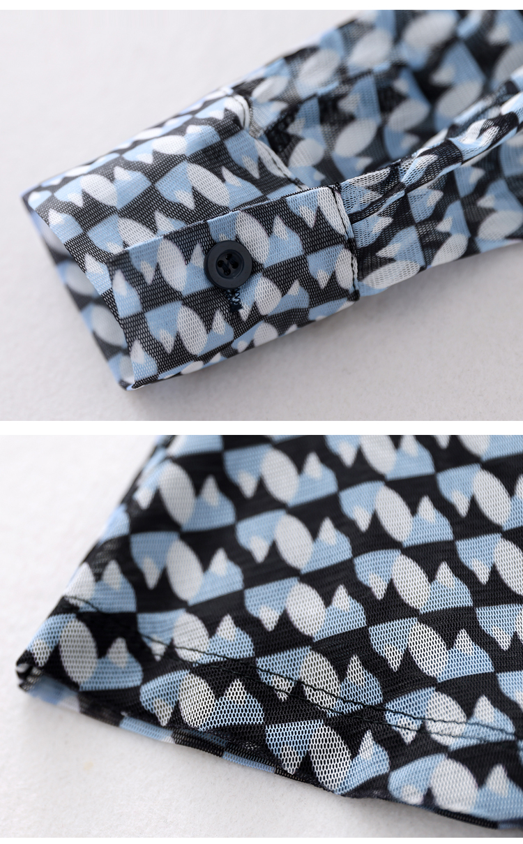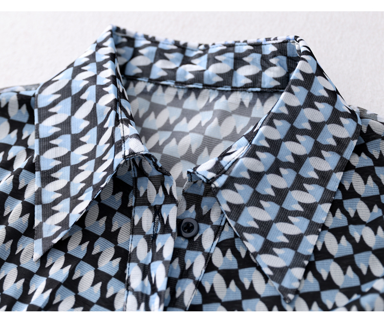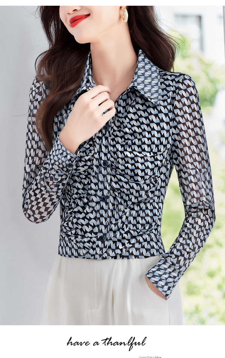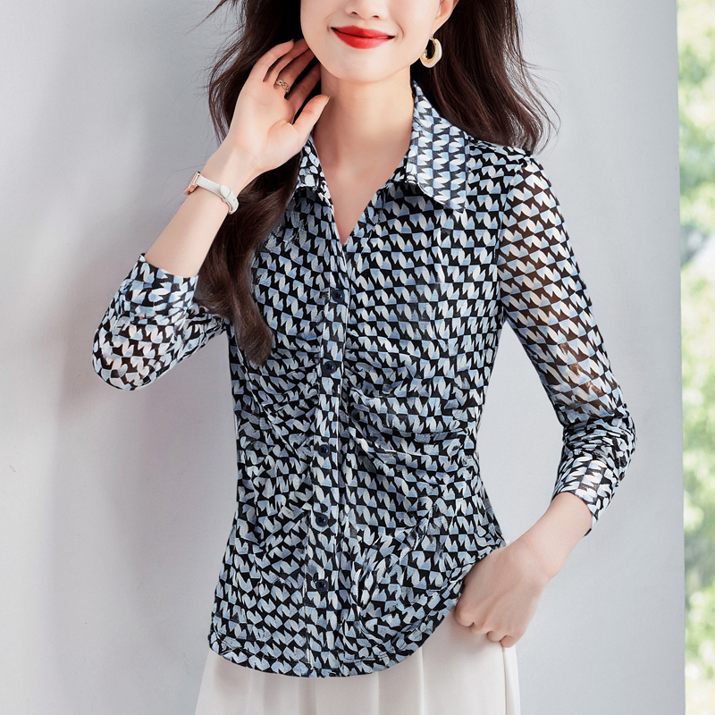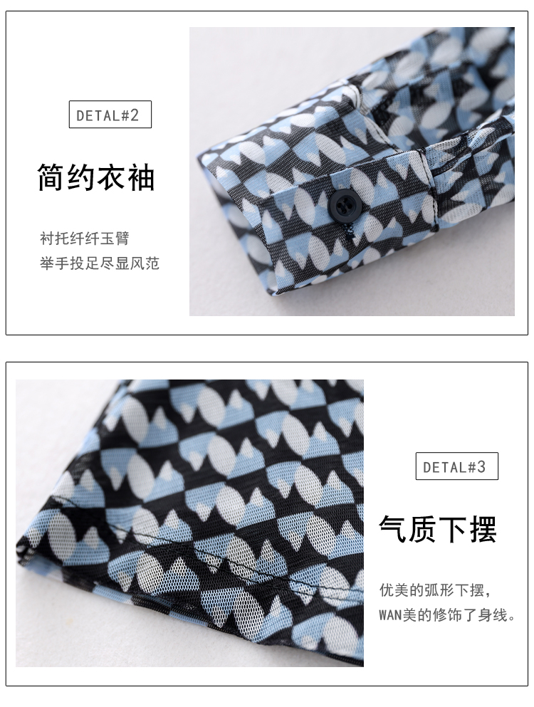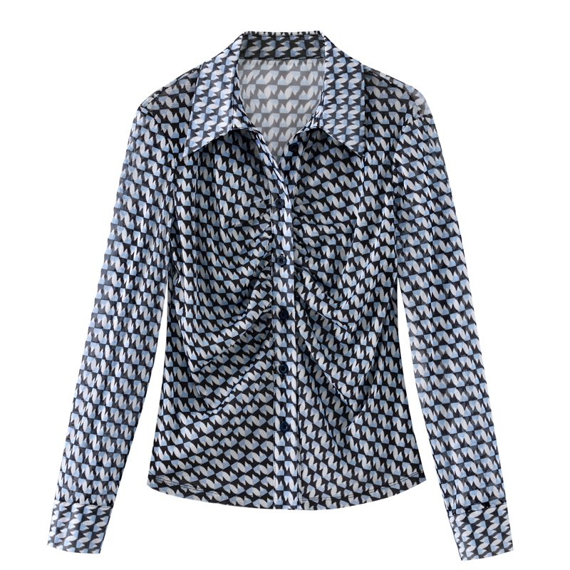 MY14124# 新款交叉翻V领长袖高弹印花百搭衬衫上衣女裝貨源服裝批發
