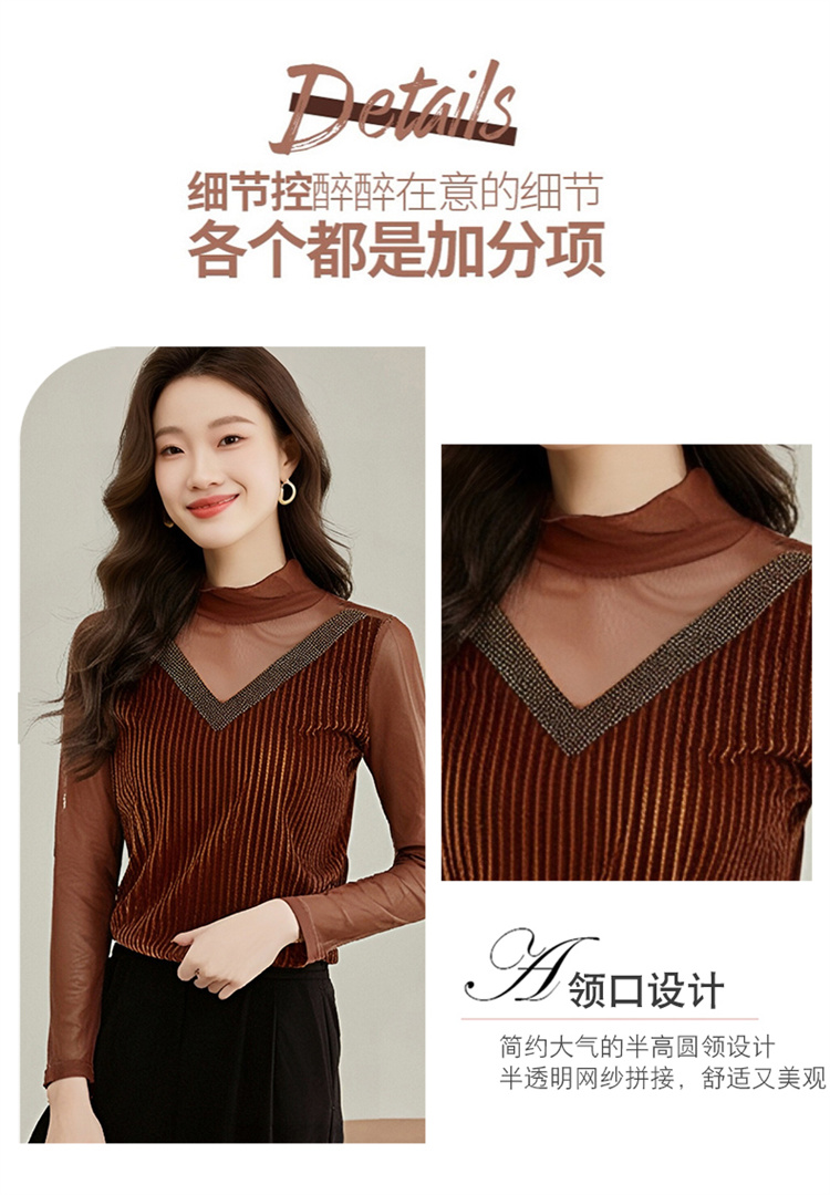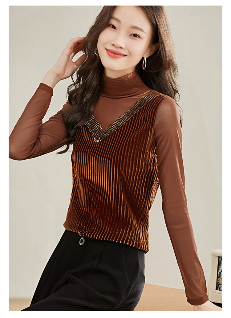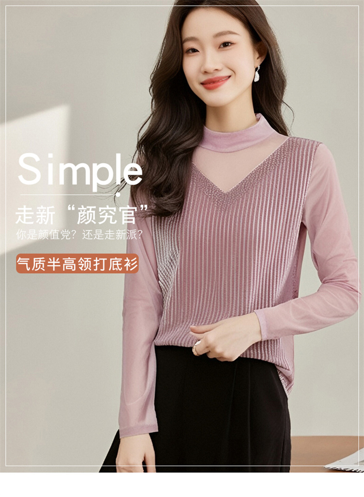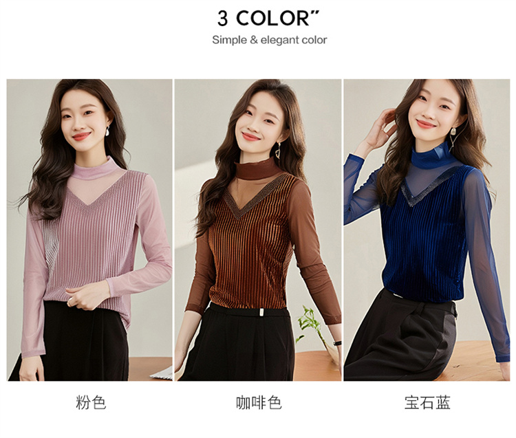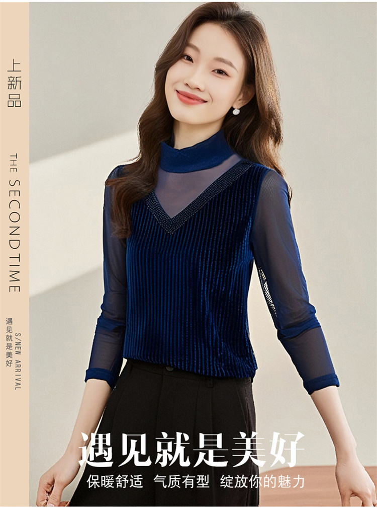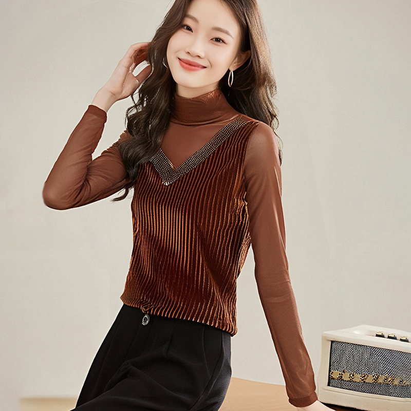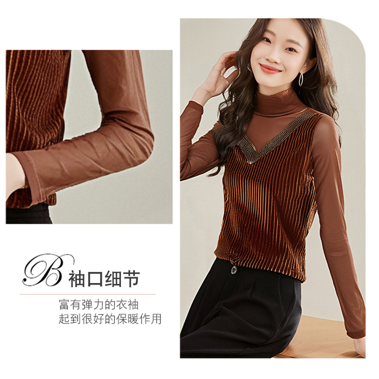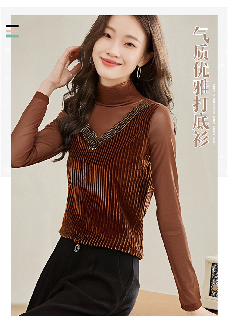 MY14126# 新款金丝绒竖条设计感洋气内搭T恤高领烫钻打底小衫女裝貨源服裝批發