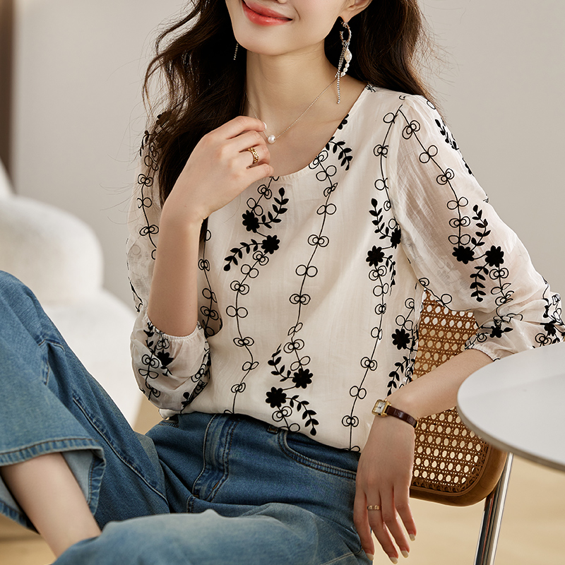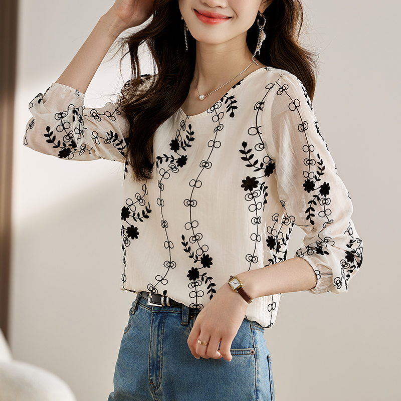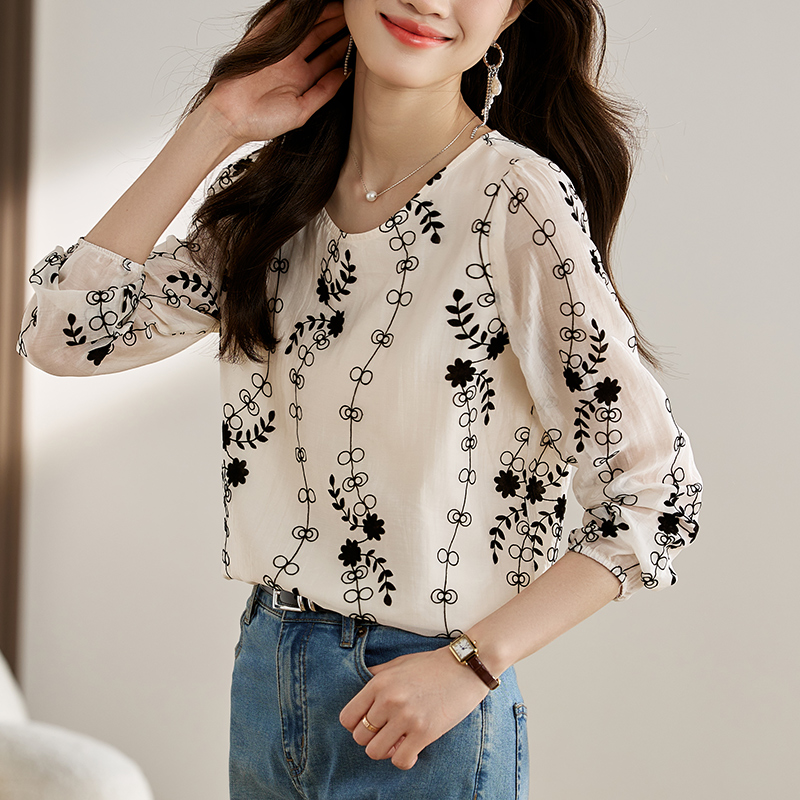 MY14132# 新款气质植绒花朵宽松百搭休闲圆领套头韩版上衣女裝貨源服裝批發