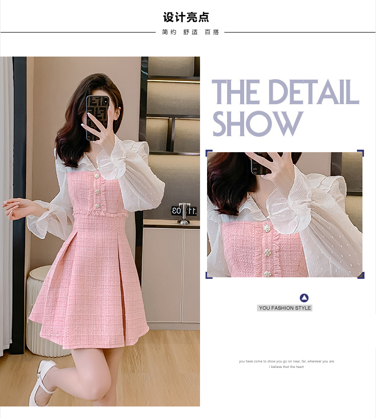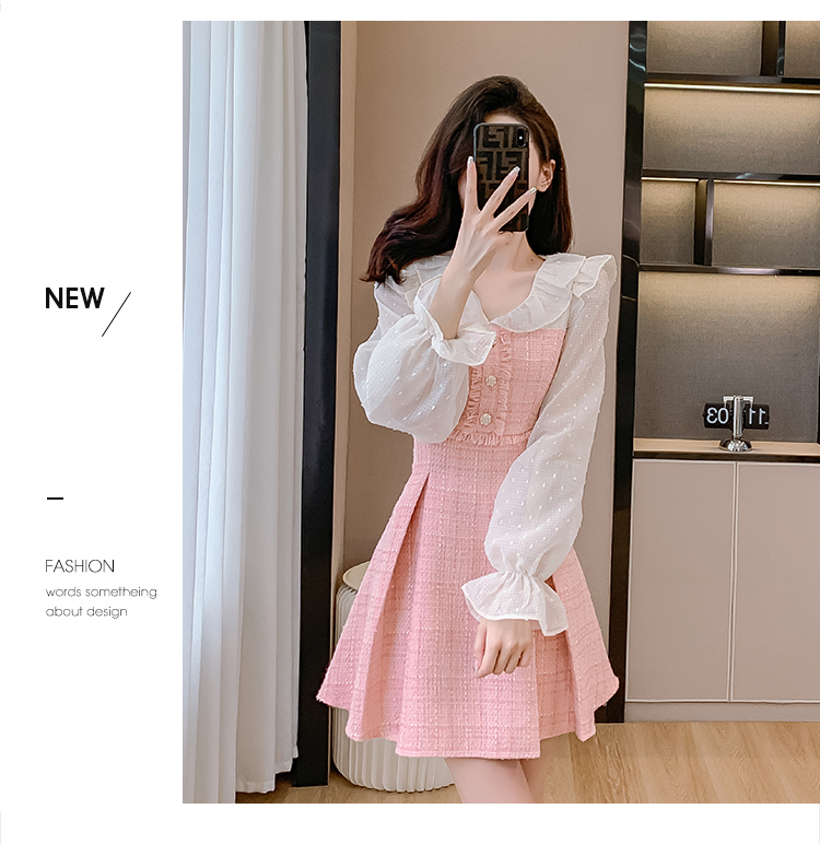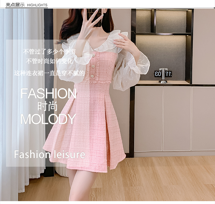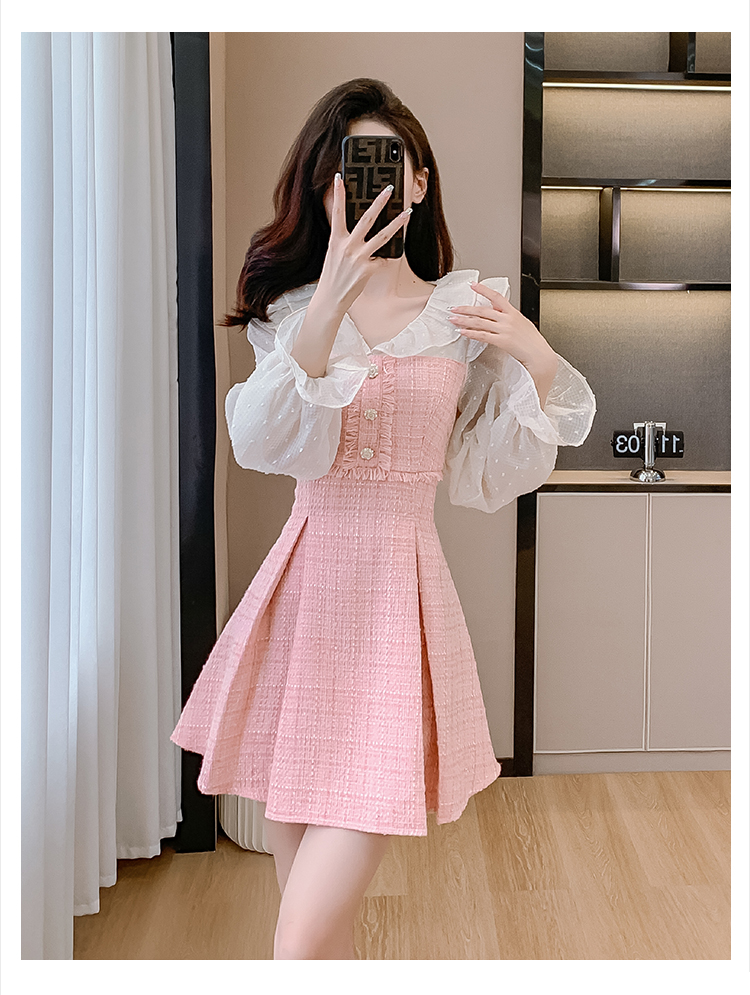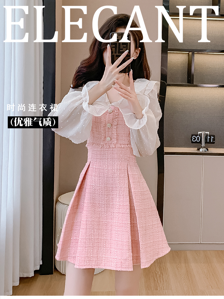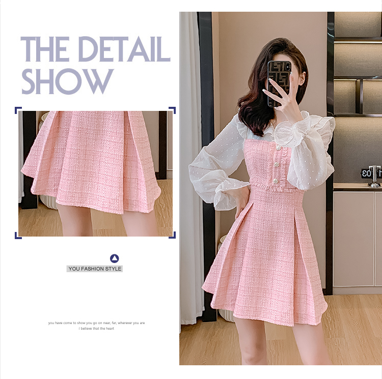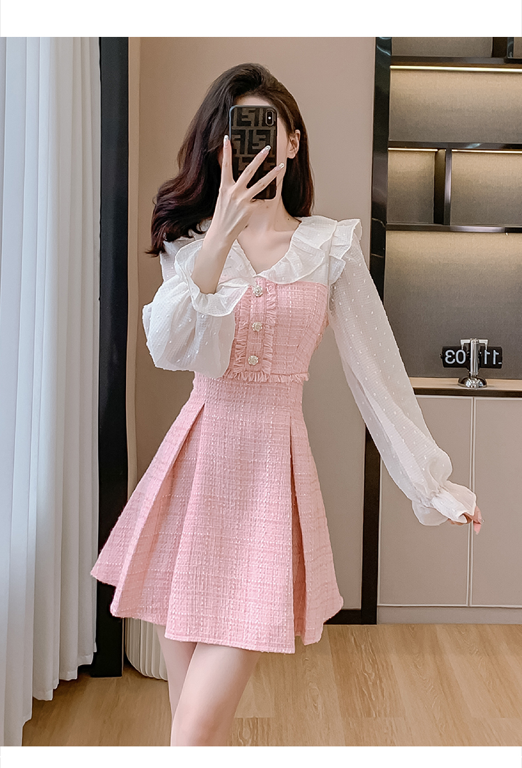 MY14143# 荷叶边法式粉色小香风V领连衣裙新款气质收腰减龄A字裙女裝貨源服裝批發