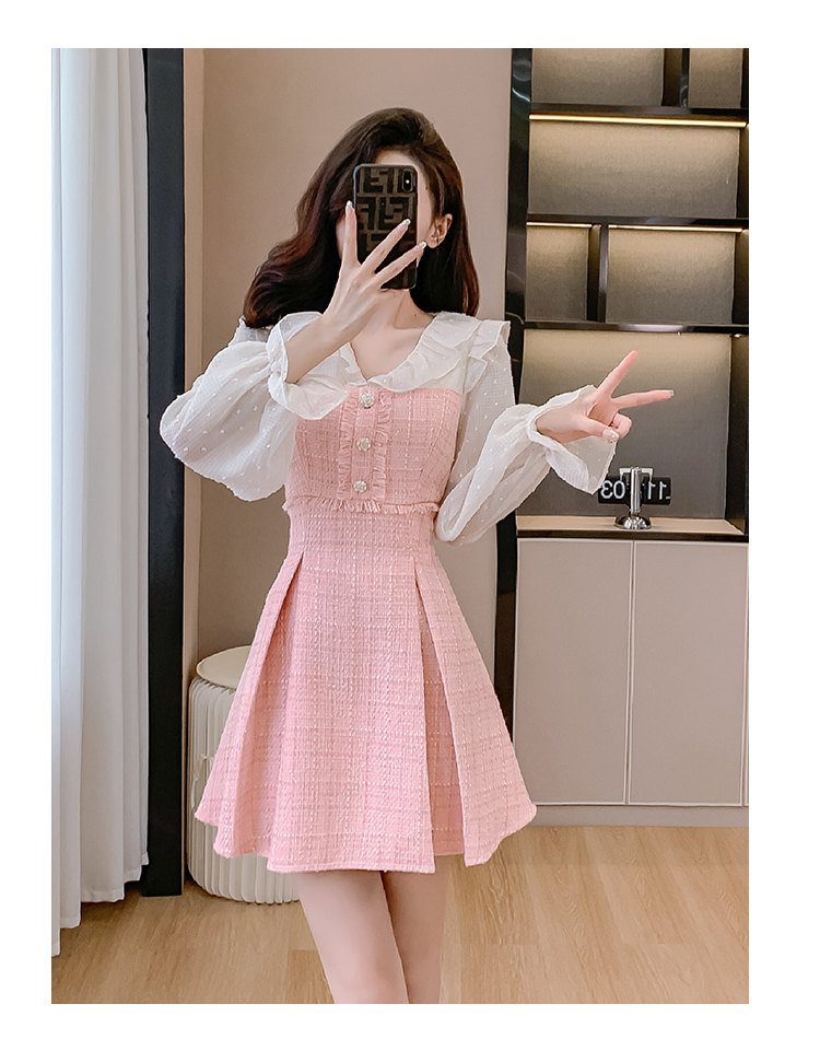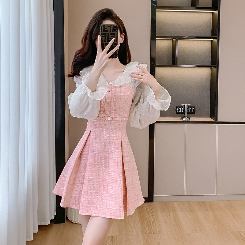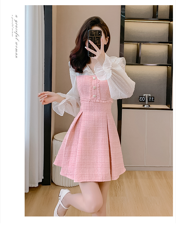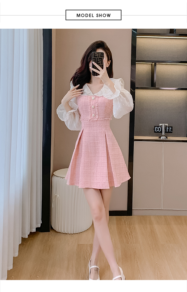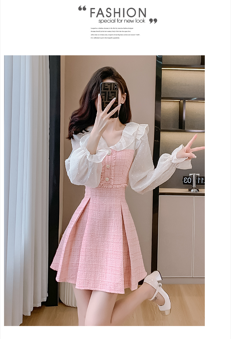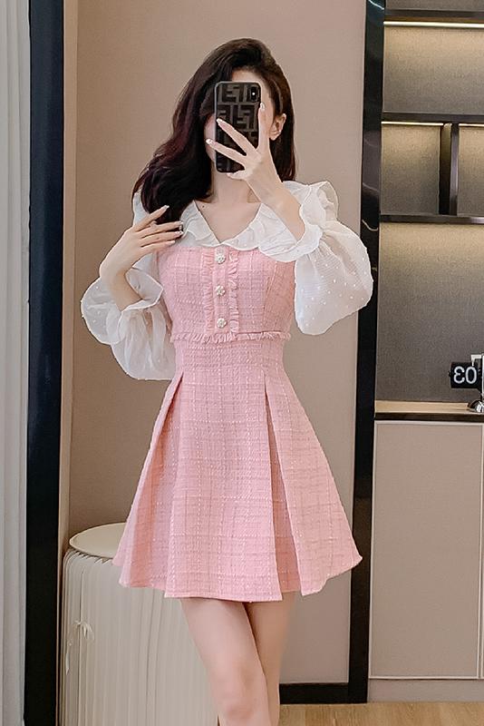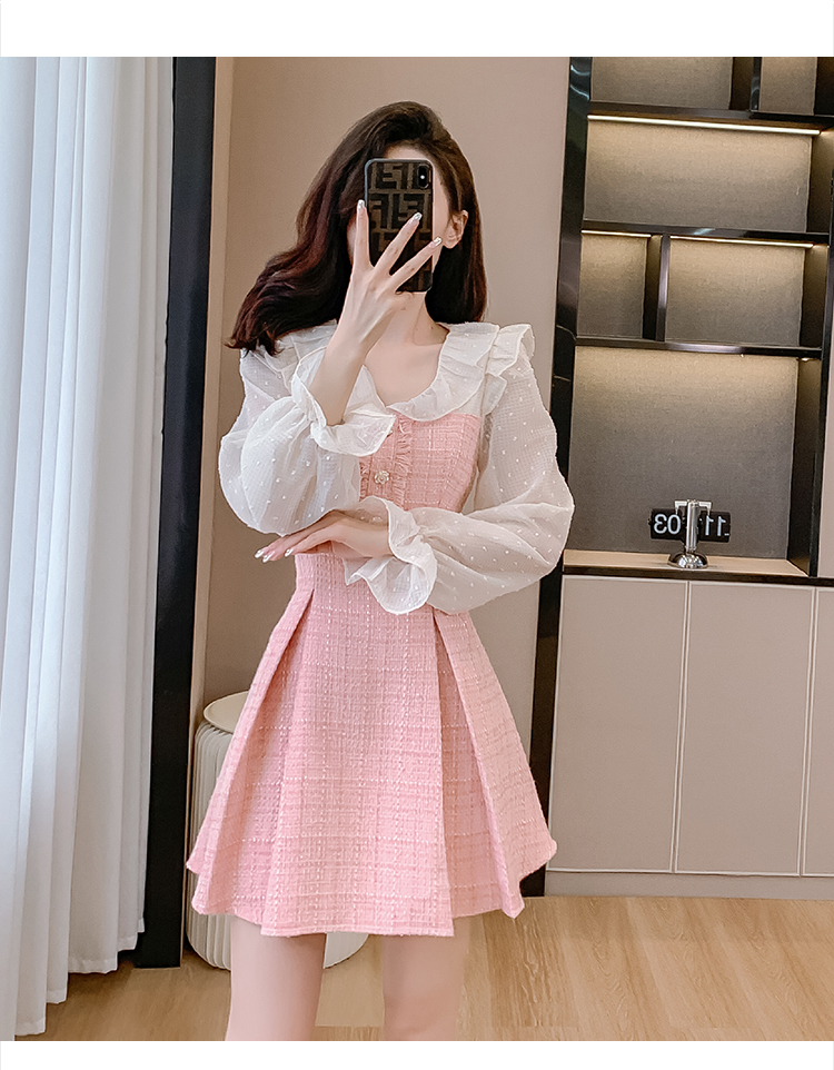 MY14143# 荷叶边法式粉色小香风V领连衣裙新款气质收腰减龄A字裙女裝貨源服裝批發