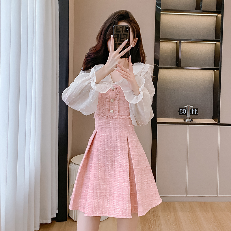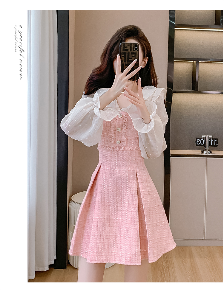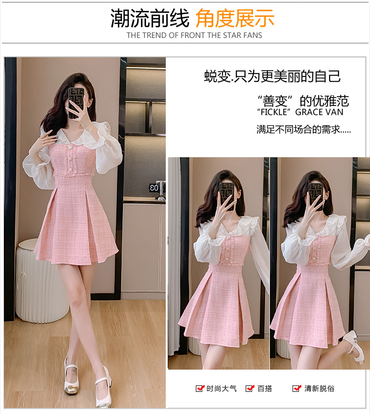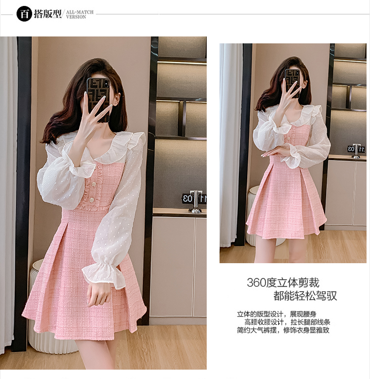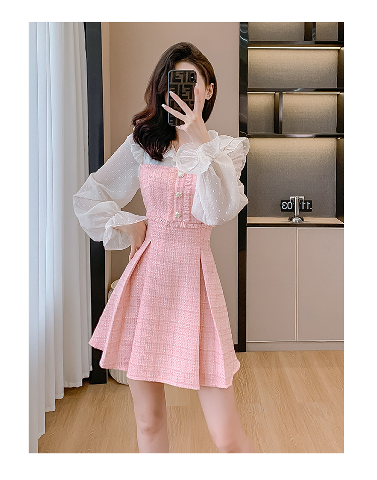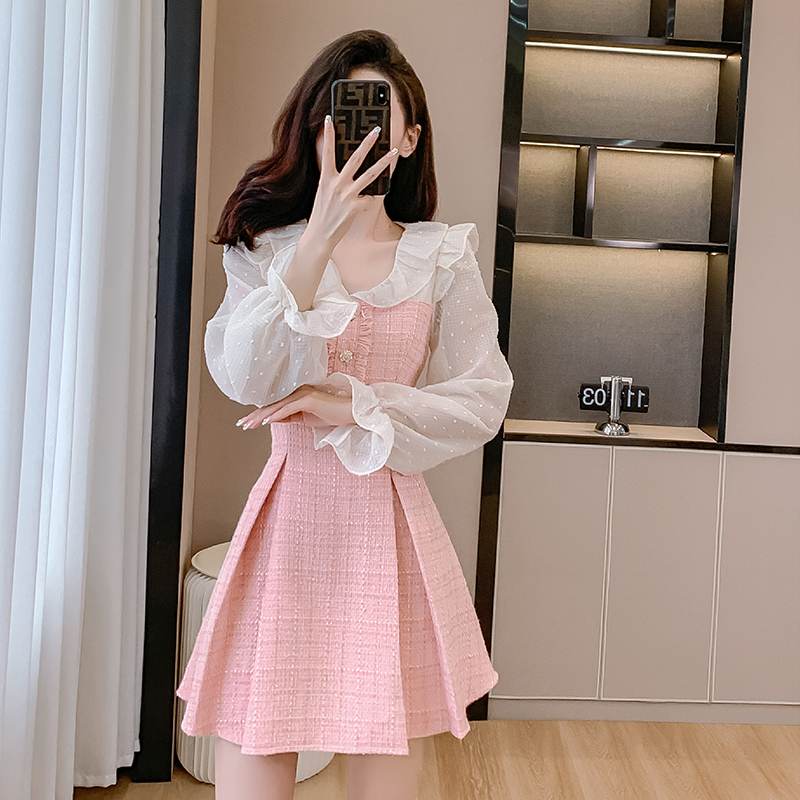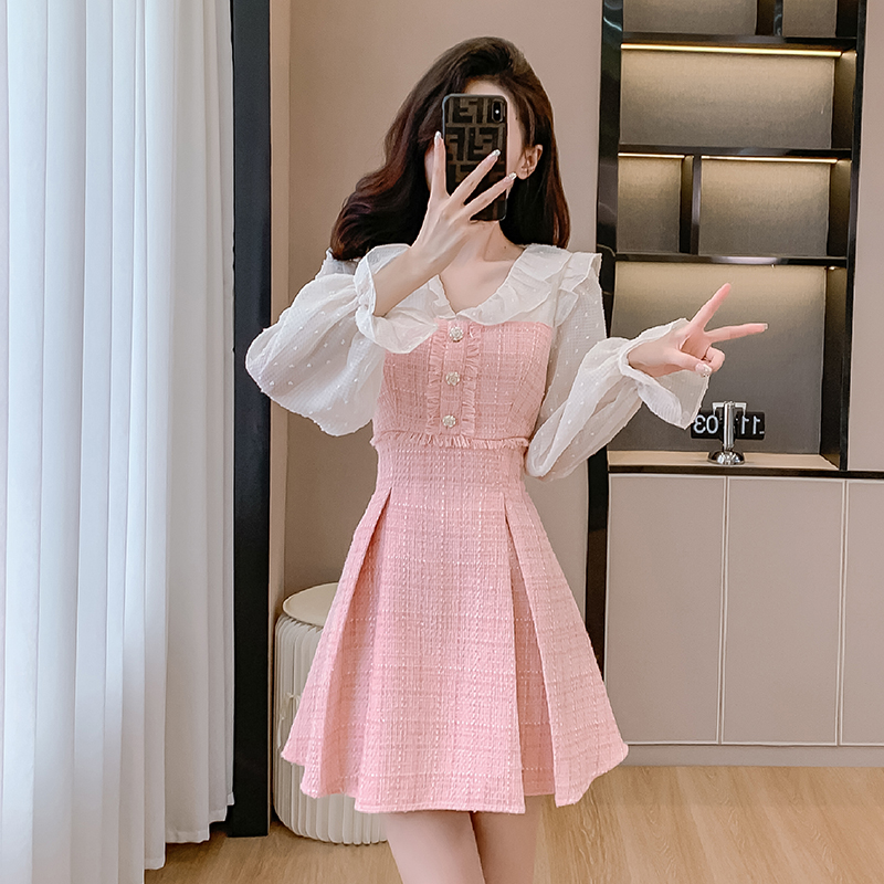 MY14143# 荷叶边法式粉色小香风V领连衣裙新款气质收腰减龄A字裙女裝貨源服裝批發