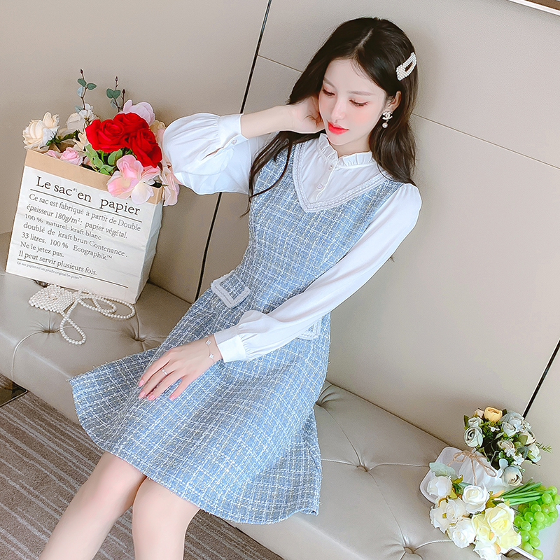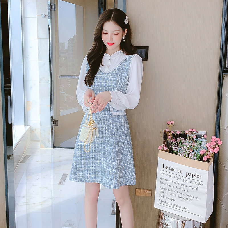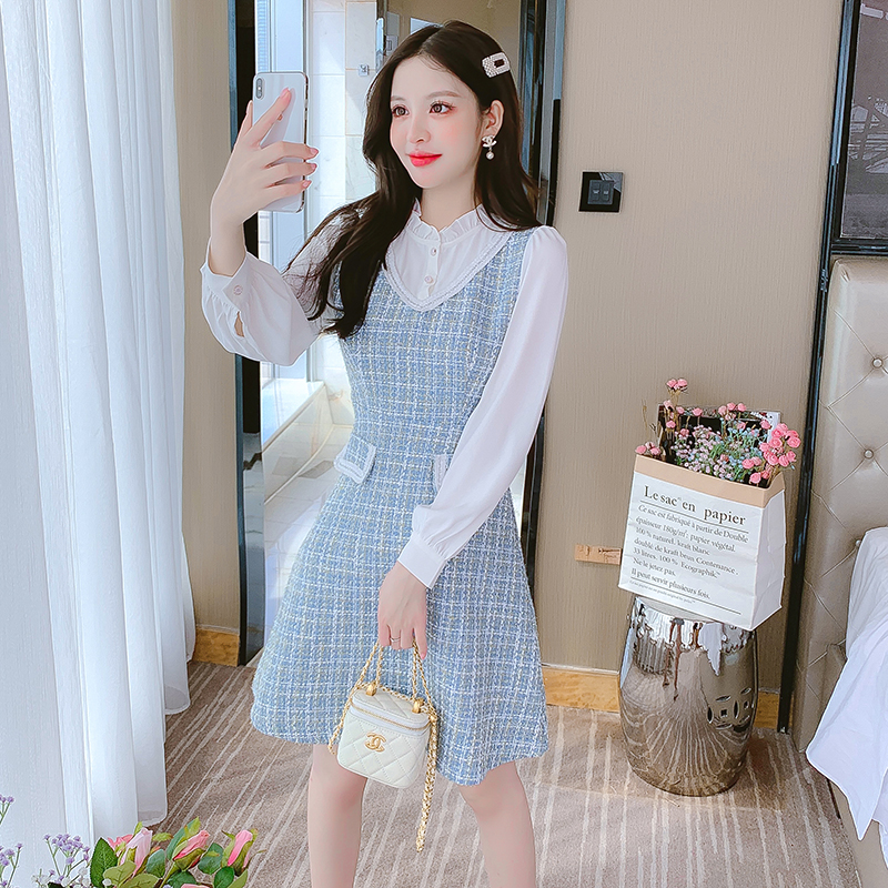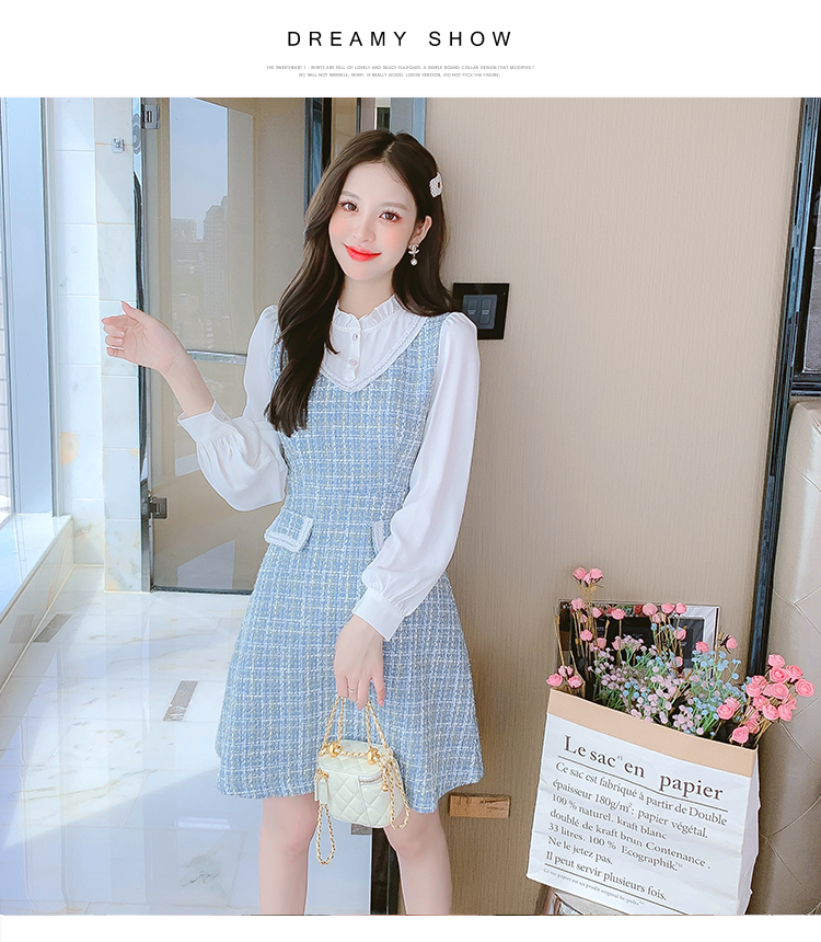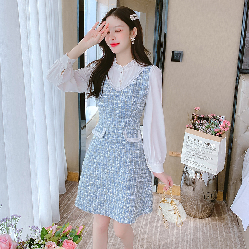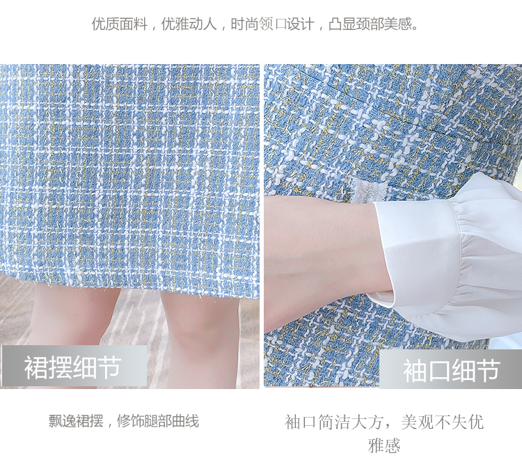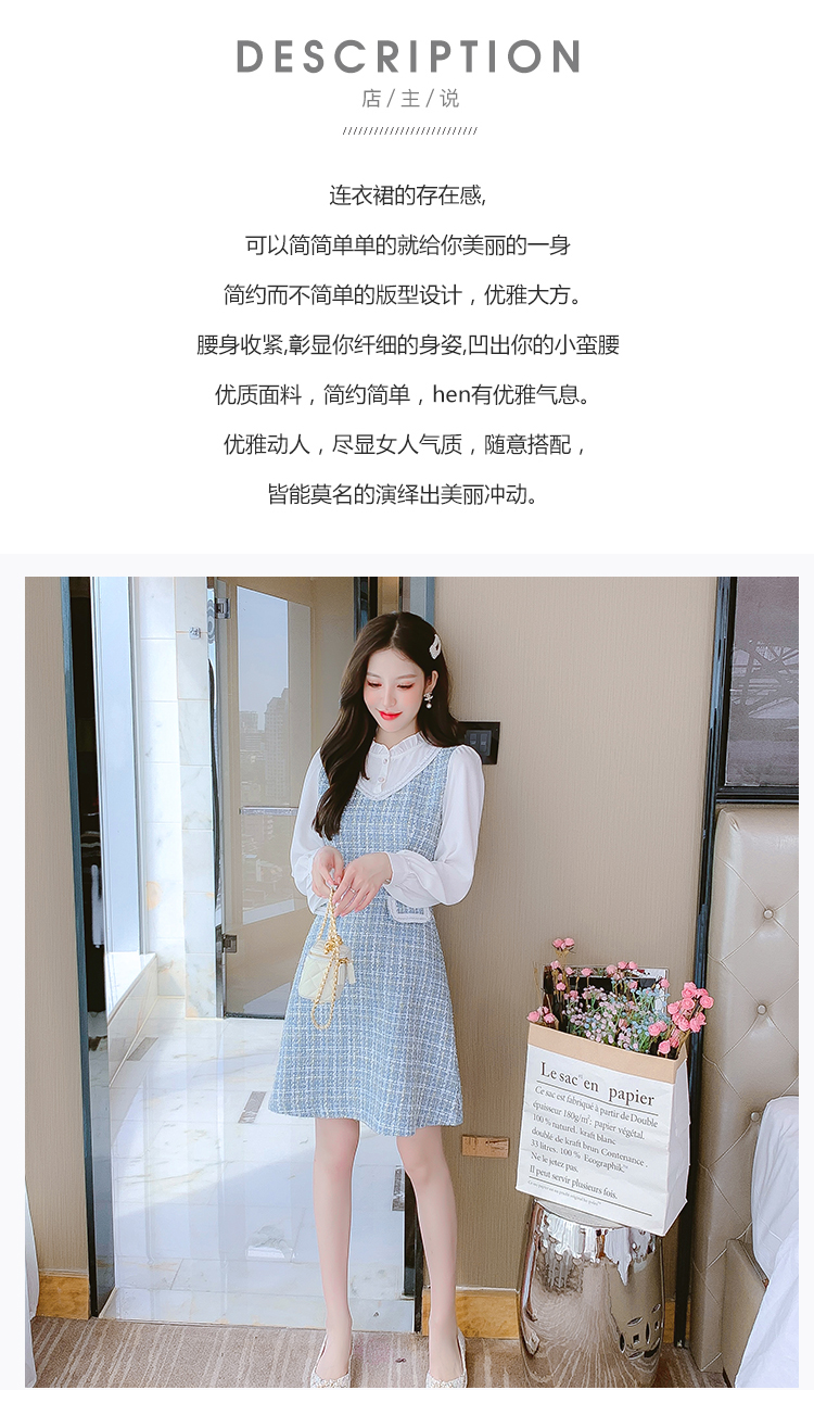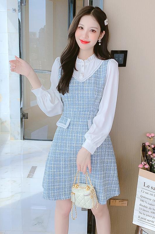 MY14144# 法式时尚气质小个子收腰显瘦小香风娃娃领复古连衣裙女裝貨源服裝批發