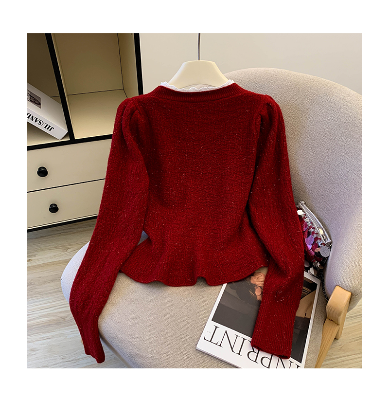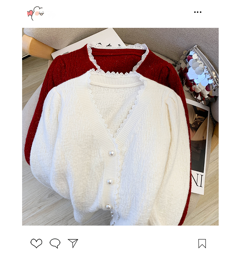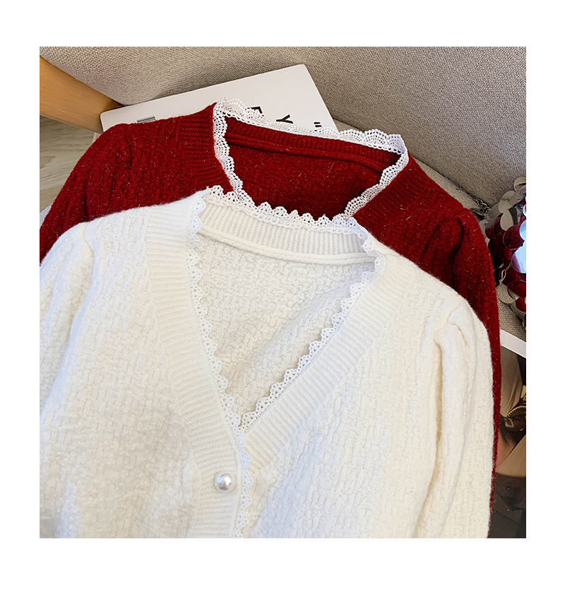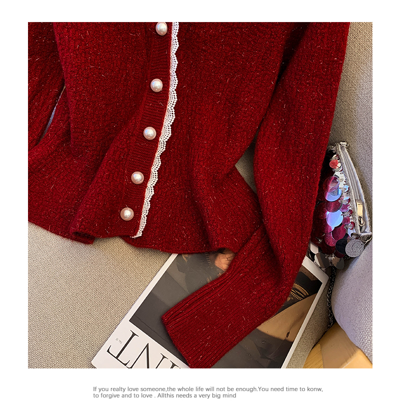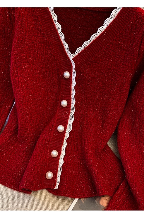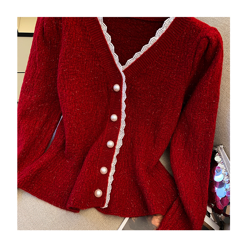 MY14178# 小香风花边V领内搭打底针织开衫鱼尾收腰短款红色毛衣女裝貨源服裝批發