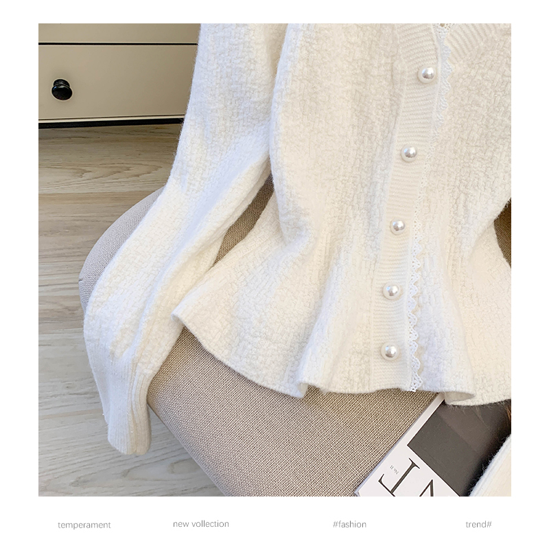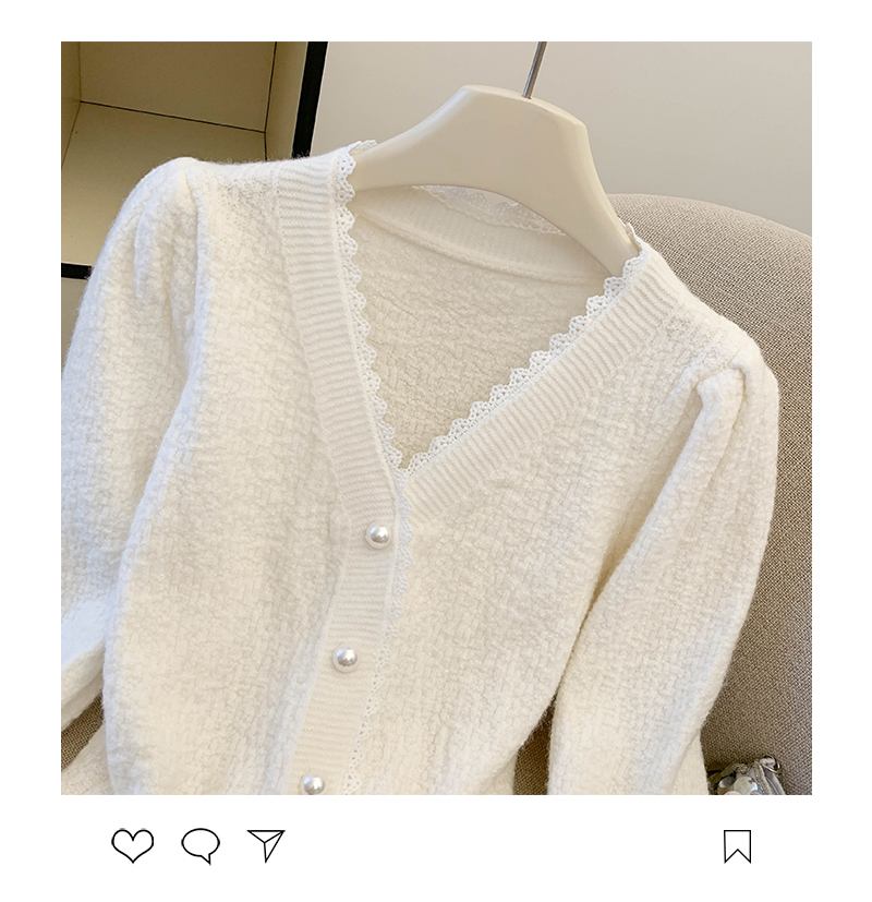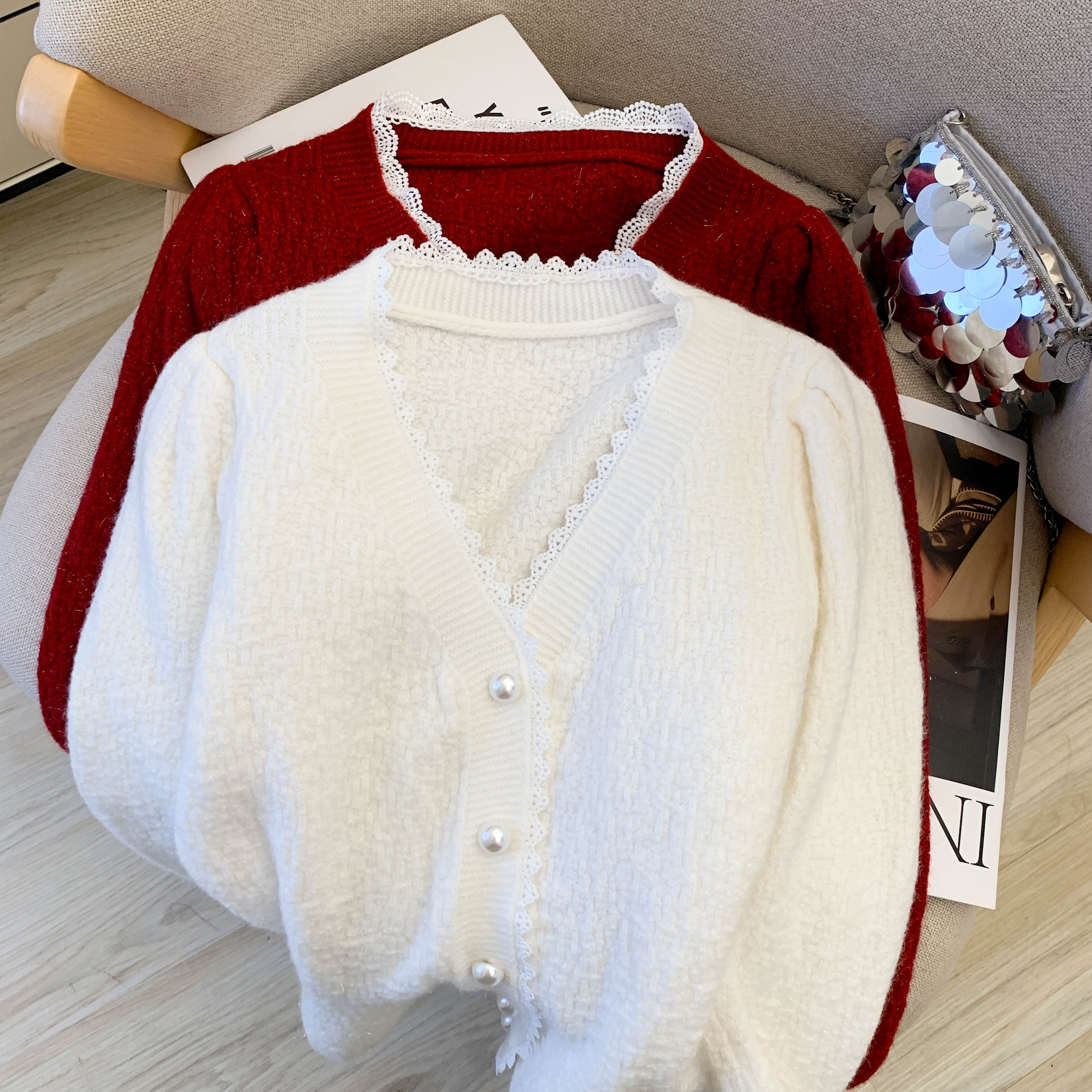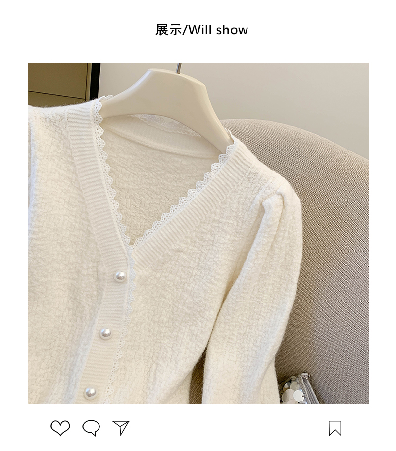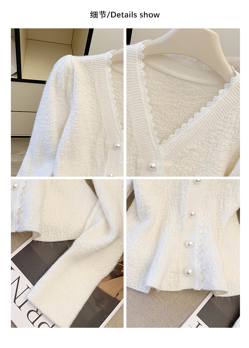 MY14178# 小香风花边V领内搭打底针织开衫鱼尾收腰短款红色毛衣女裝貨源服裝批發