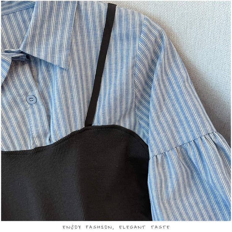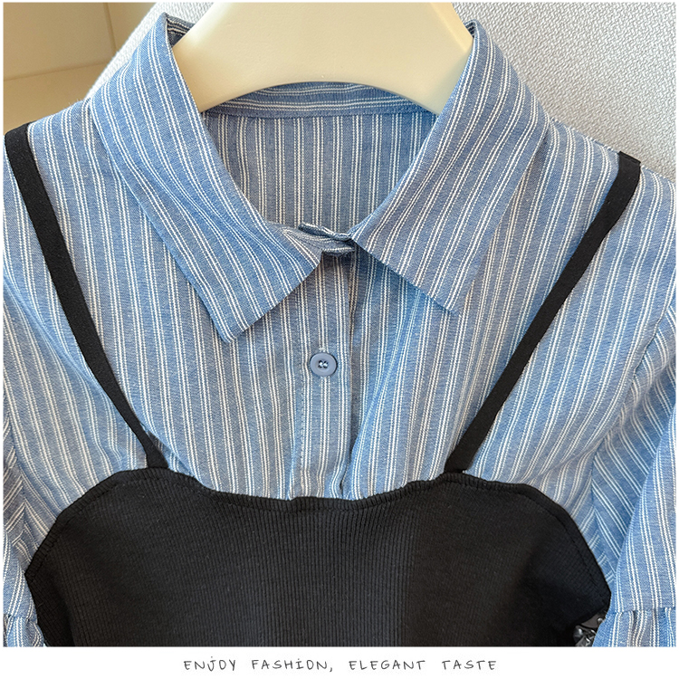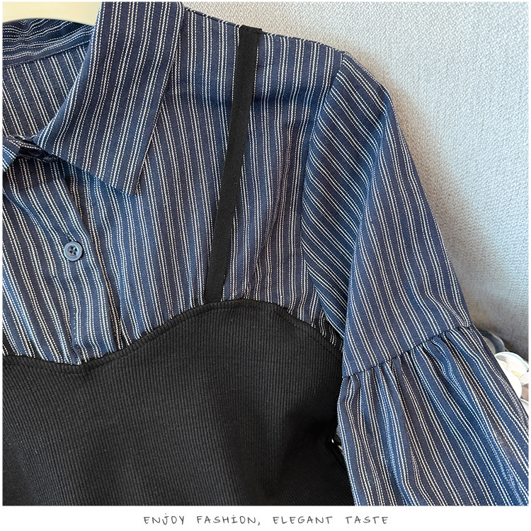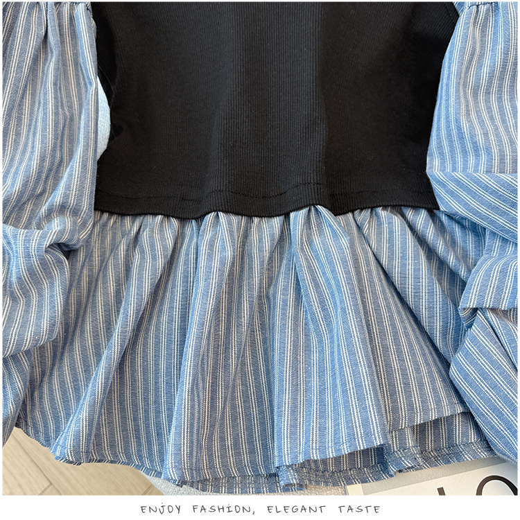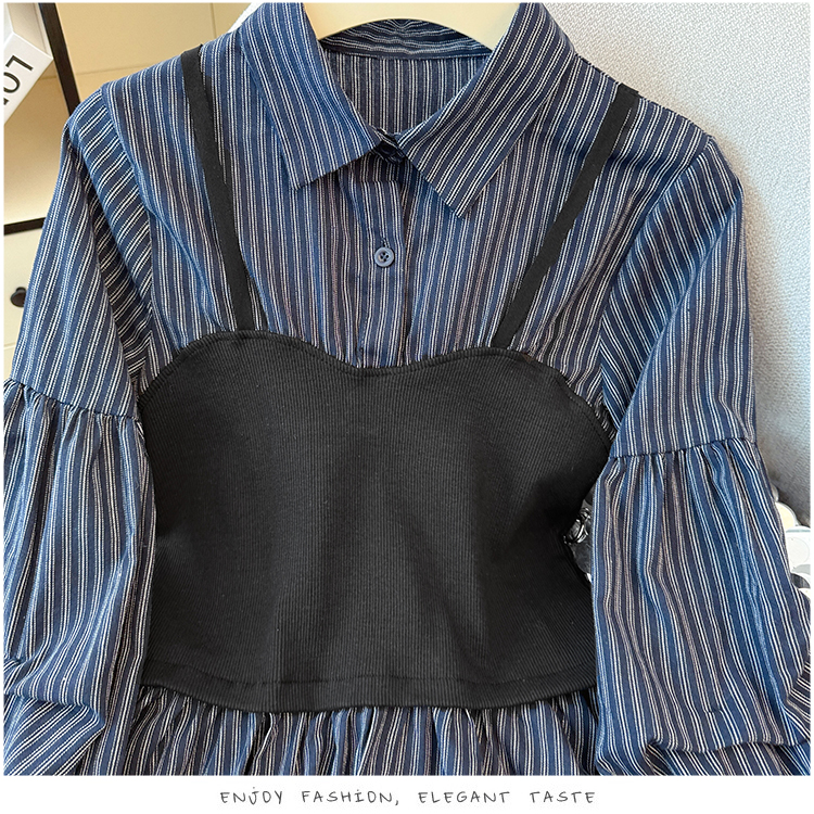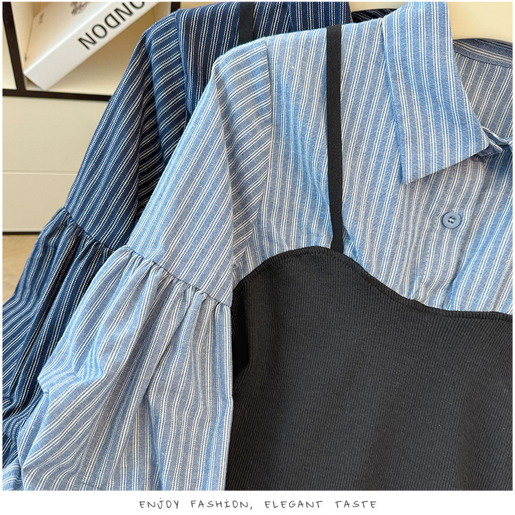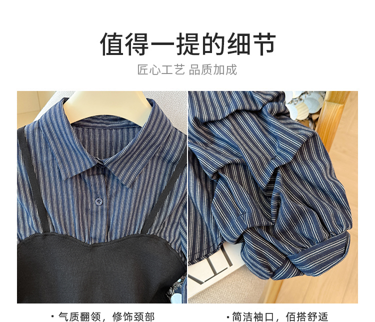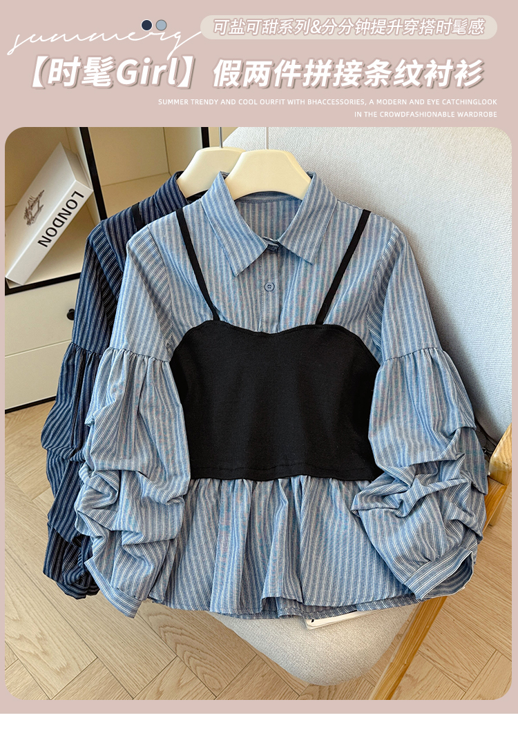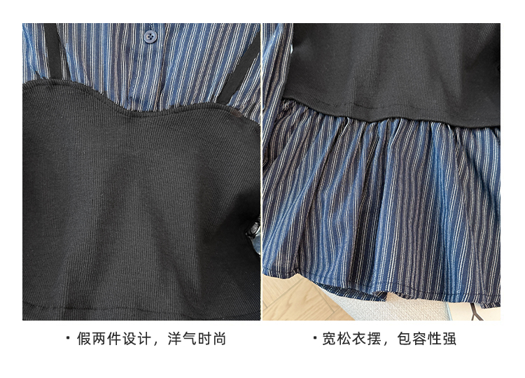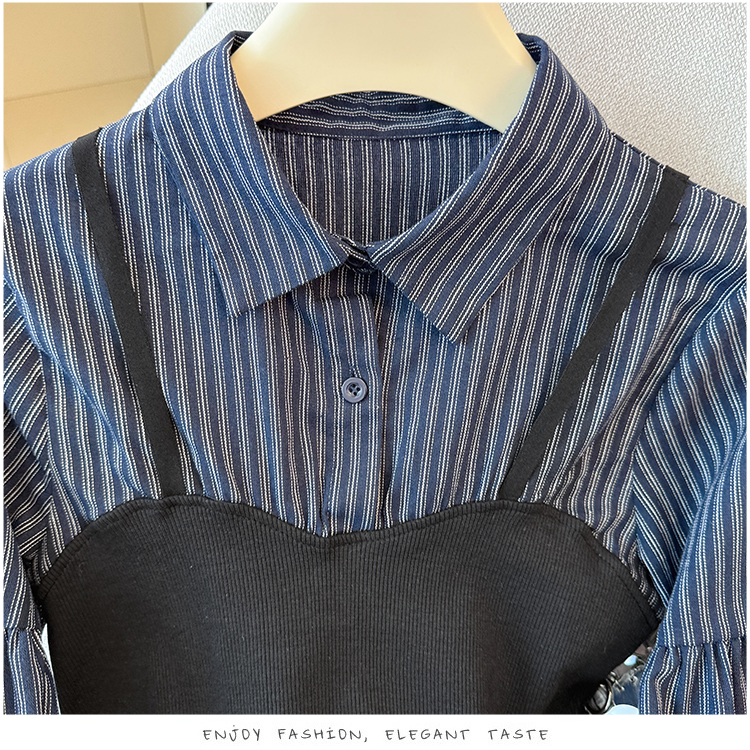 MY14179# 假两件拼接条纹长袖衬衫新款气质洋气显瘦上衣女裝貨源服裝批發