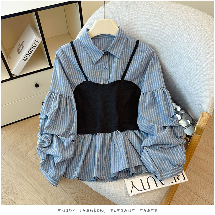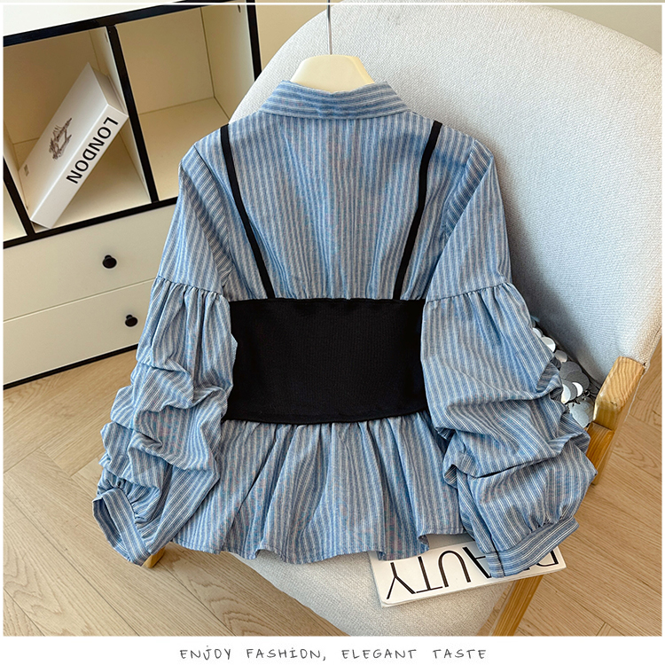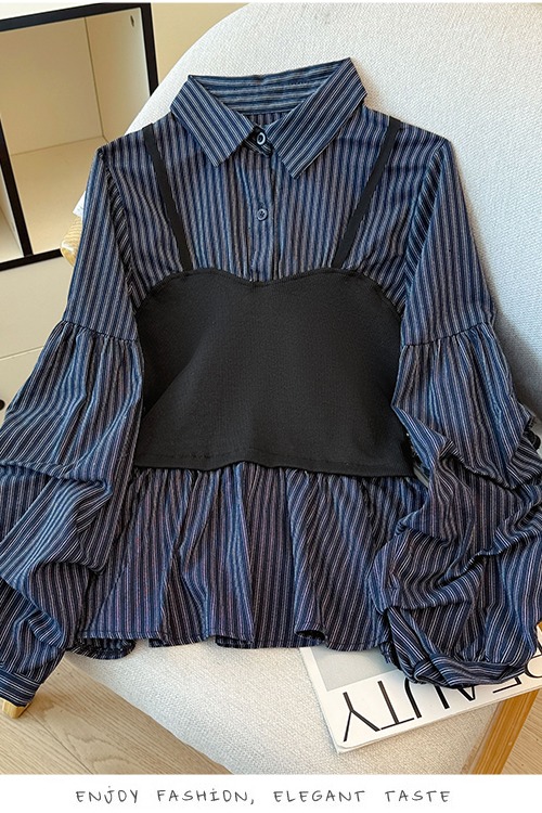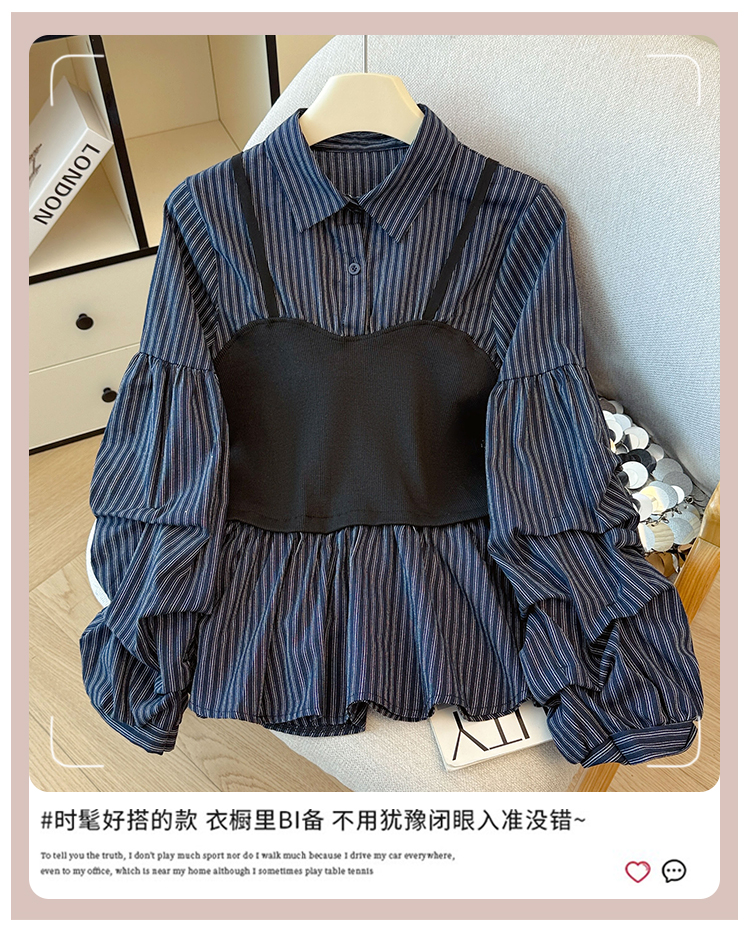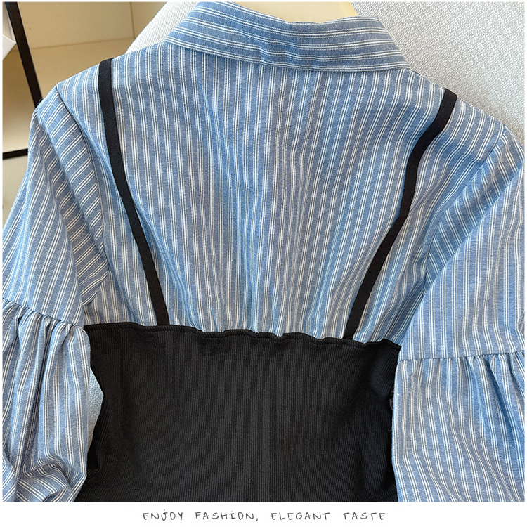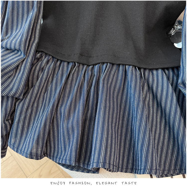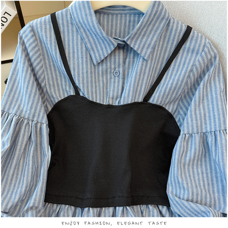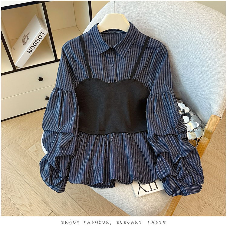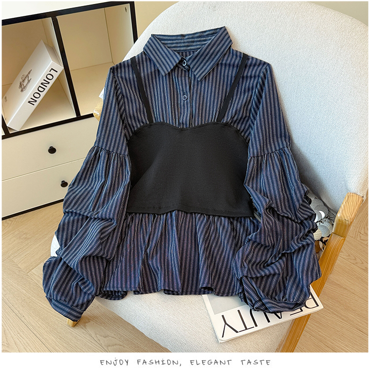 MY14179# 假两件拼接条纹长袖衬衫新款气质洋气显瘦上衣女裝貨源服裝批發