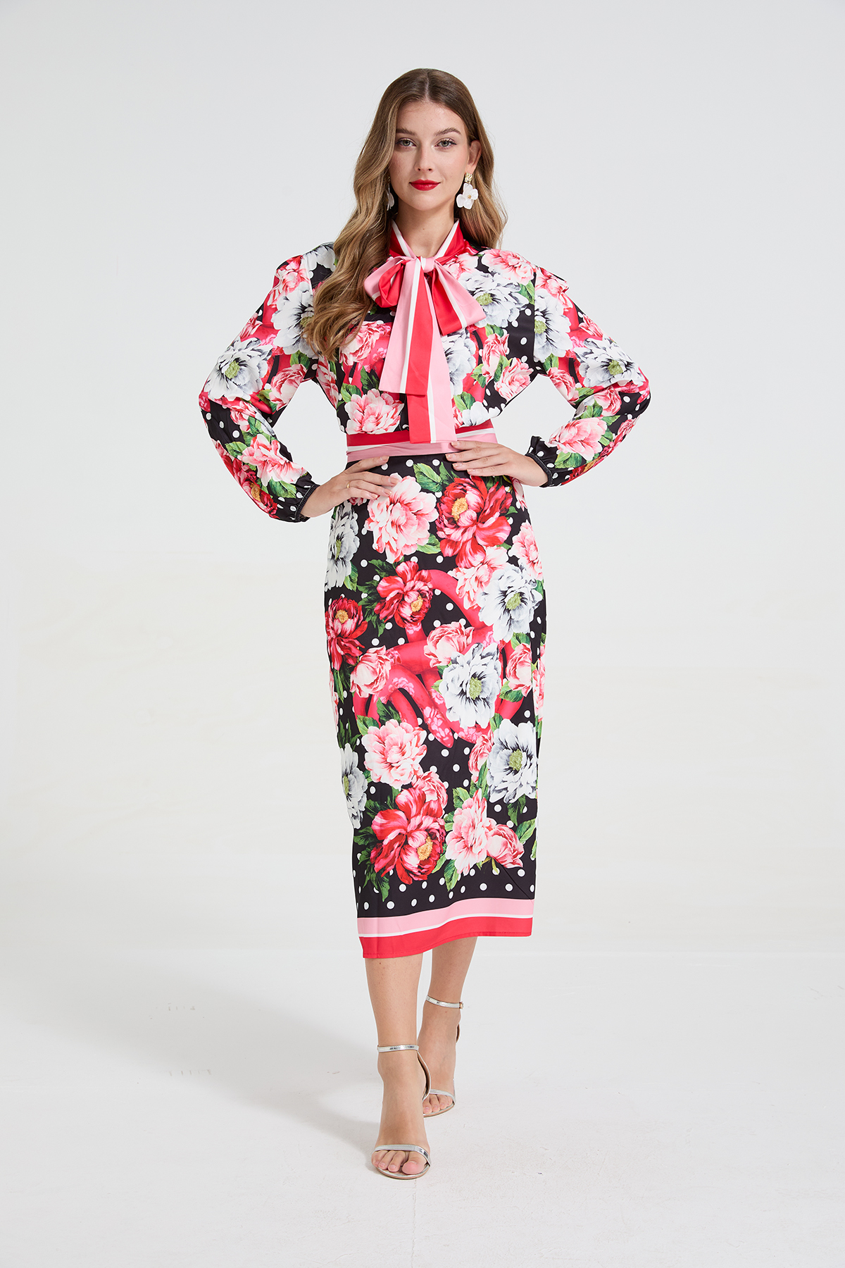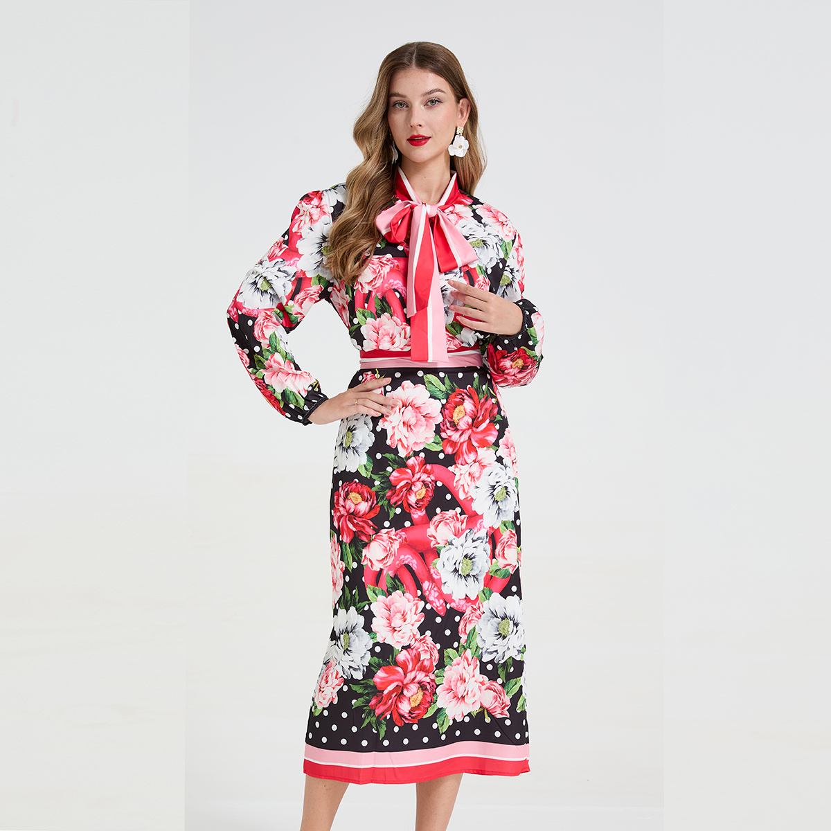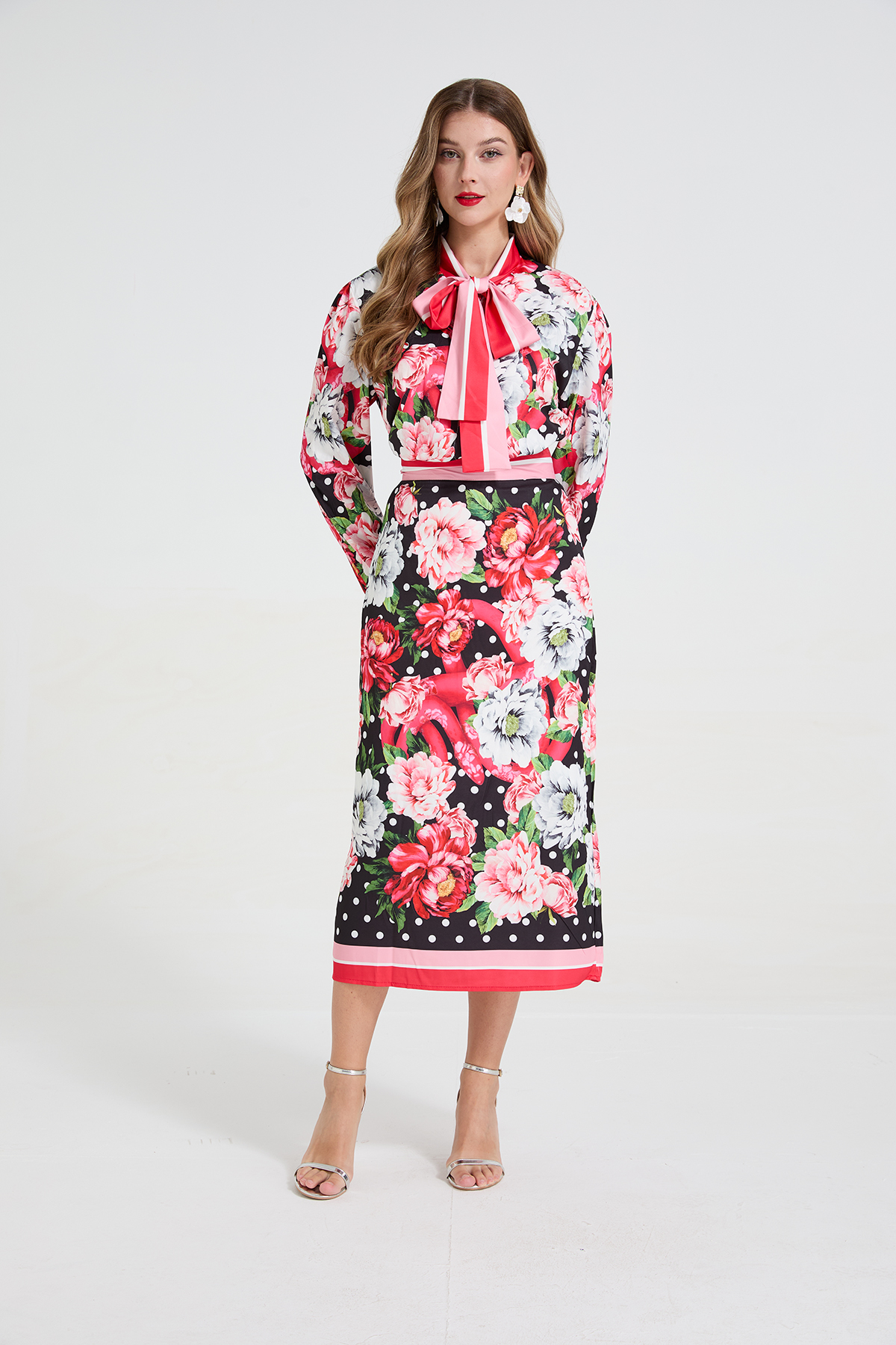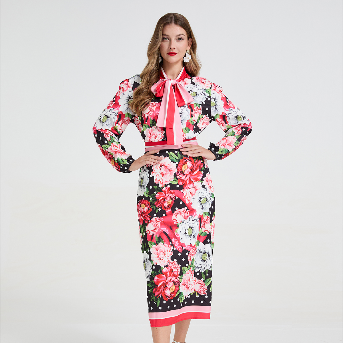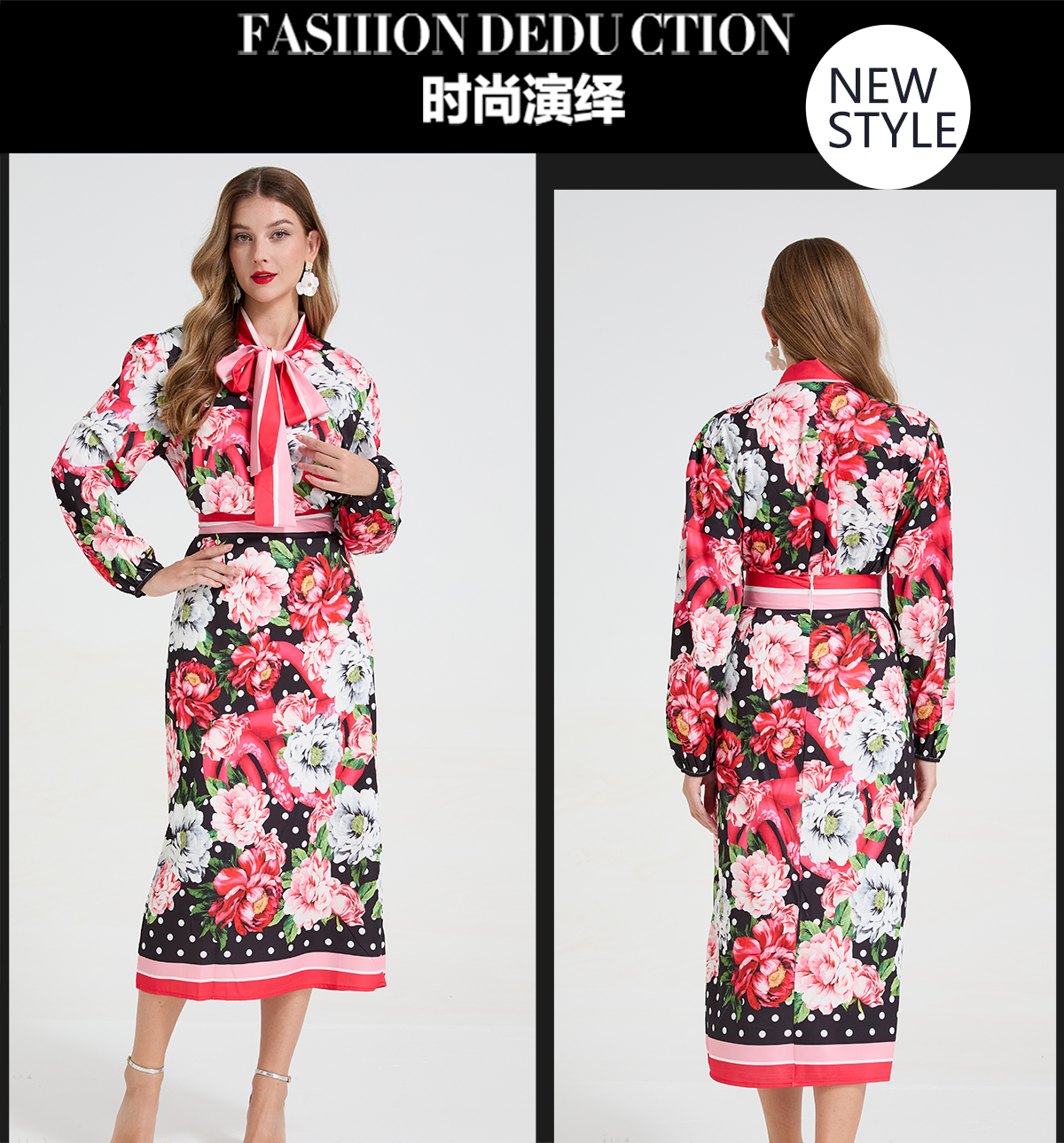 MY14186# 欧美风定位圆点大花蝴蝶结绑带衬衫+高腰半身裙两件套女裝貨源服裝批發