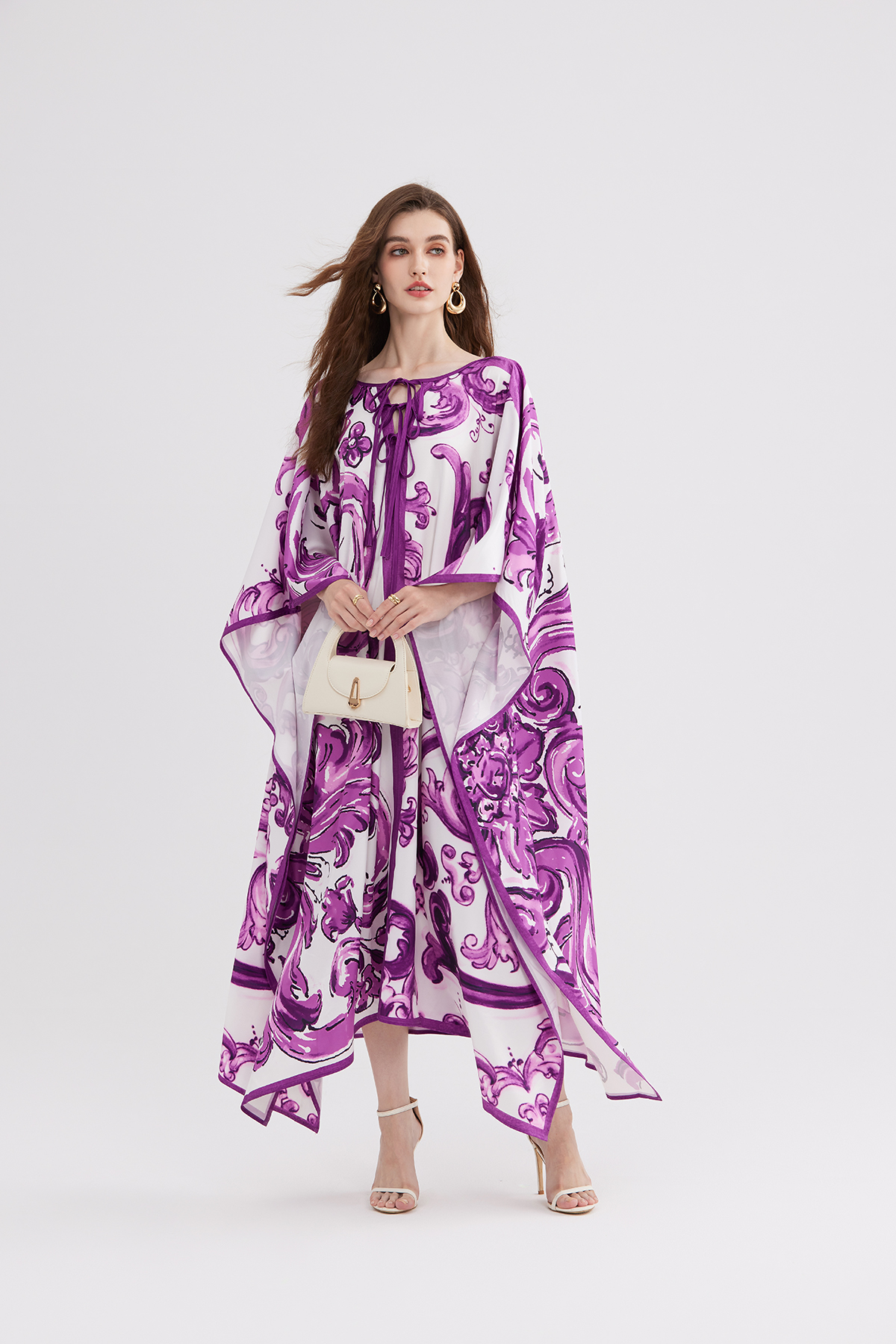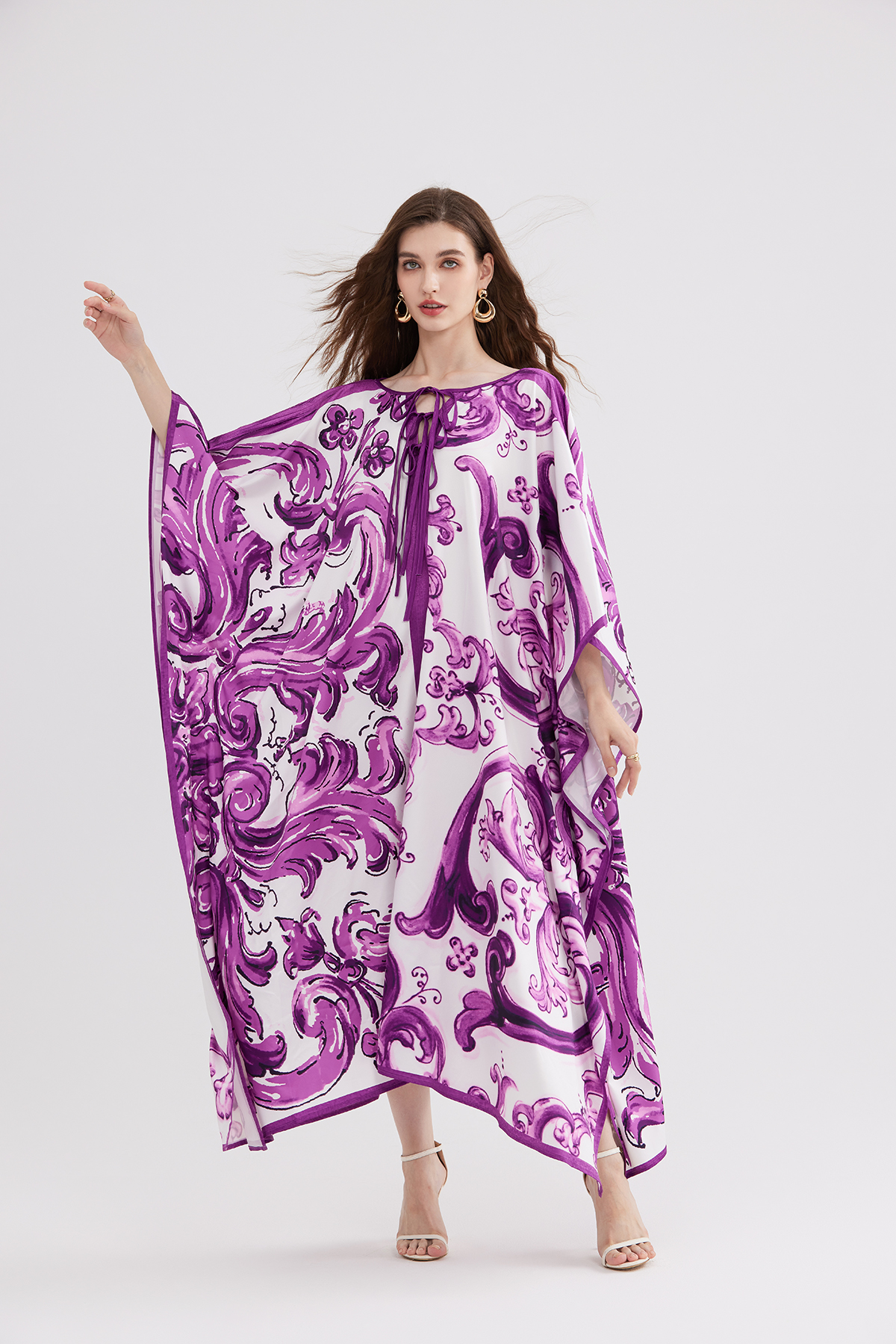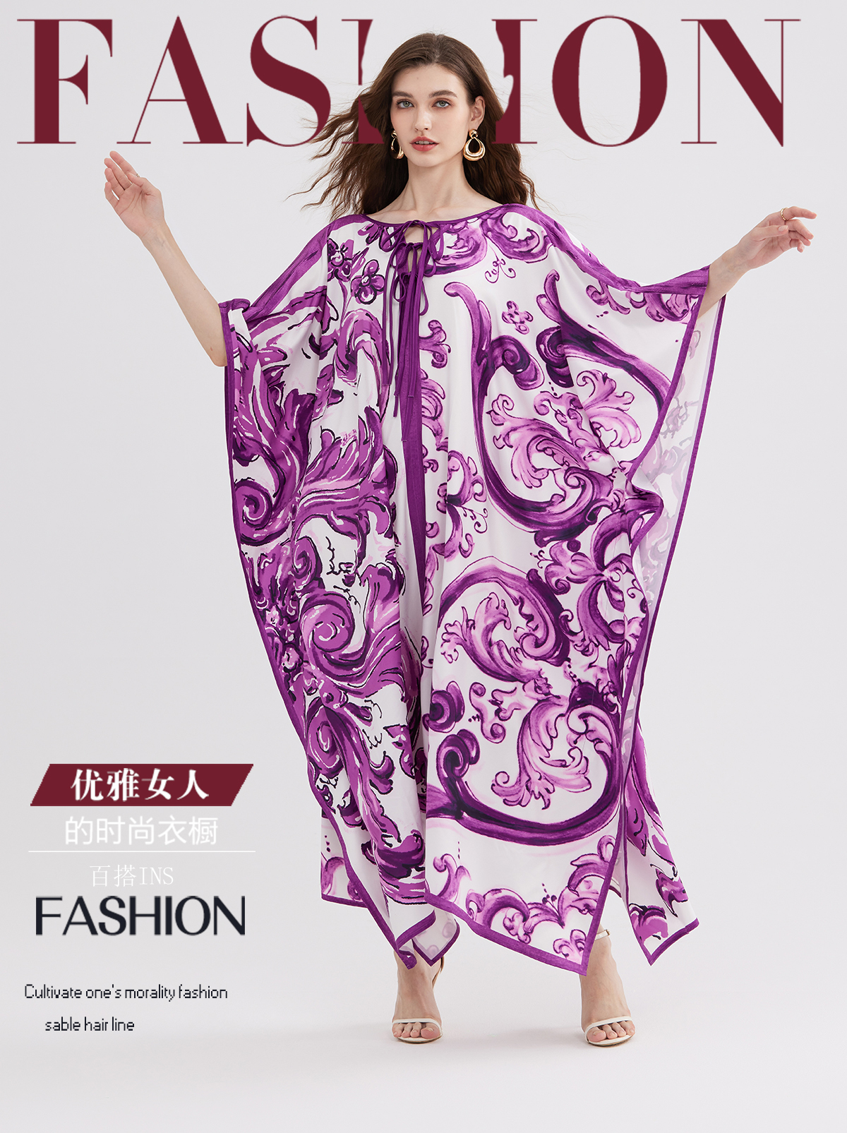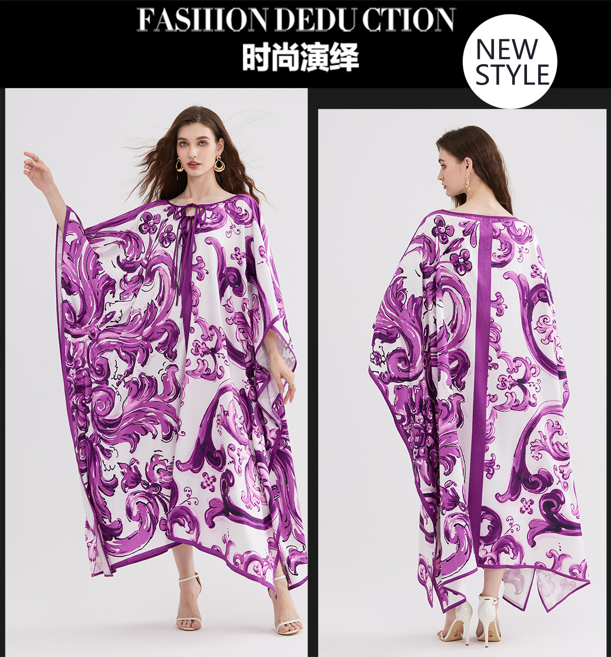 MY14188# 夏季新品紫色大花宽松连衣裙 蝴蝶结绑带蝙蝠大摆裙女裝貨源服裝批發