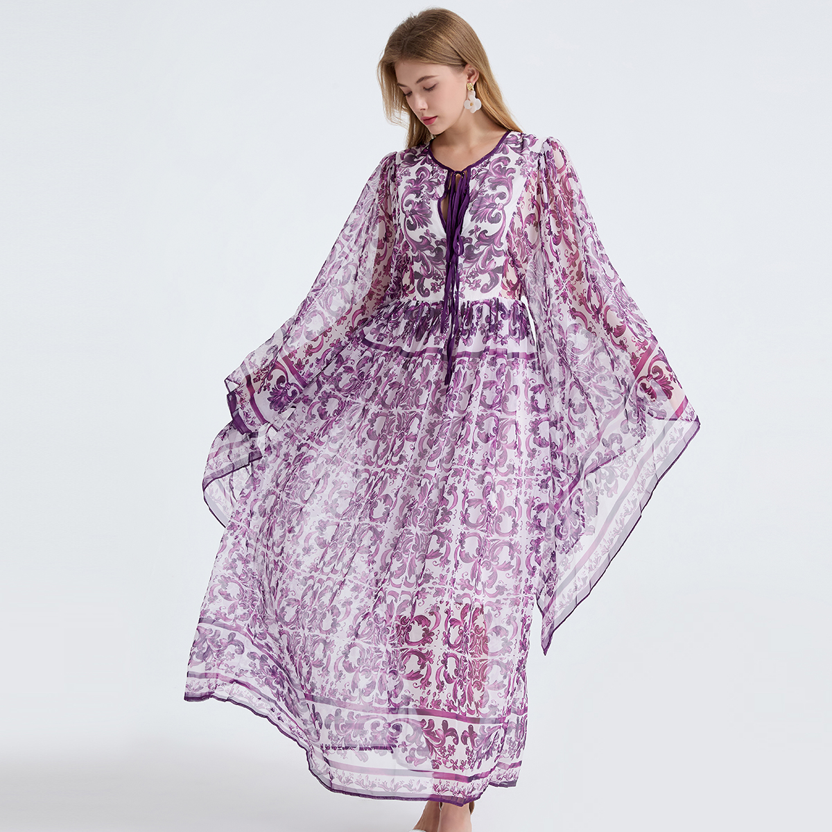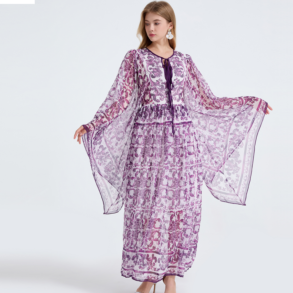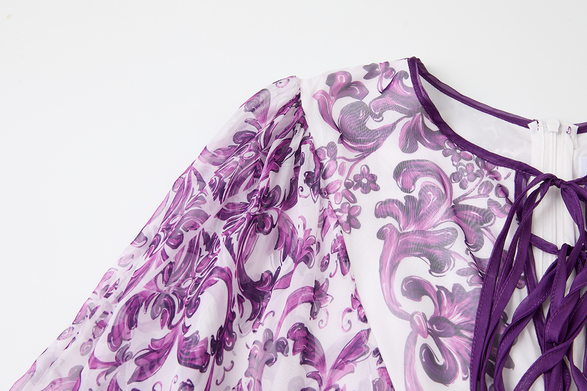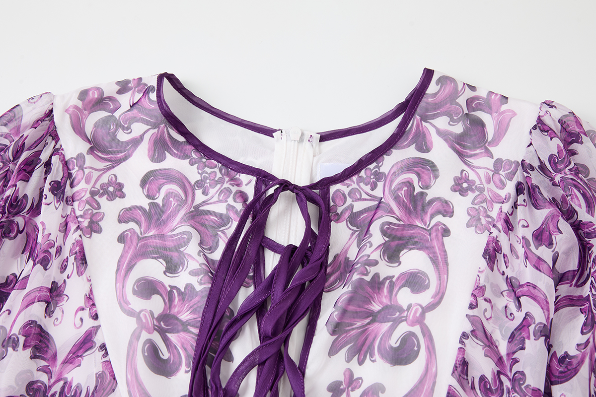 MY14190# 复古宫廷风绑带领喇叭长袖宽松大摆印花A字裙 天丝长裙女裝貨源服裝批發