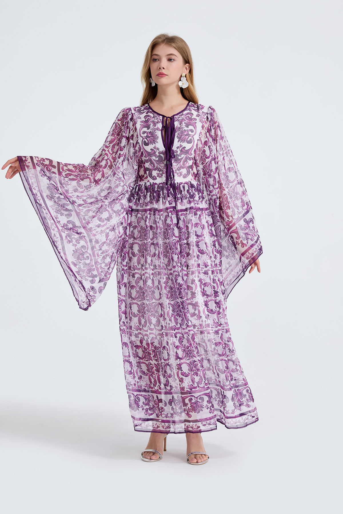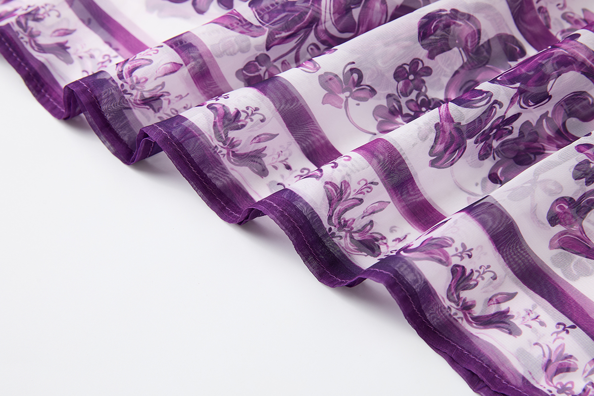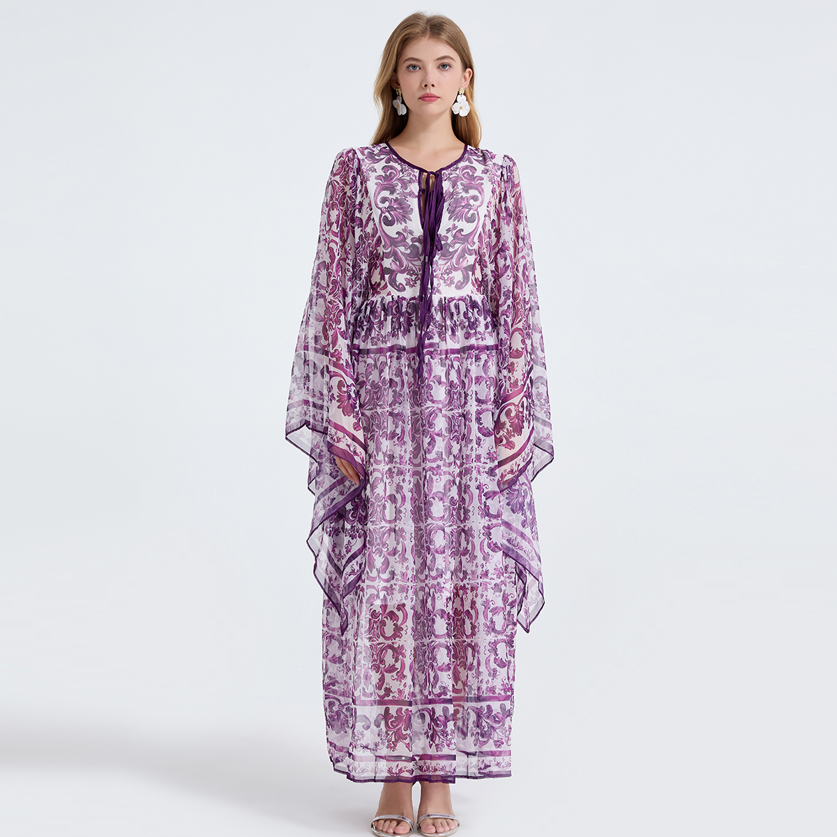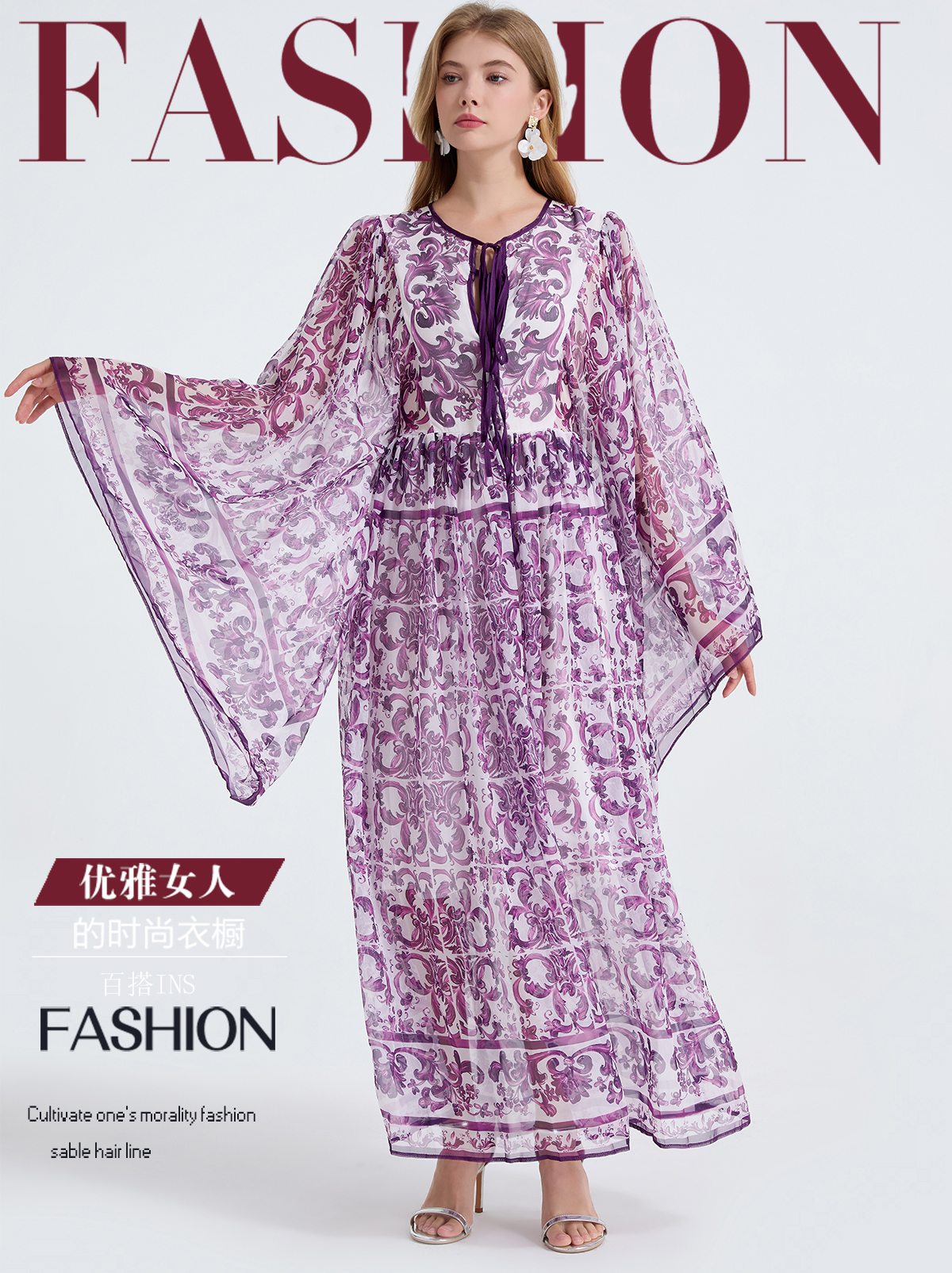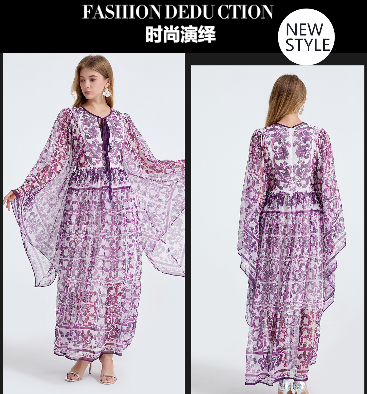 MY14190# 复古宫廷风绑带领喇叭长袖宽松大摆印花A字裙 天丝长裙女裝貨源服裝批發
