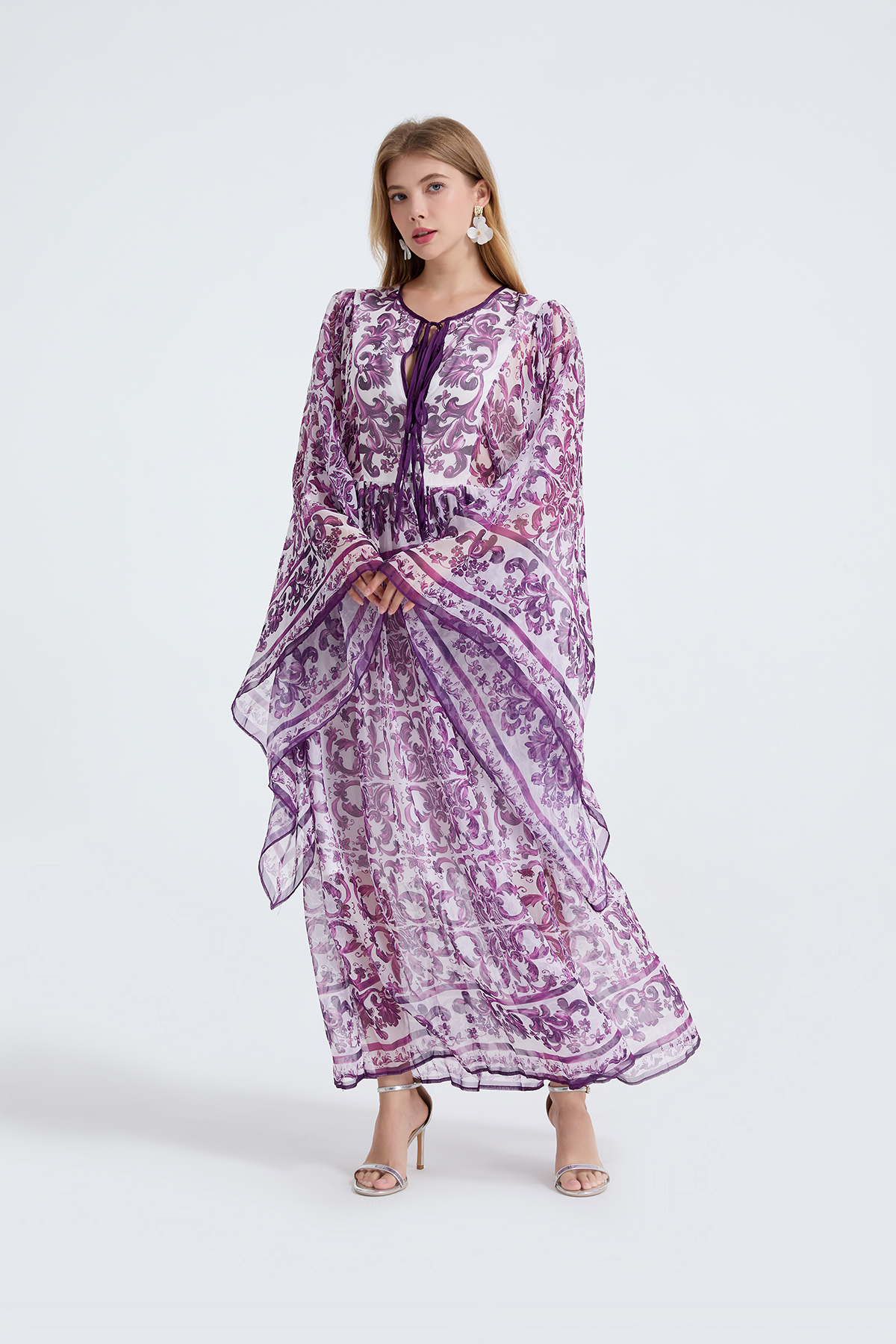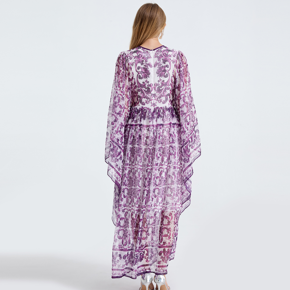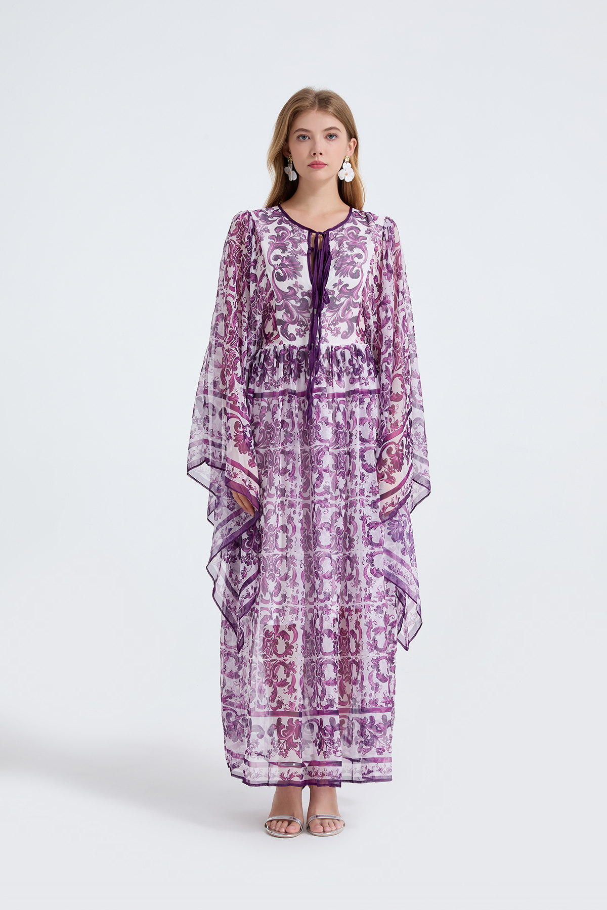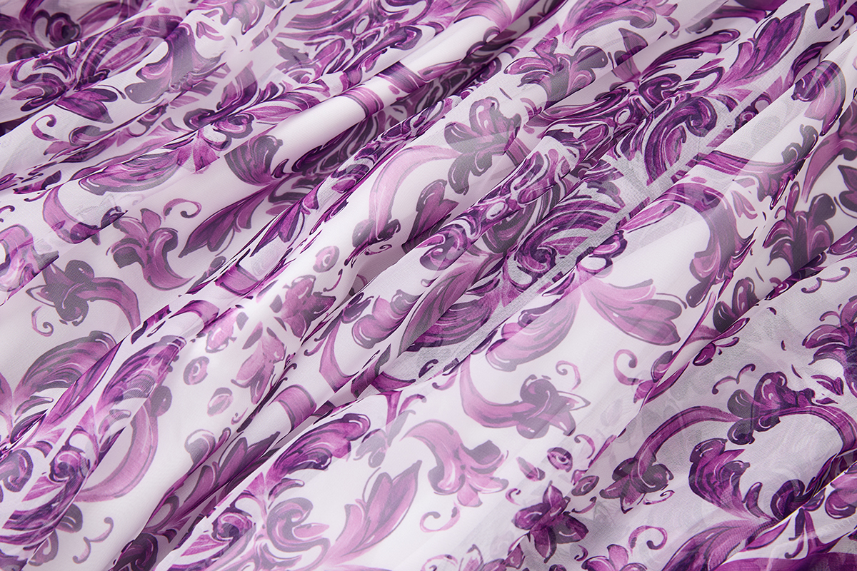 MY14190# 复古宫廷风绑带领喇叭长袖宽松大摆印花A字裙 天丝长裙女裝貨源服裝批發
