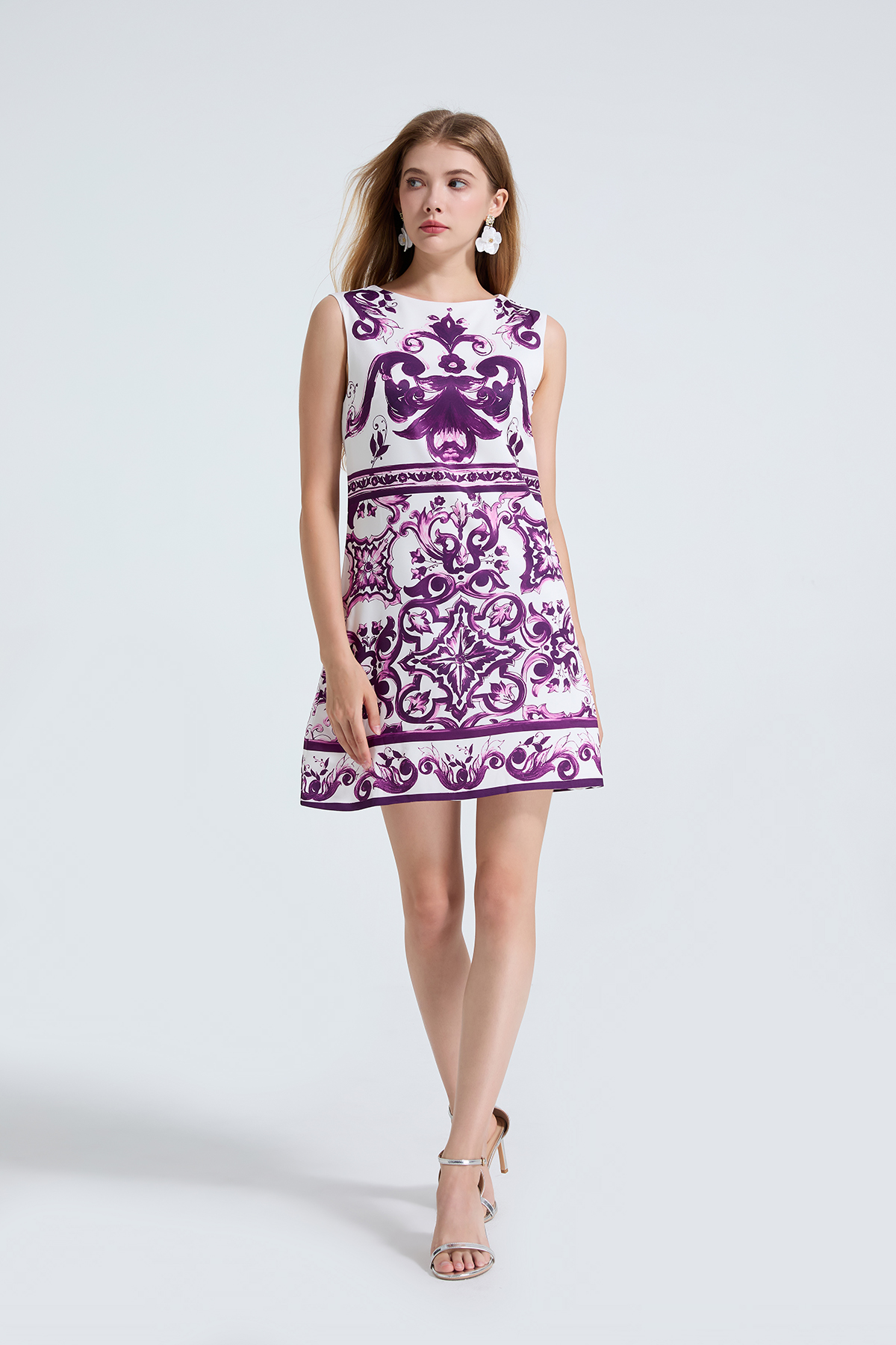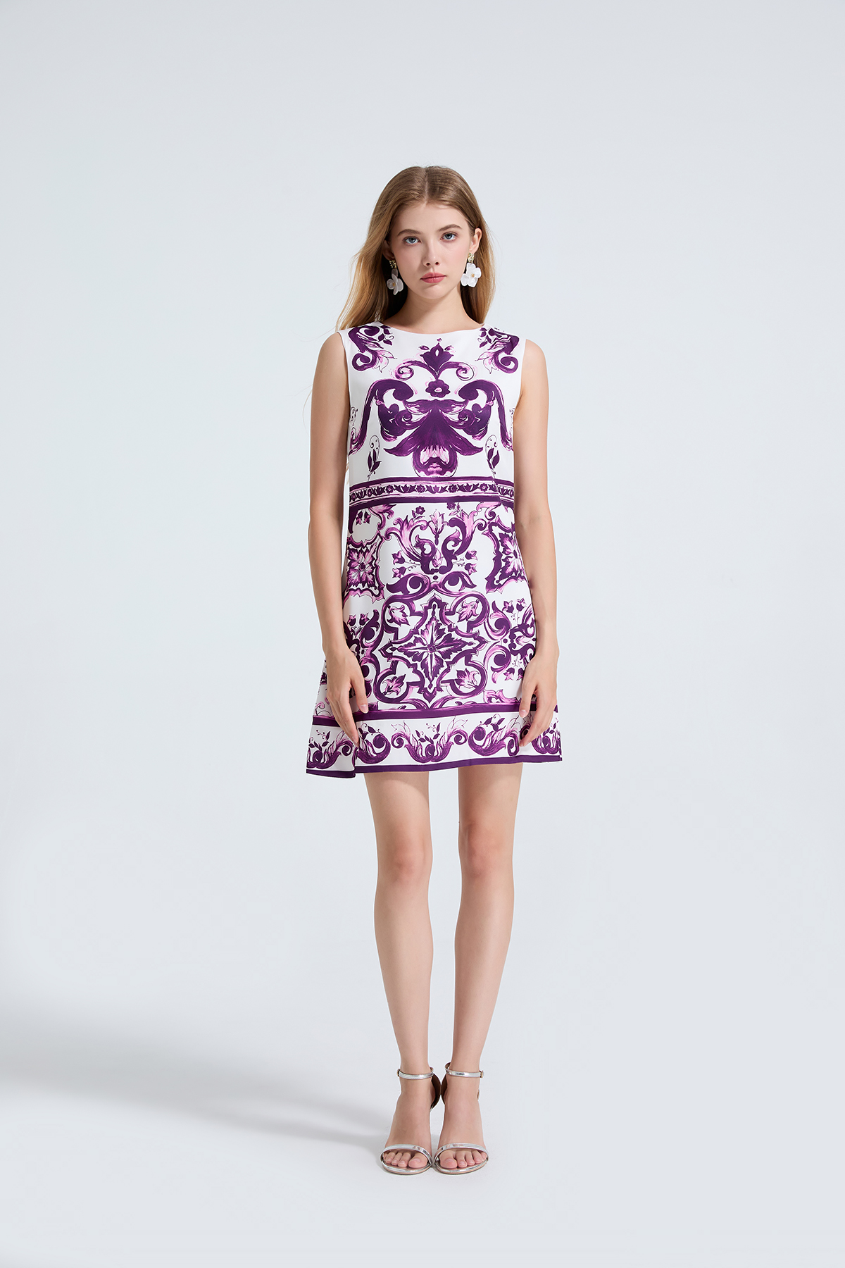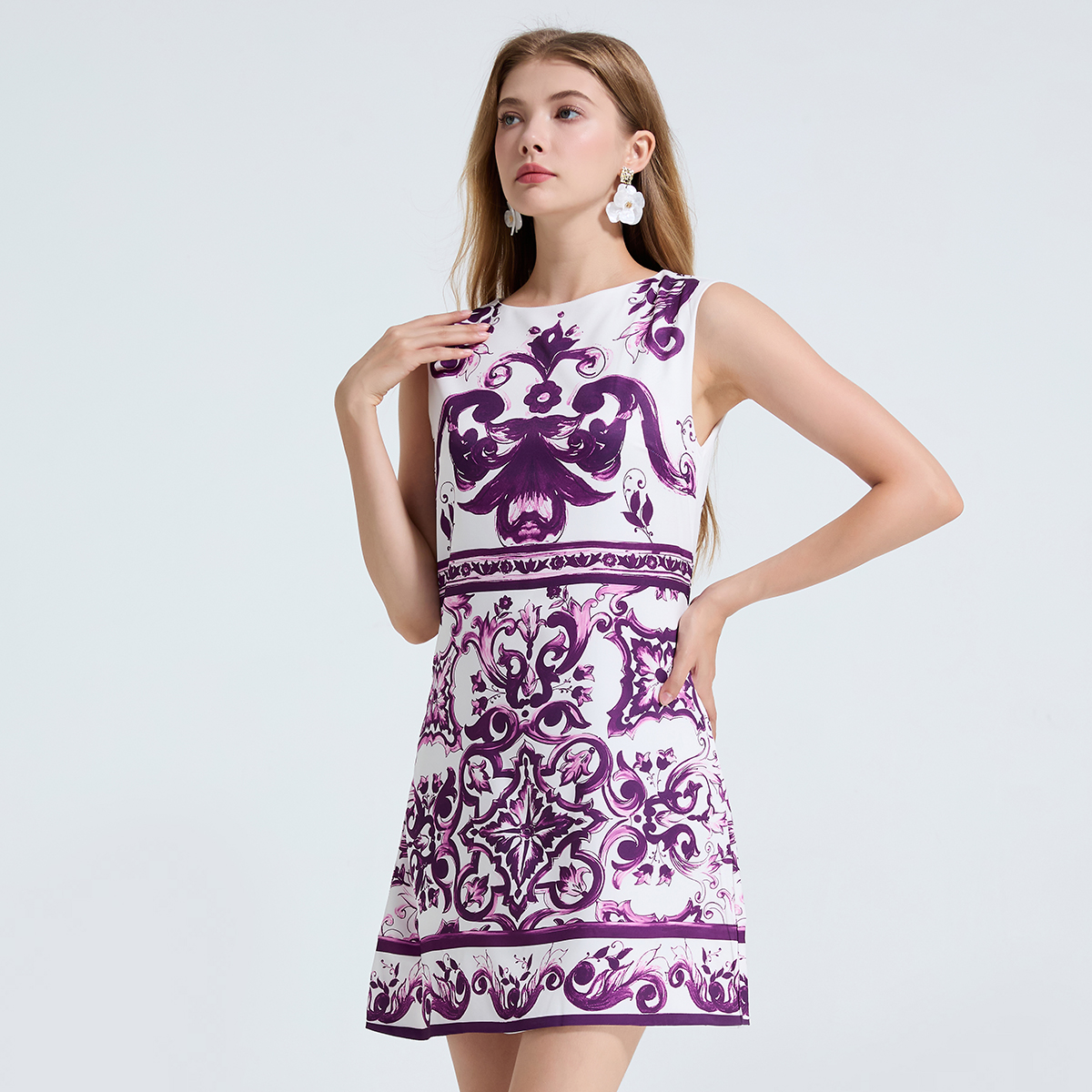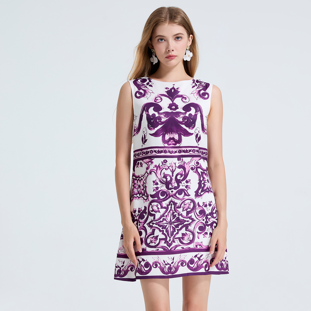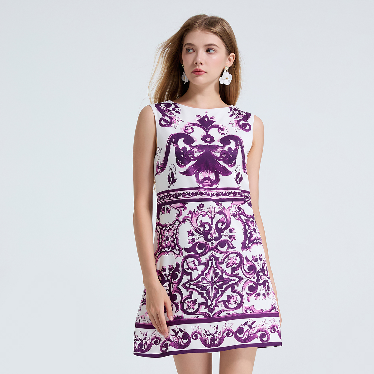 MY14191# 欧美定位印花无袖连衣裙 高腰修身圆领短裙女裝貨源服裝批發