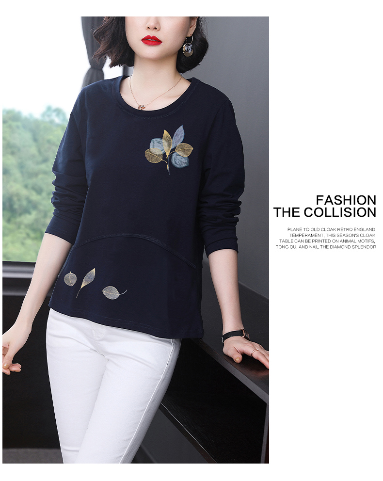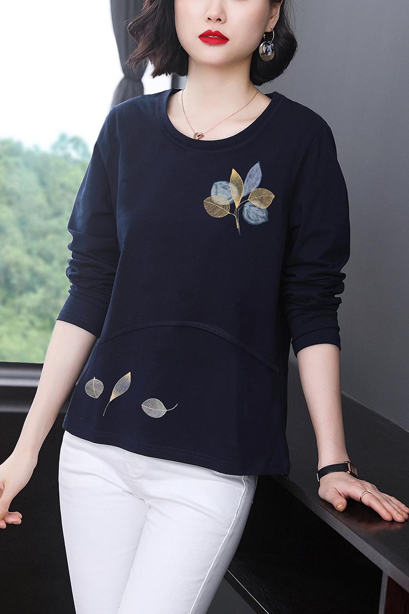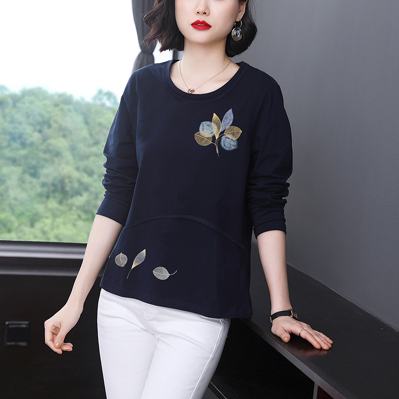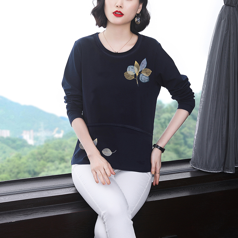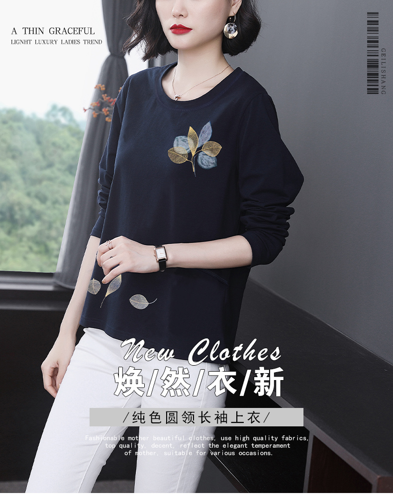 MY14200# 圆领长袖T恤新款简约刺绣大码百搭休闲套头气质上衣女裝貨源服裝批發