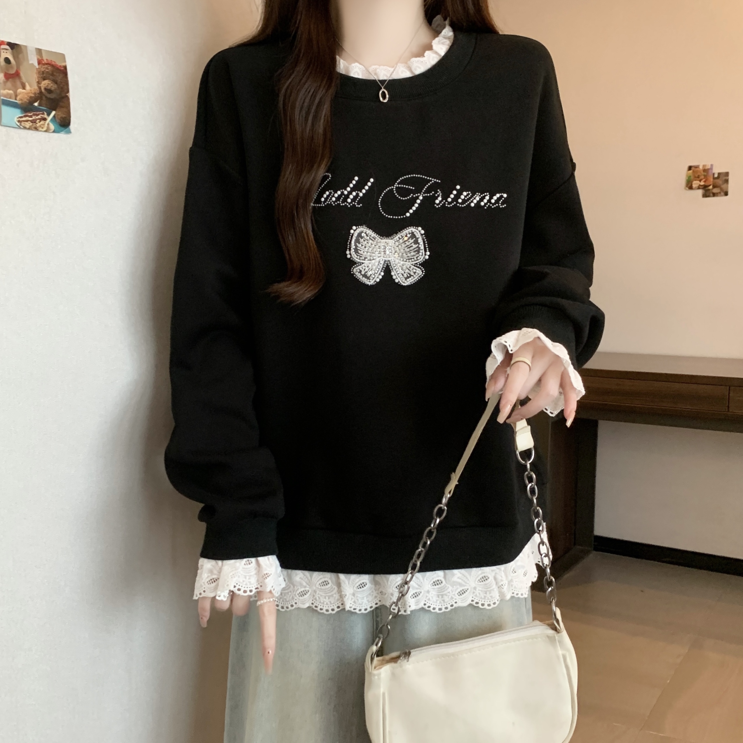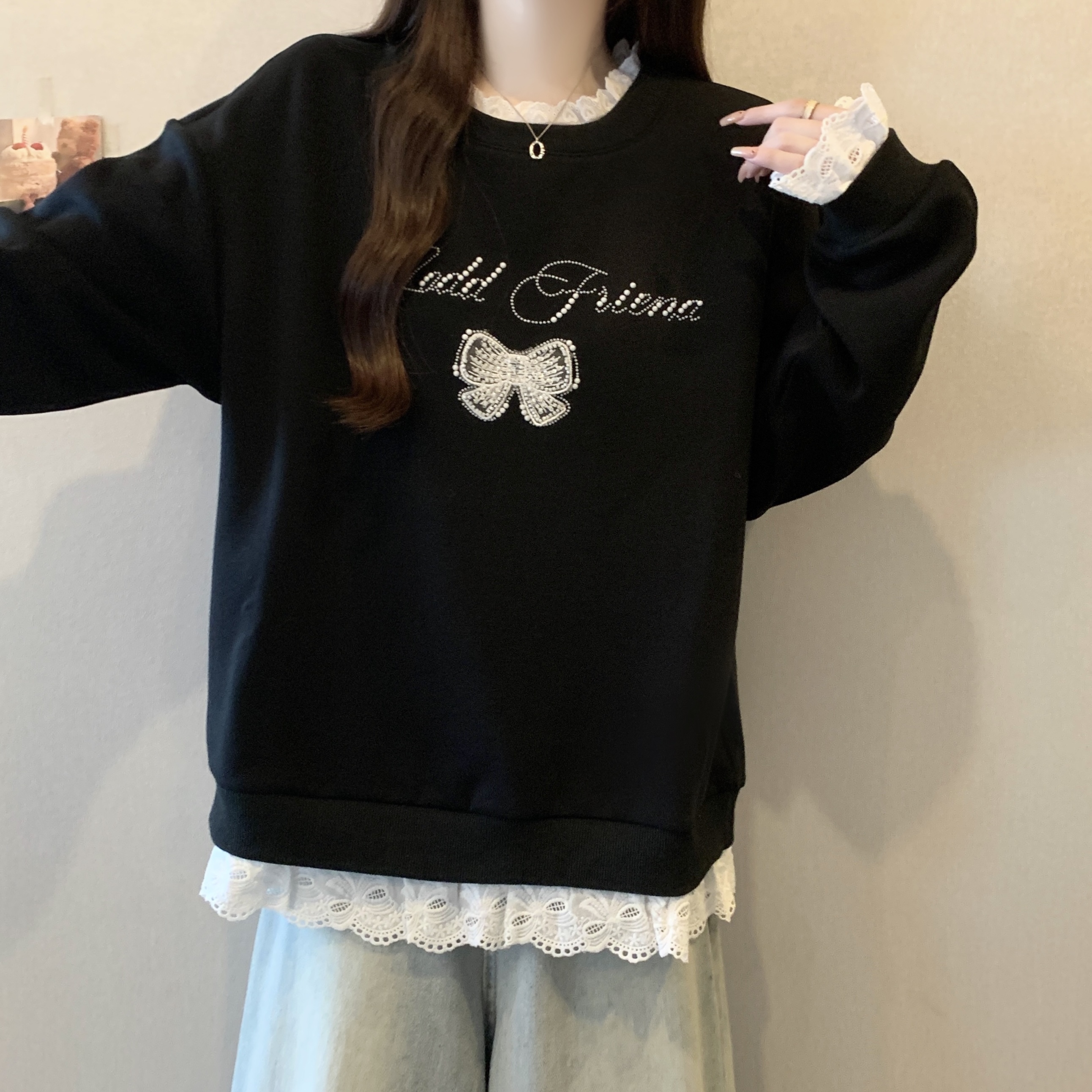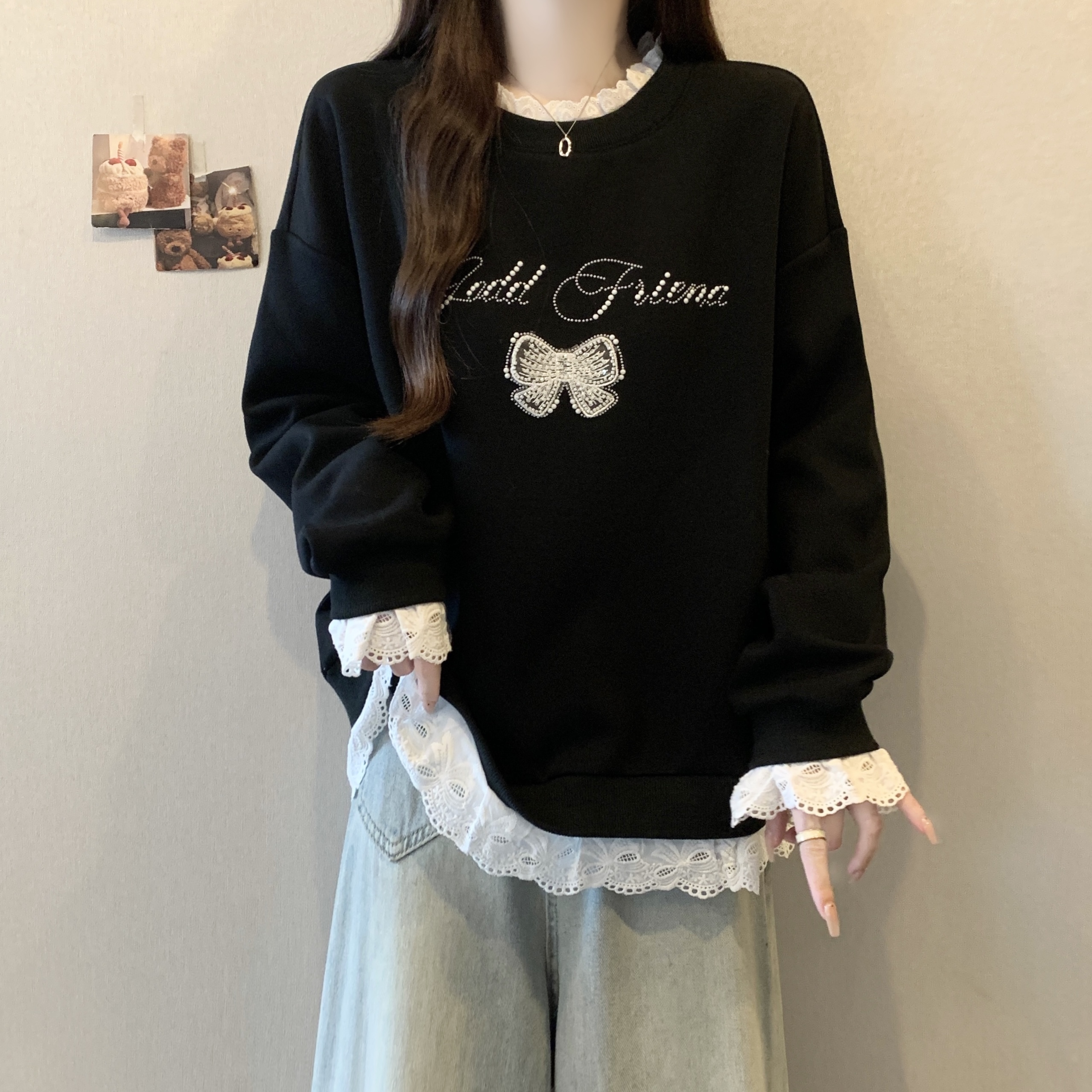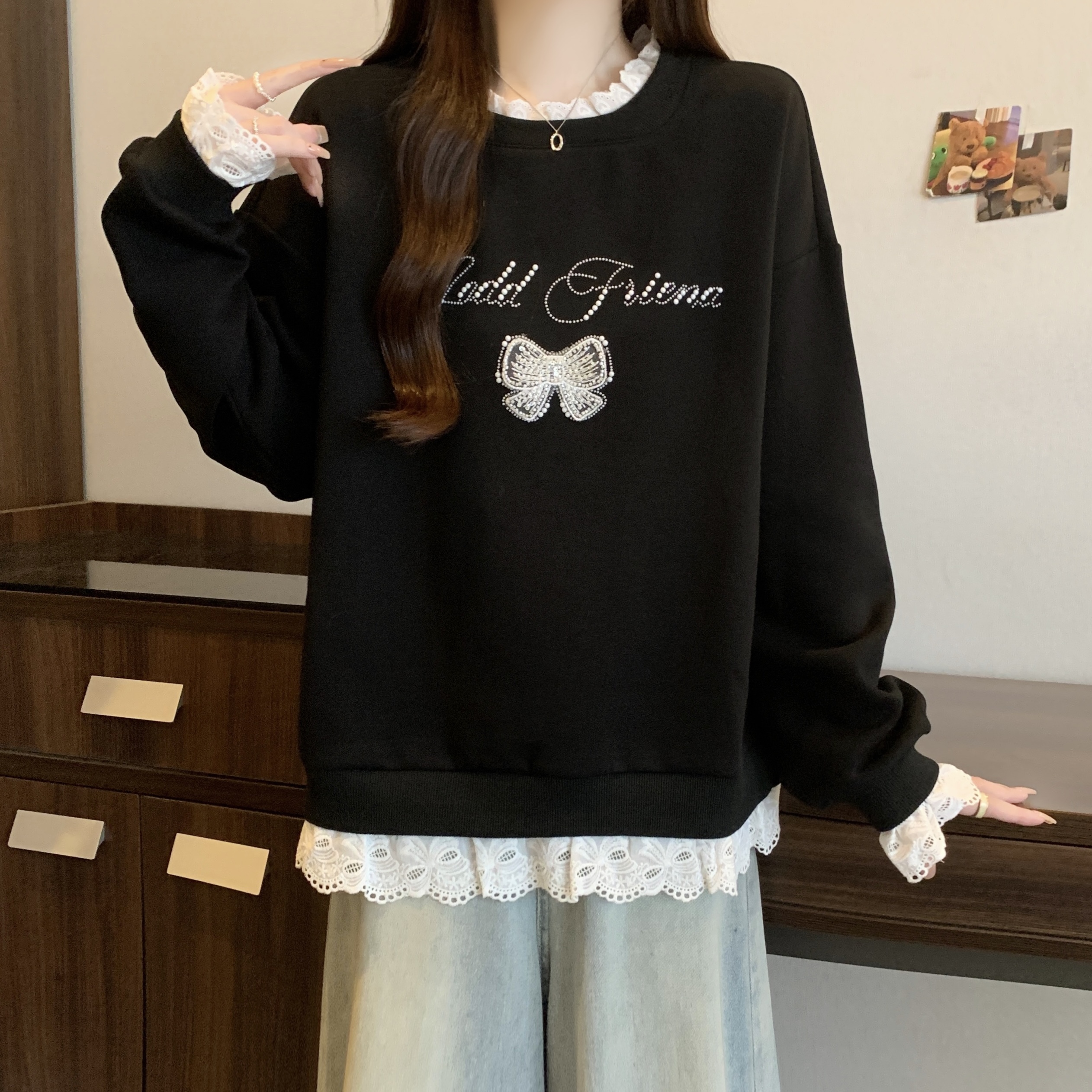 MY14203# 新款大码胖MM秋款设计感拼接蕾丝假两件宽松百搭显瘦卫衣女裝貨源服裝批發