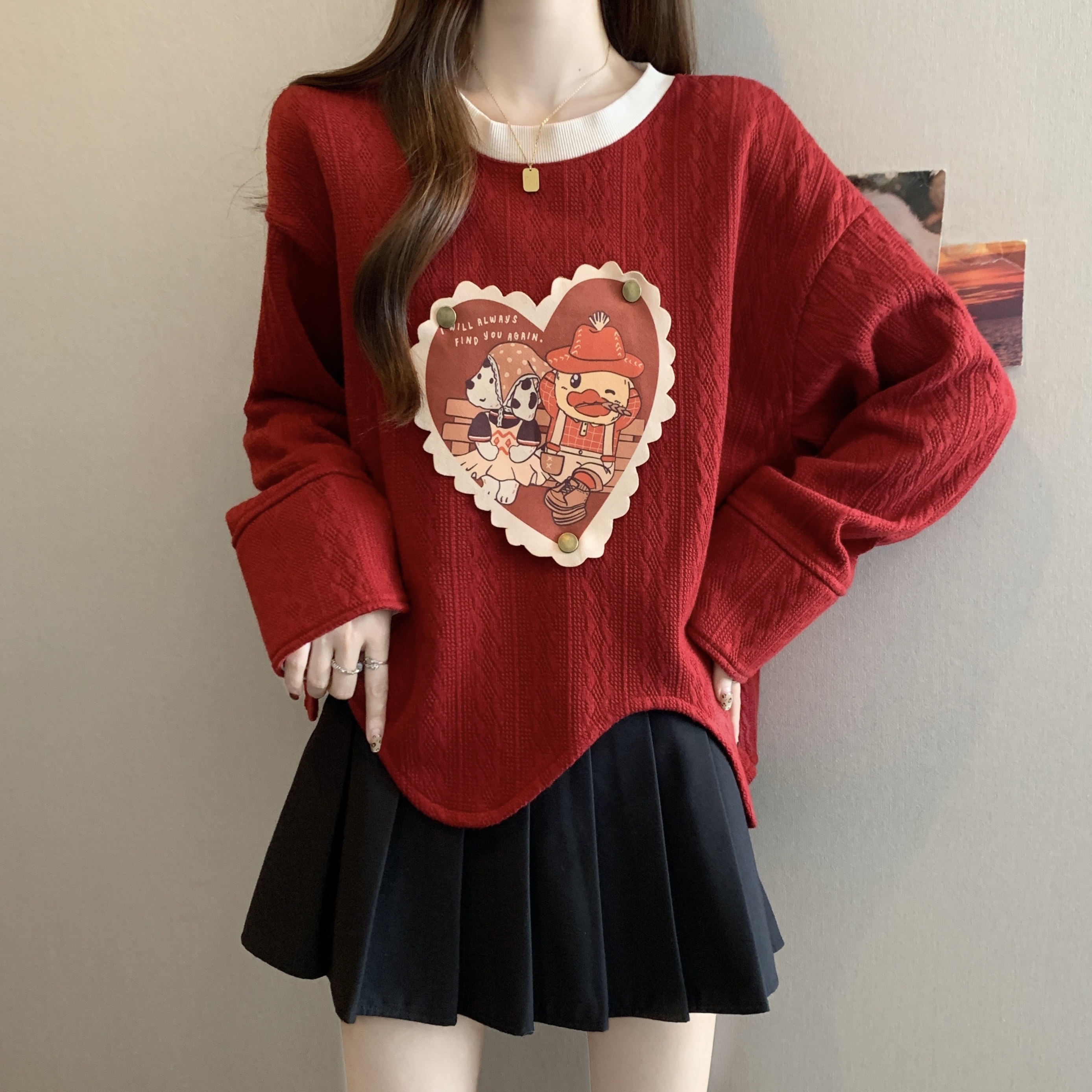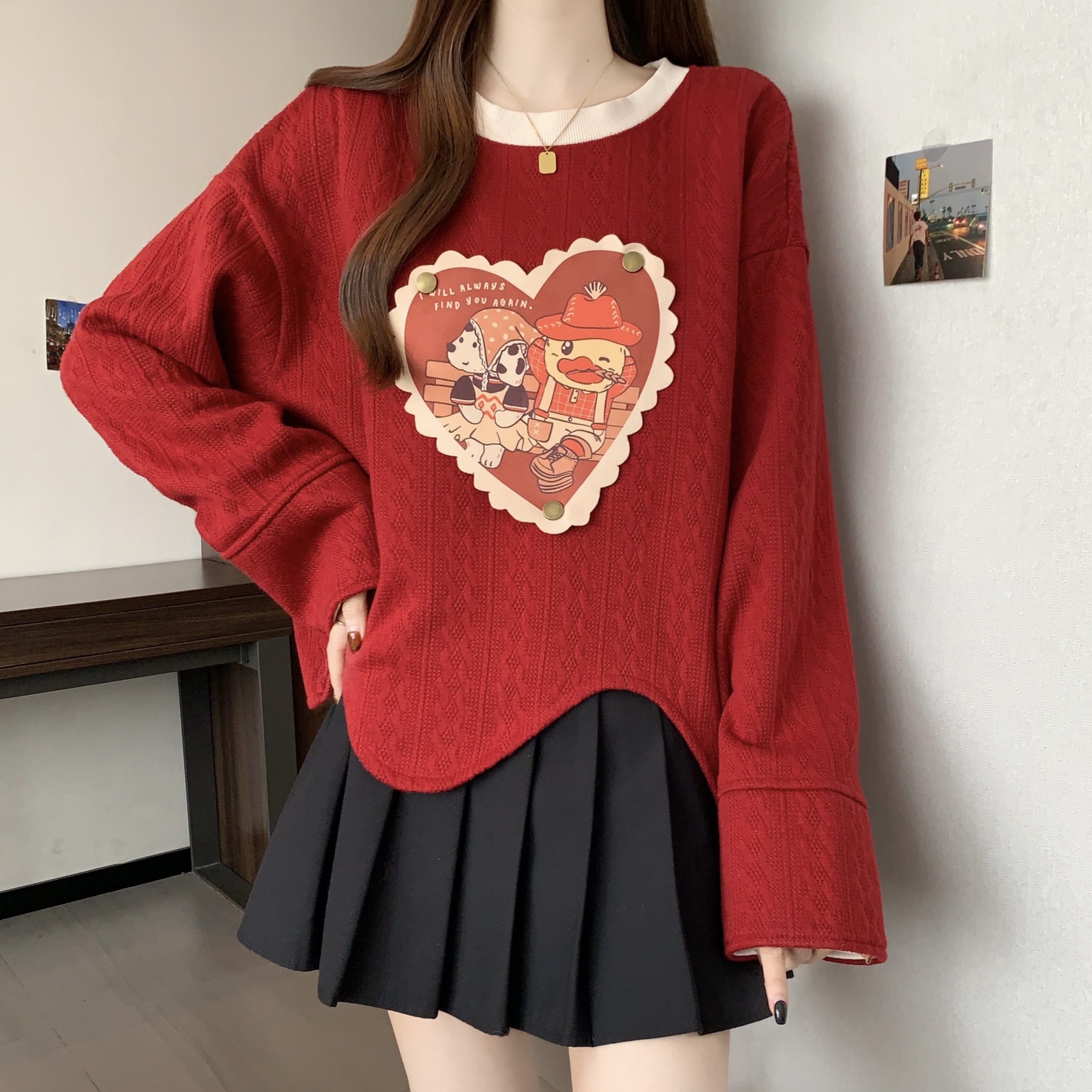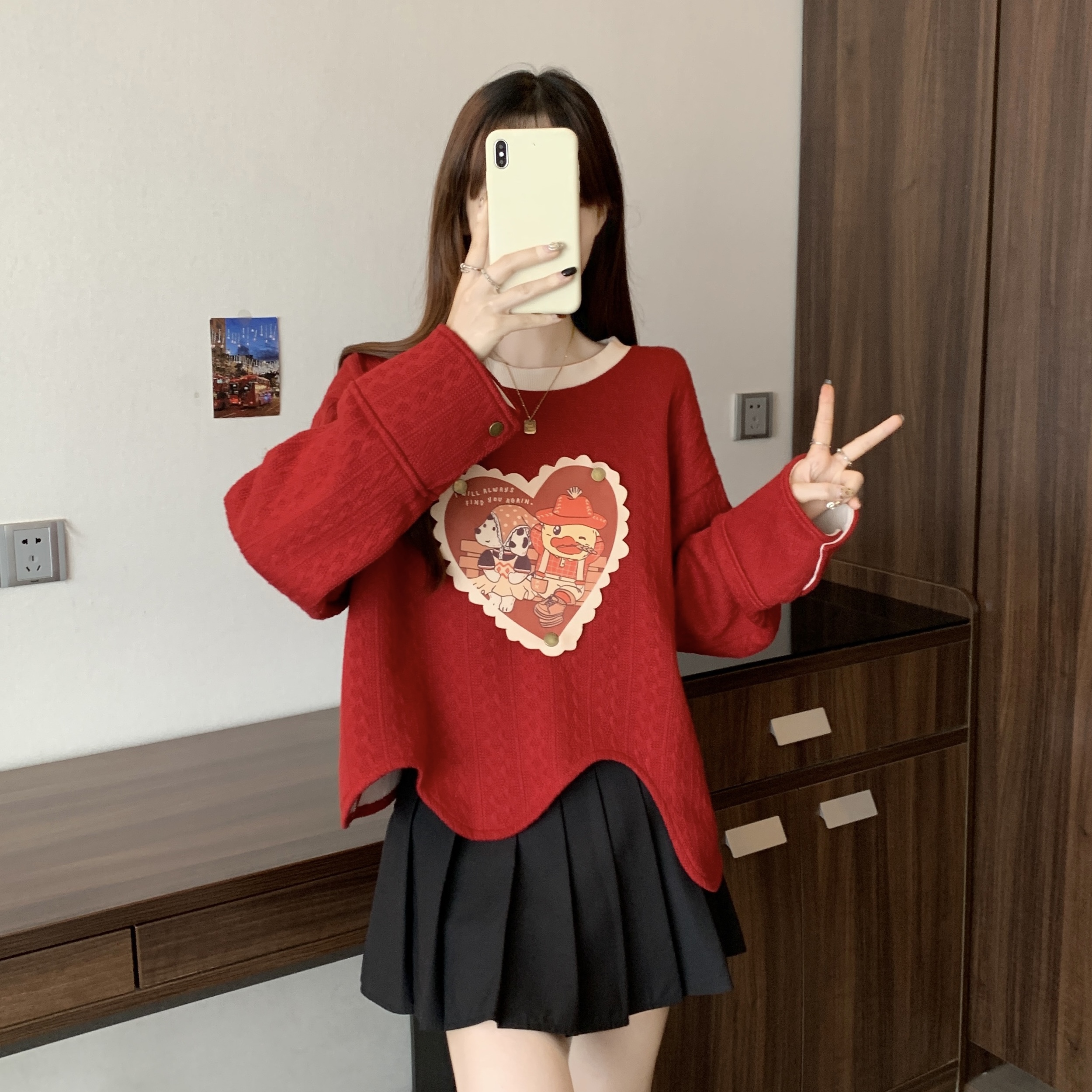 MY14206# 新款大码女装新款时尚设计感不规则爱心印花红色百搭卫衣女裝貨源服裝批發